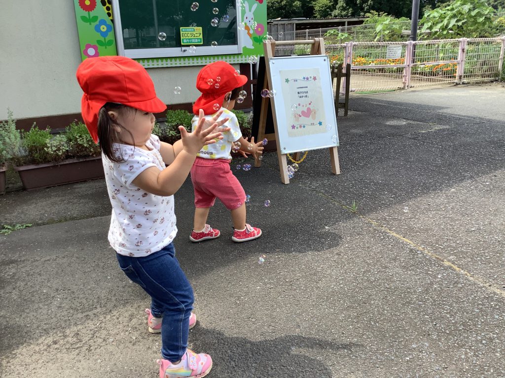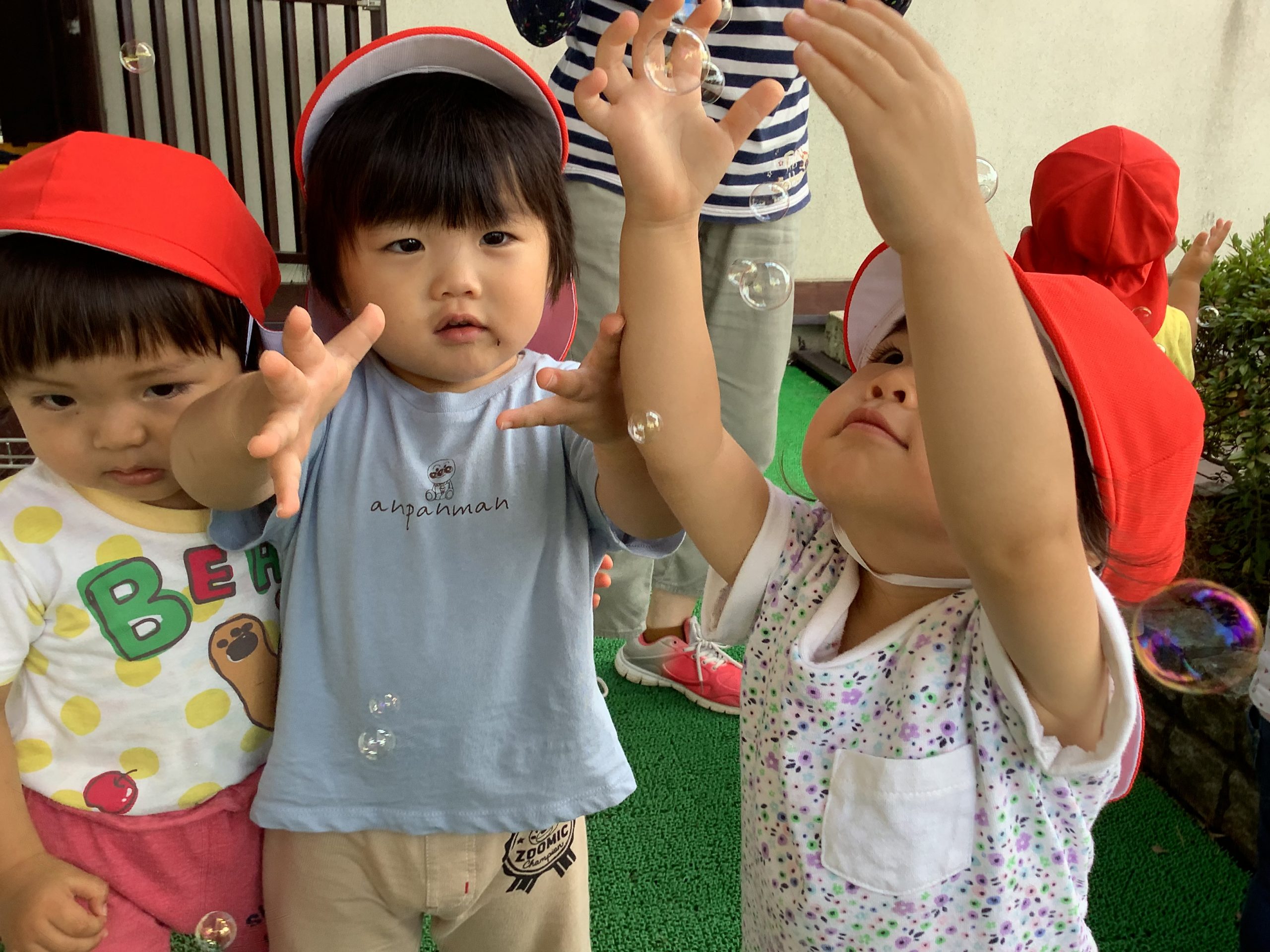 以前つき組さん(3歳児)がシャボン玉を飛ばしているのを見て喜んでいたお友だち。今日は目の前でシャボン玉を作ってみました。初めは「きゃ〜」と言って追いかけたり、シャボン玉を触ろうとしてみたりしていたのですが、触ると消えることに気づき「あれ〜?」と言いながら触りはじめました。次々と触ると消えてしまうので、「なくなっちゃった」「ちゃった」とお友だちと笑い合う姿がありました。