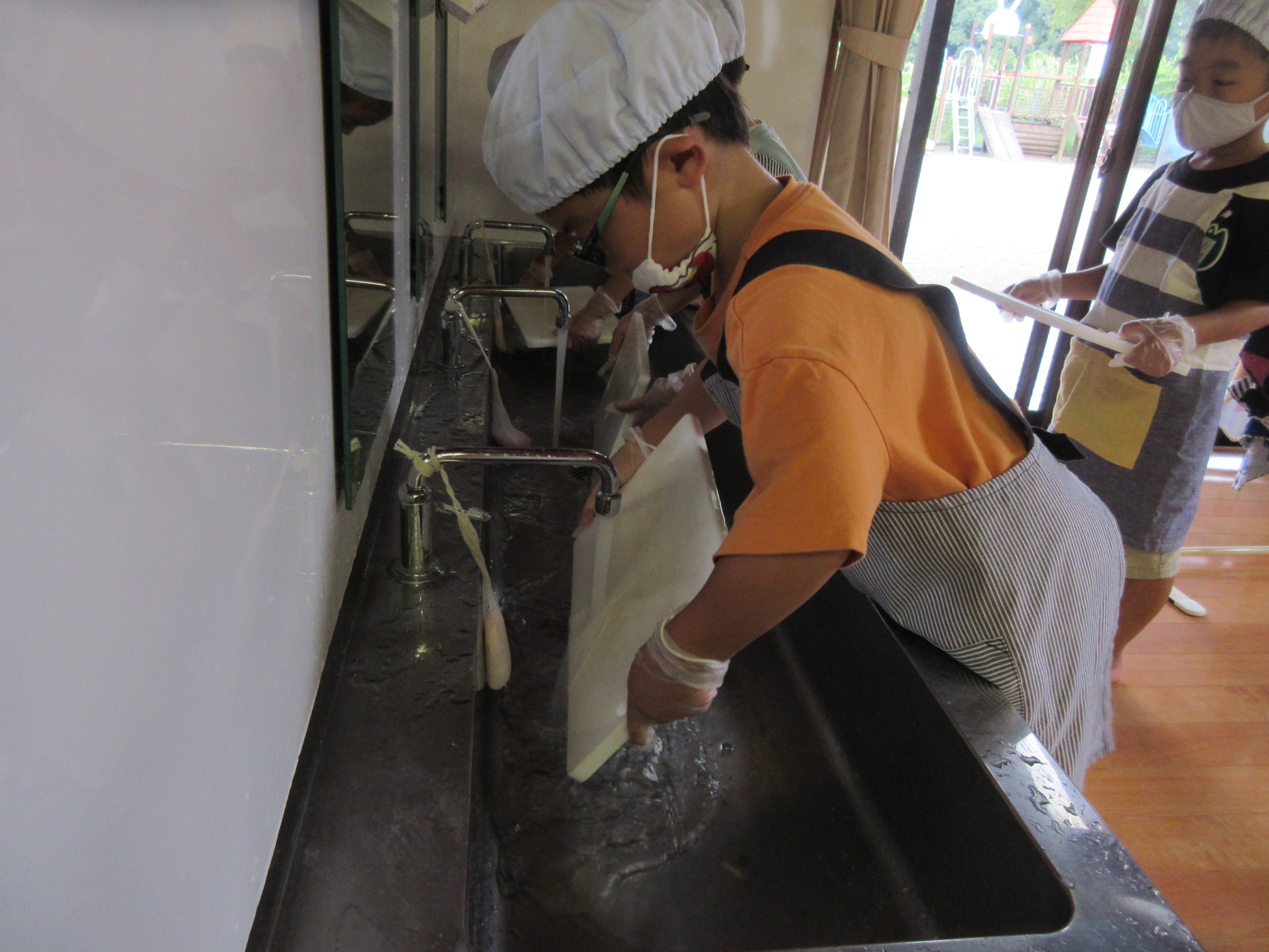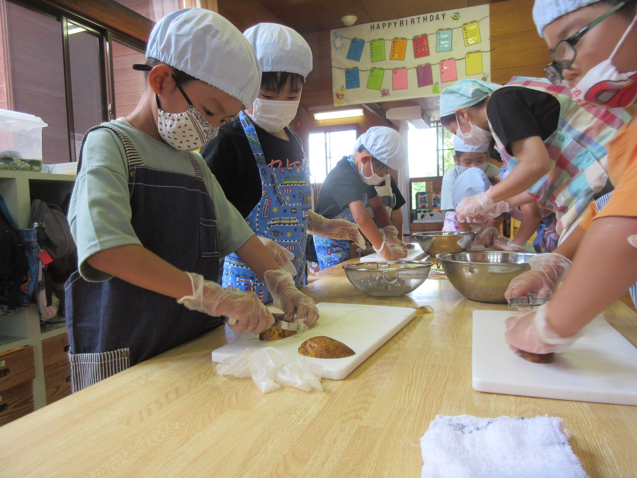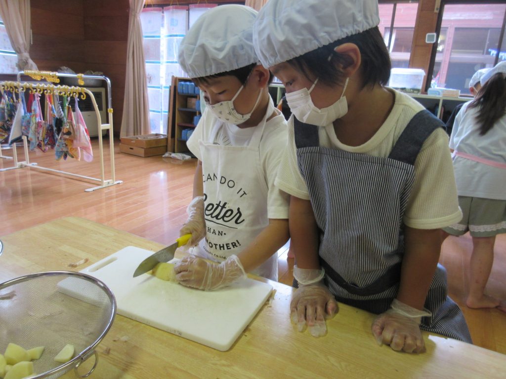 初めてのクッキング(5歳児) 2021 7/30 ニュース 年長さんが育てたジャガイモで初めてクッキングをしました。ピーラーでの皮むきや包丁を使って一回切りをしました。「猫の手でジャガイモを押さえる」「包丁を人にむけないように切る」と約束を友だちと確かめ合いながら進めていました。後片付けを最後まで子どもたちが行い、切り終わったジャガイモを給食室へ…給食メニューのカレーの中に入れてもらいました。「カレーのジャガイモおいしい!!」と自分たちがクッキングした給食は格別だったようです。 ニュース URLをコピーしました! シャボン玉遊び(1歳児) シャボン玉遊び(0、1歳児) コメント コメントする コメントをキャンセルコメント ※ 名前 ※ メール ※ サイト 次回のコメントで使用するためブラウザーに自分の名前、メールアドレス、サイトを保存する。 上に表示された文字を入力してください。 Δ