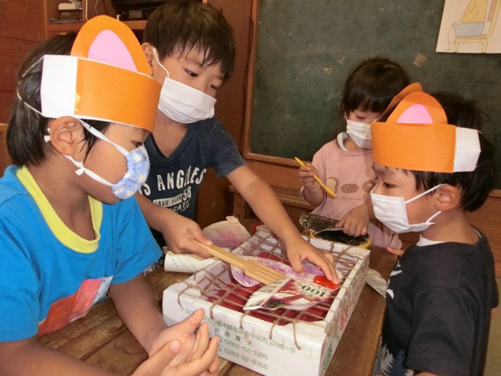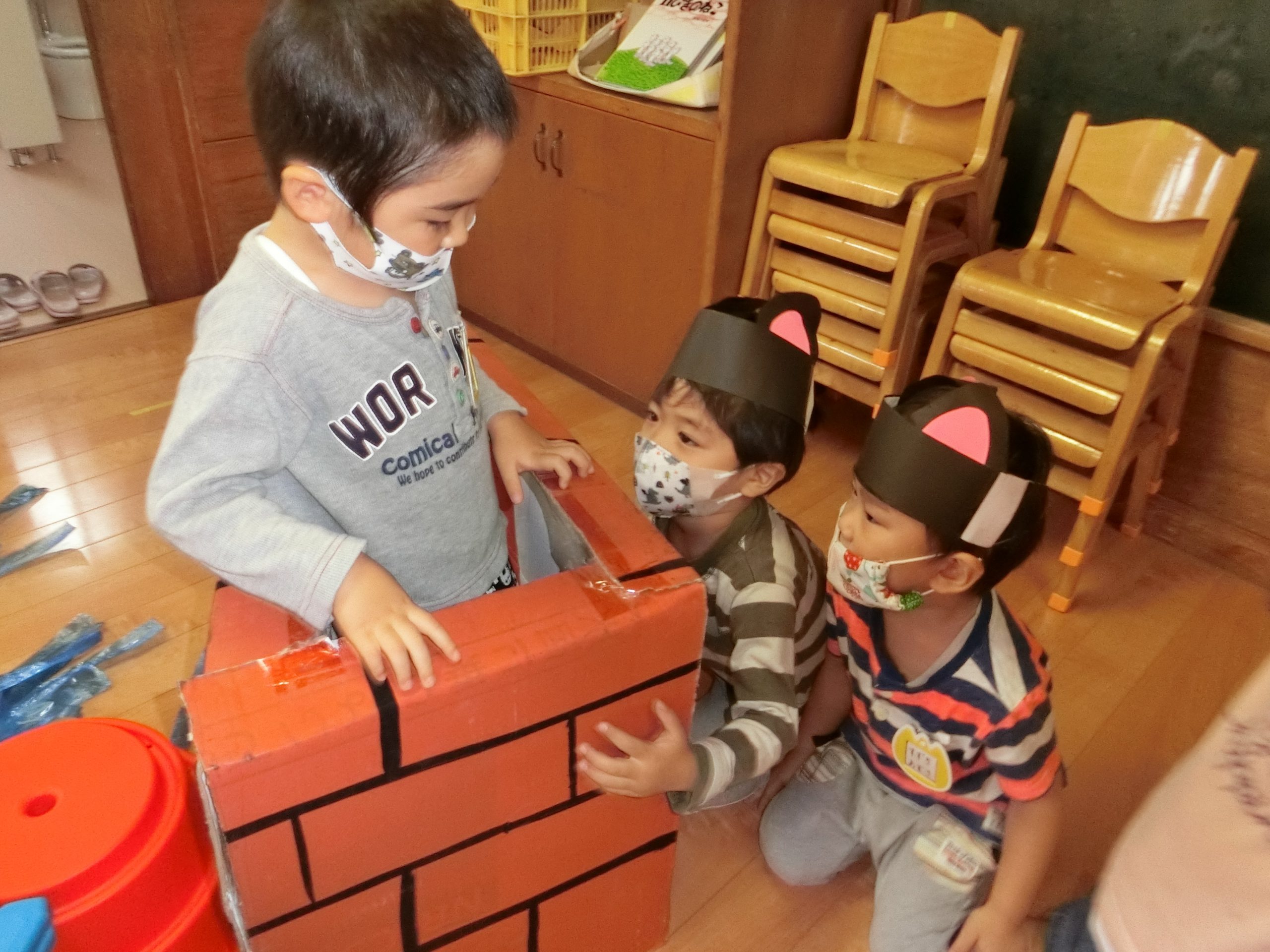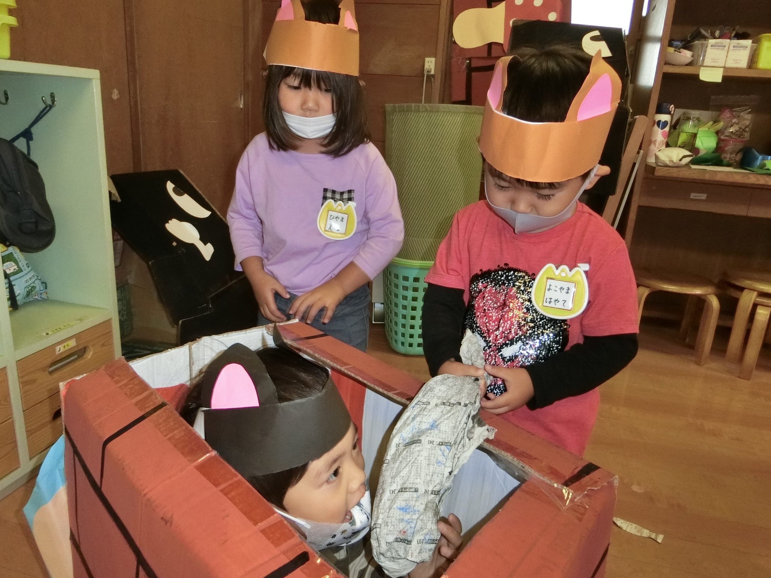 11匹のねこごっこ遊び(3歳児) 2021 9/08 ニュース つき組さんが夢中になって見ている大好きな絵本(11匹のねこ)の世界に入り込み、ねこになりきってごっこ遊びが展開されています!海に見立てたところに魚を泳がせ、釣った魚を食べたり、望遠鏡を持ち島をのぞいたり、海のトンネルをくぐったりと子どもたち同士で遊びが盛り上がっています。 向こうに何かいるぞ!みんな見て~!! 魚釣ってきたよ!たべていいよ~! ねこのお家は一人しか入れないから順番ね~!! 魚を釣ったからみんなで焼いて食べよ~ね!とバーベキューが始まりました。 ニュース URLをコピーしました! 夕涼み会(5歳児) 稲刈り(5歳児) コメント コメントする コメントをキャンセルコメント ※ 名前 ※ メール ※ サイト 次回のコメントで使用するためブラウザーに自分の名前、メールアドレス、サイトを保存する。 上に表示された文字を入力してください。 Δ