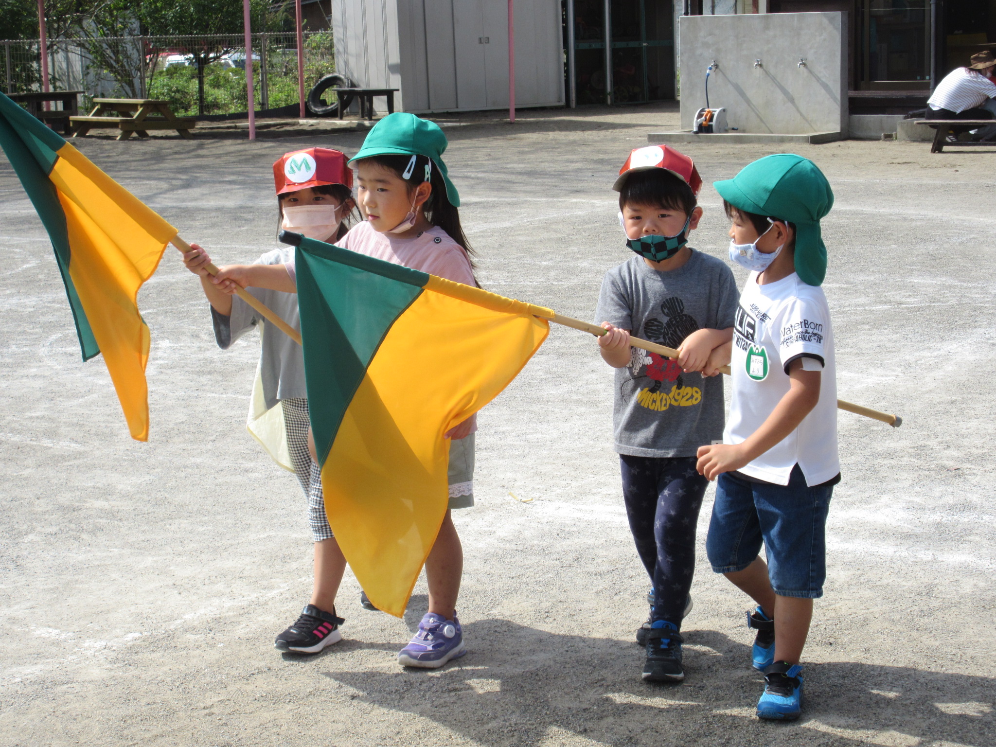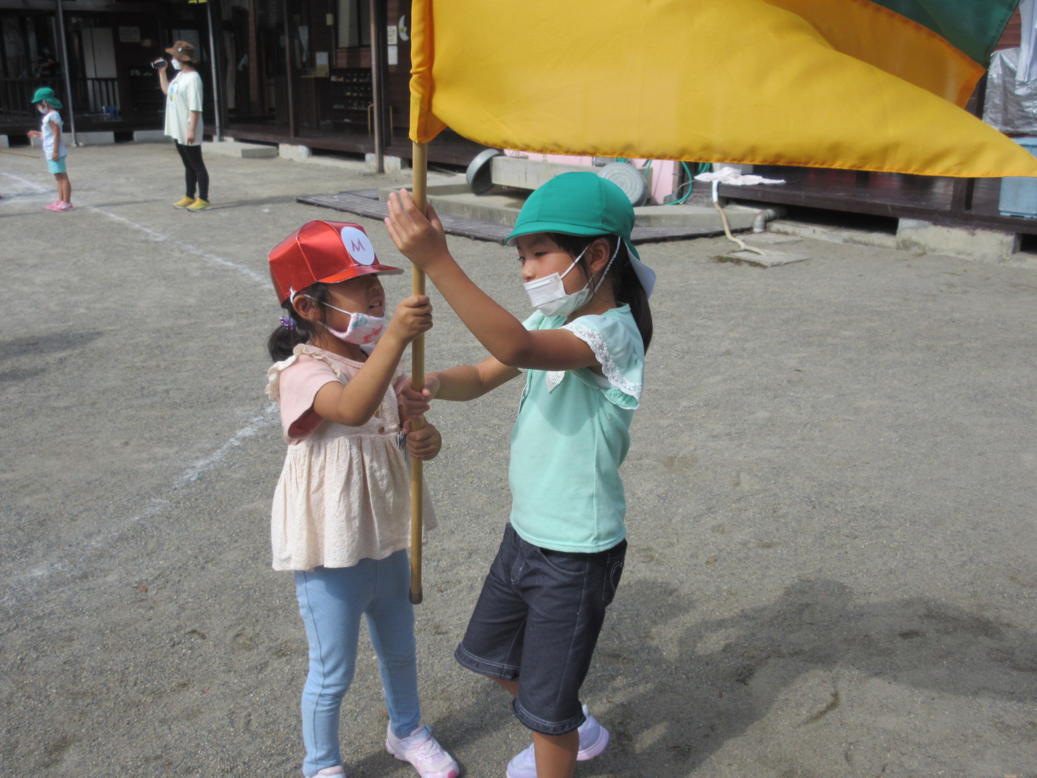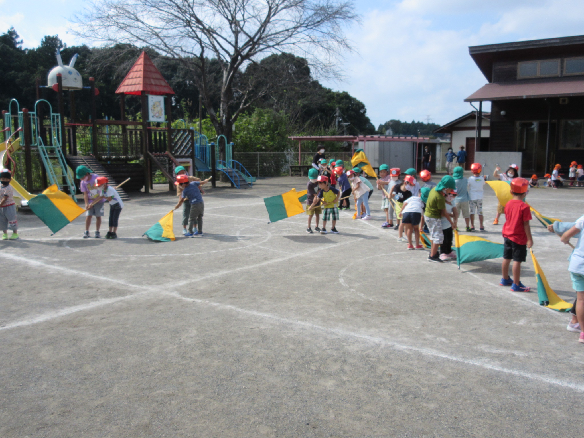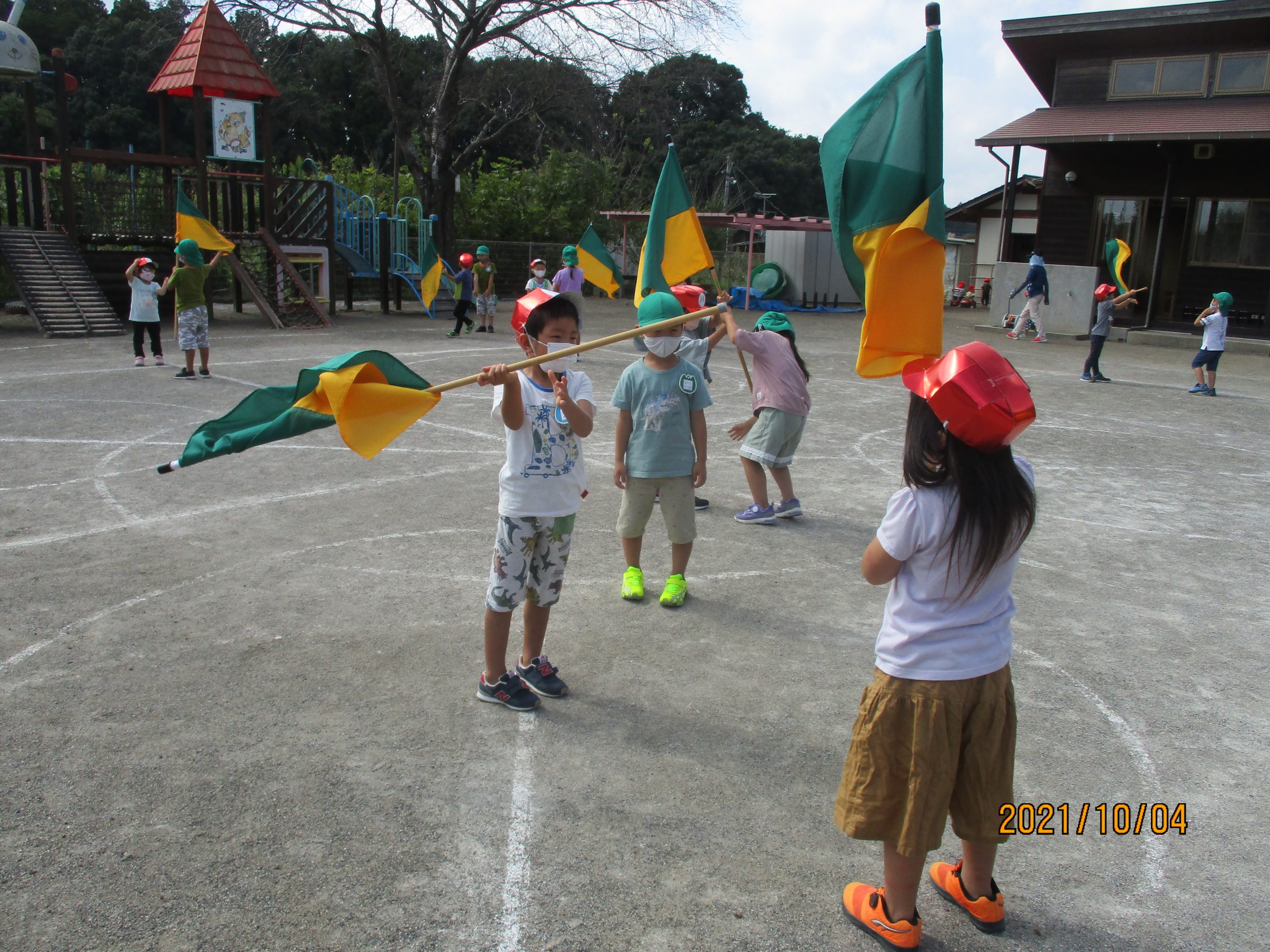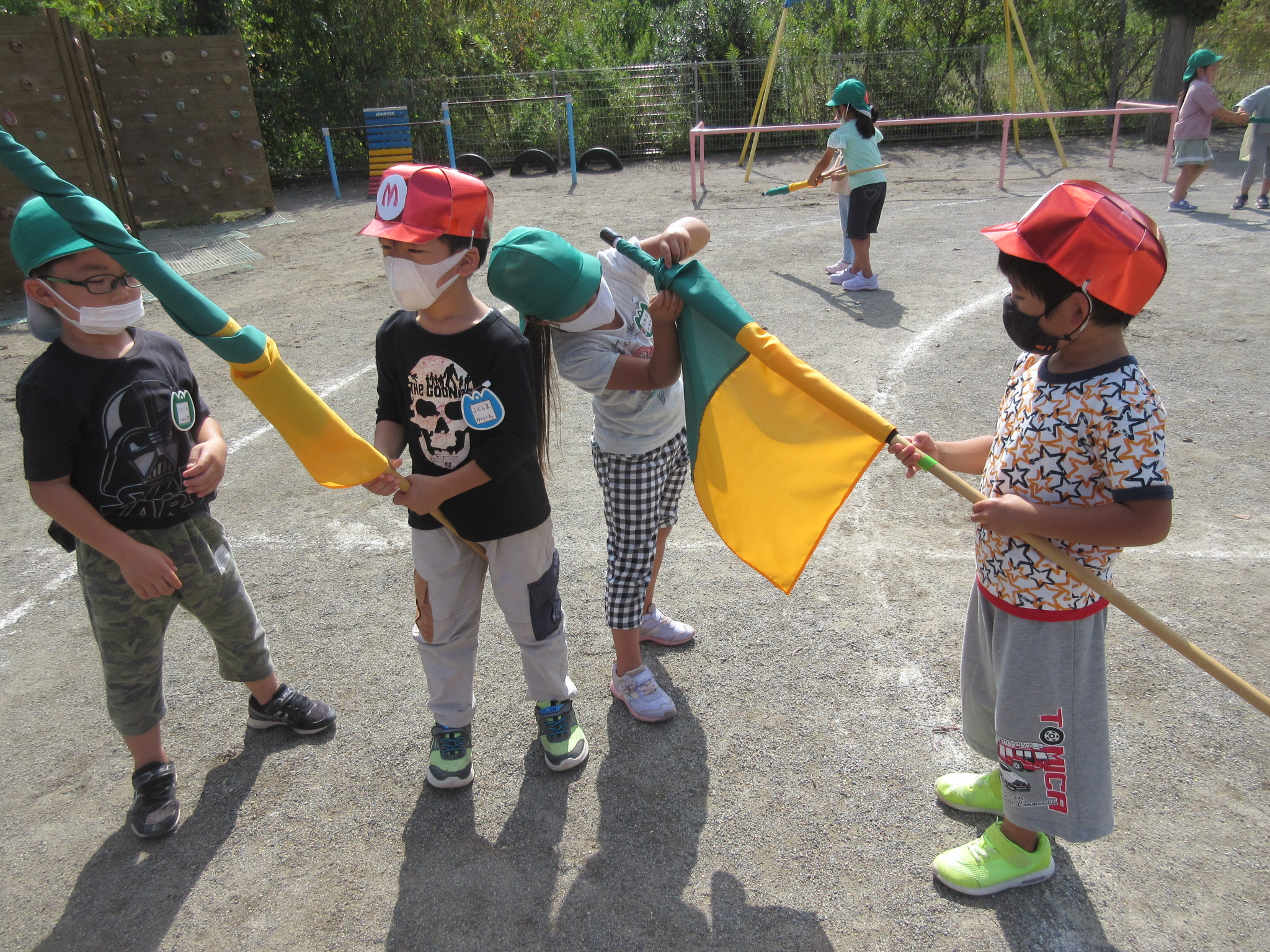 お父さん、お母さんが来てくれて、心のこもった応援をいただき、より一層のパワーを発揮することができました!! 今日は、にじ組さんからカラーガードを教えてもらいました。持ち方や回し方を丁寧に教えようとするにじ組さん。真剣に耳を傾け、やってみようとするそらぐみさん。隣に寄り添ってもらいながら、最後まで曲に合わせて動くことができ、「すっごく楽しかった。」と喜ぶ姿が見られました。