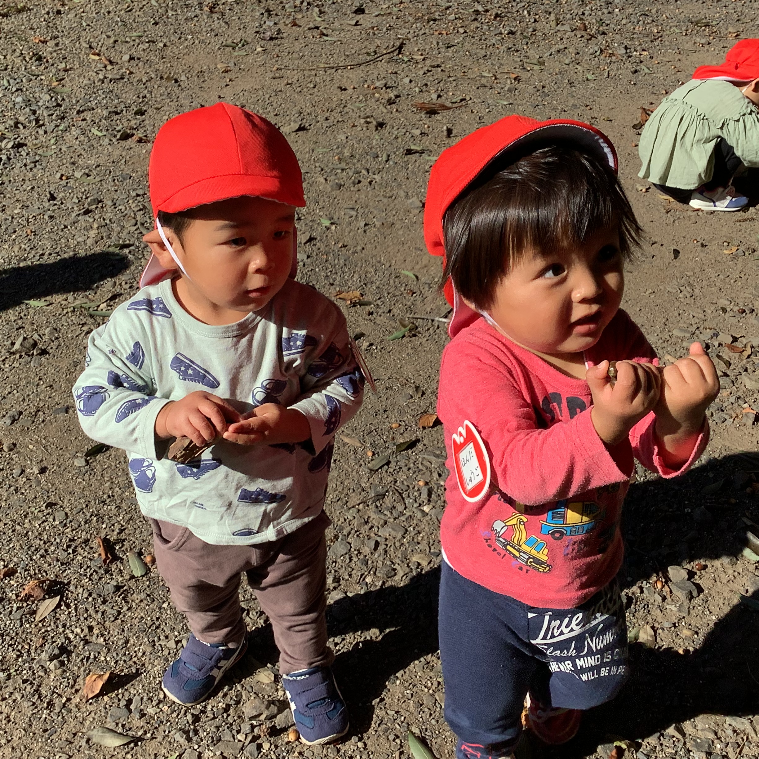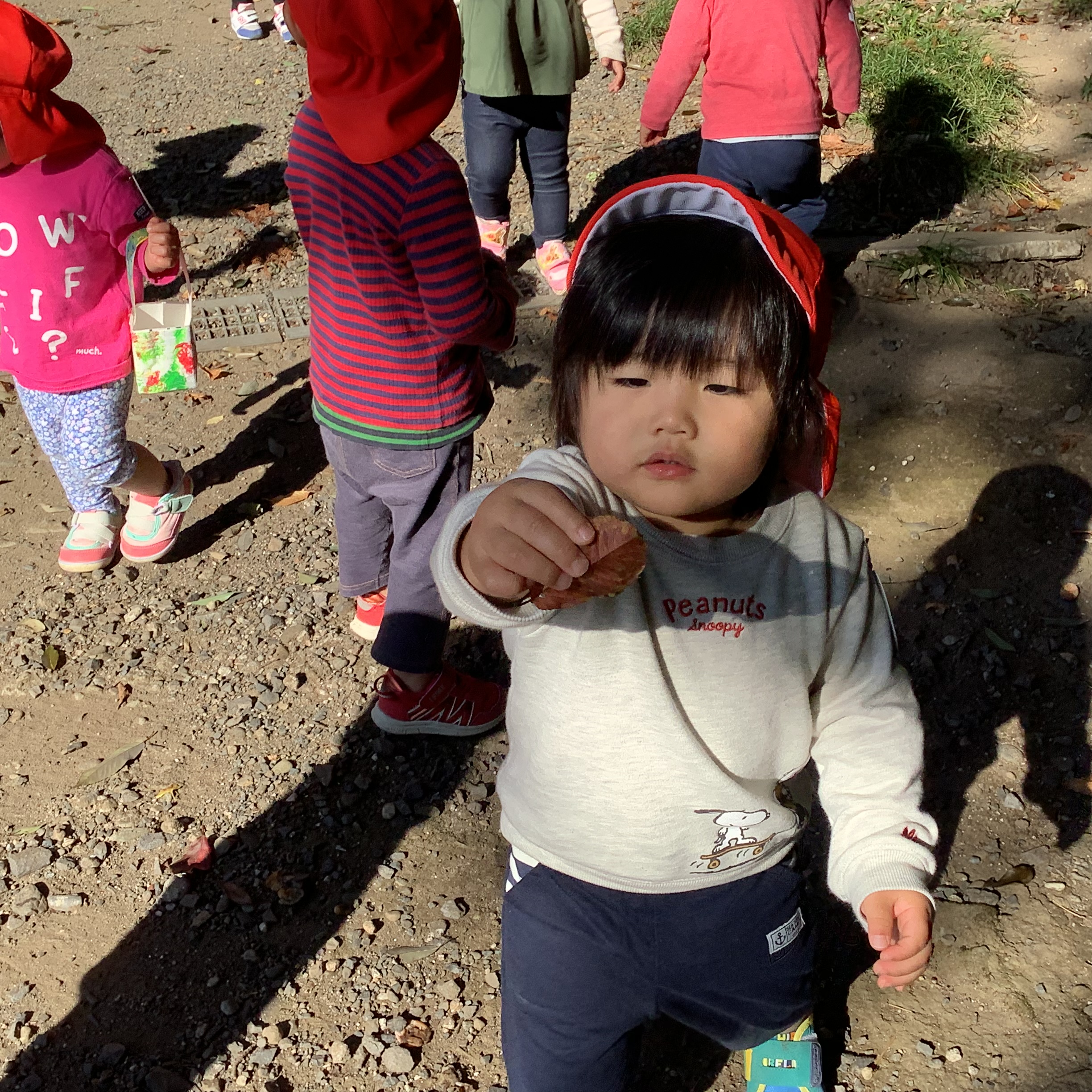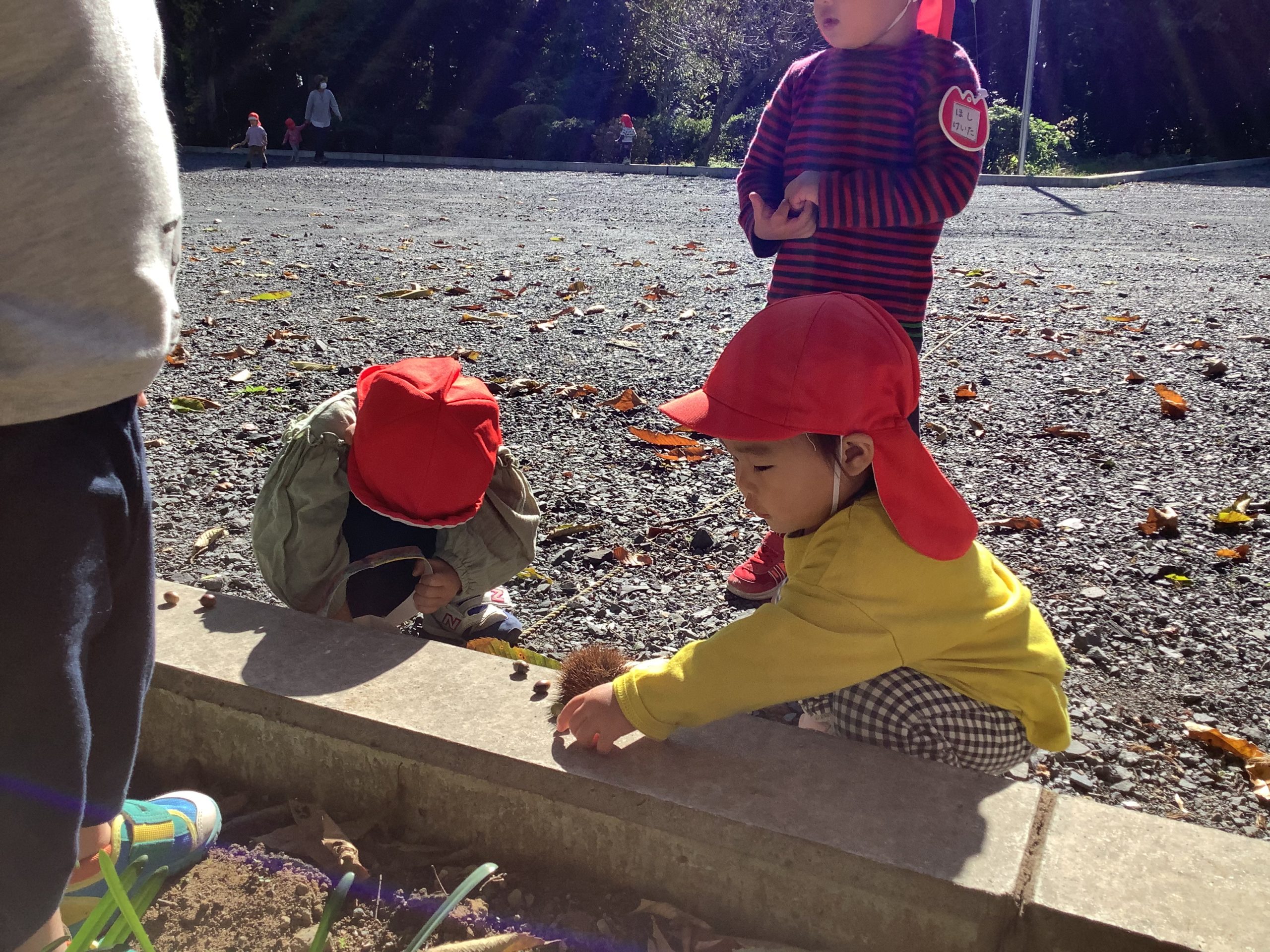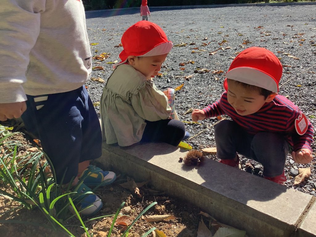今日は保育園の近くの鱗勝院へお散歩に行ってきました。ドングリや栗、柿など秋の自然がいっぱい!「あったよ」「みてみて」と見つけた植物を保育士やお友だちに知らせてくれたり、拾ったり触ったり・・・栗のチクチクを触わってみたらビックリ!「いたい」と言って今度は葉っぱや木の枝で触ろうとするなど、秋の植物に関心を寄せる姿がありました。
