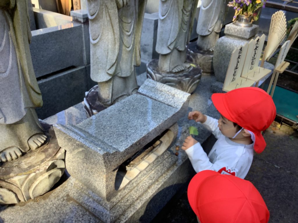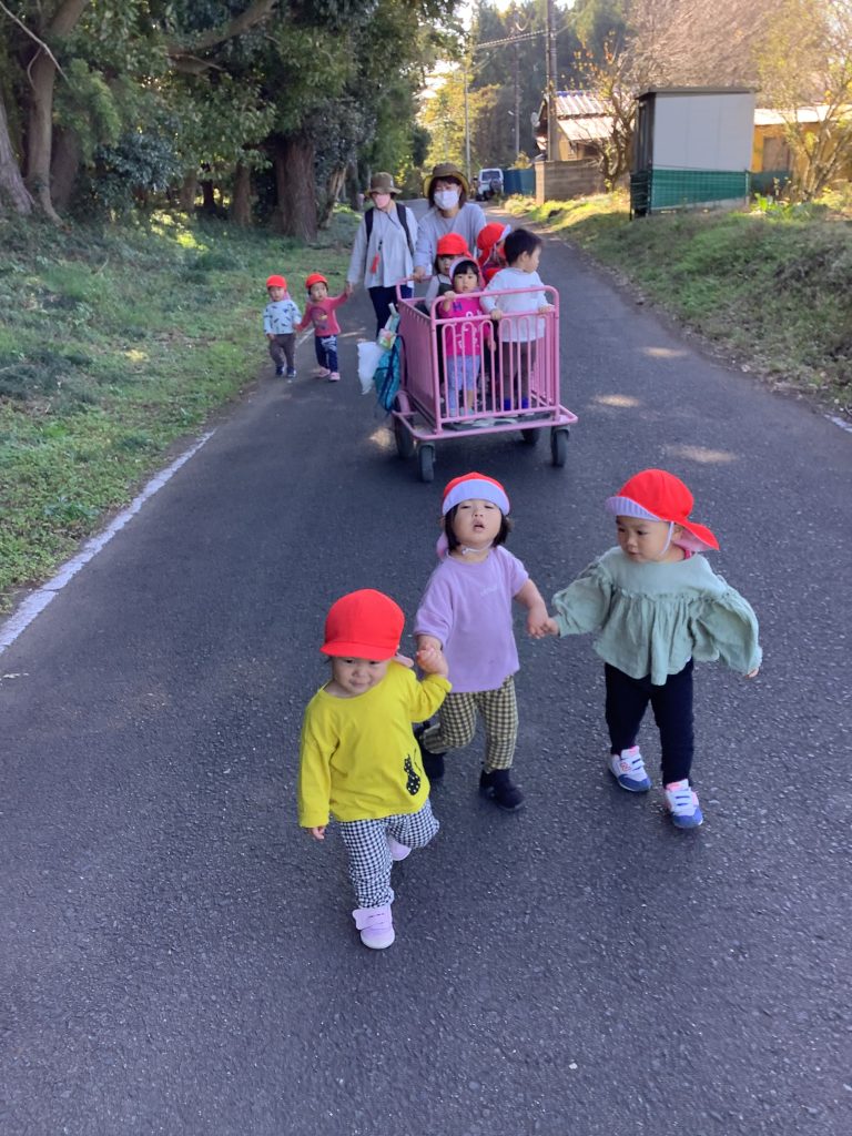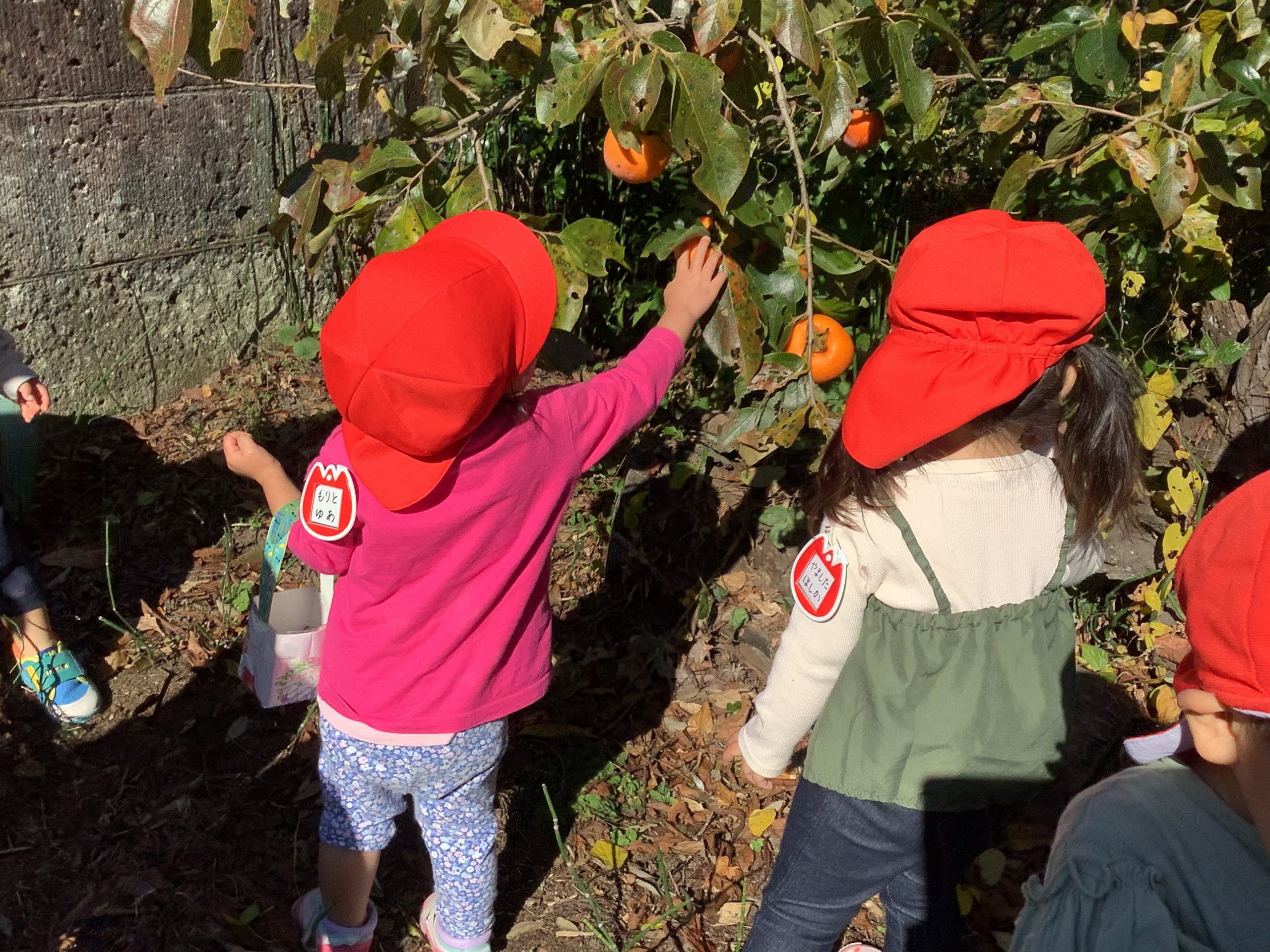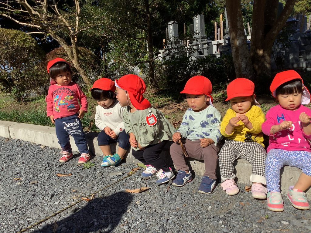 今日は保育園の近くの鱗勝院へお散歩に行ってきました。ドングリや栗、柿など秋の自然がいっぱい!「あったよ」「みてみて」と見つけた植物を保育士やお友だちに知らせてくれたり、拾ったり触ったり・・・栗のチクチクを触わってみたらビックリ!「いたい」と言って今度は葉っぱや木の枝で触ろうとするなど、秋の植物に関心を寄せる姿がありました。