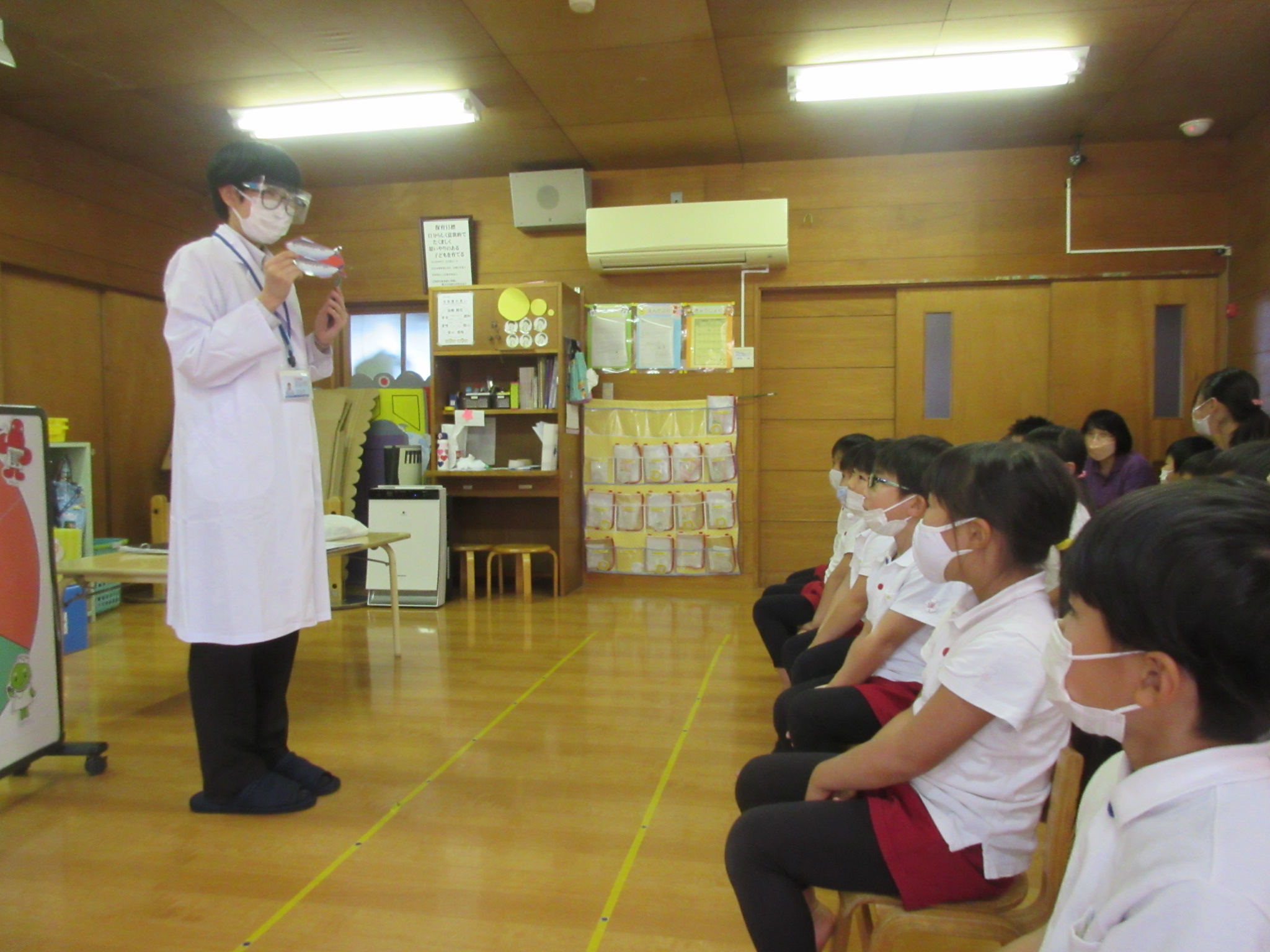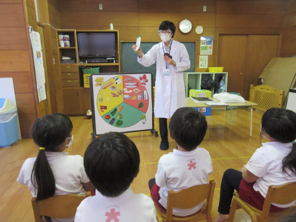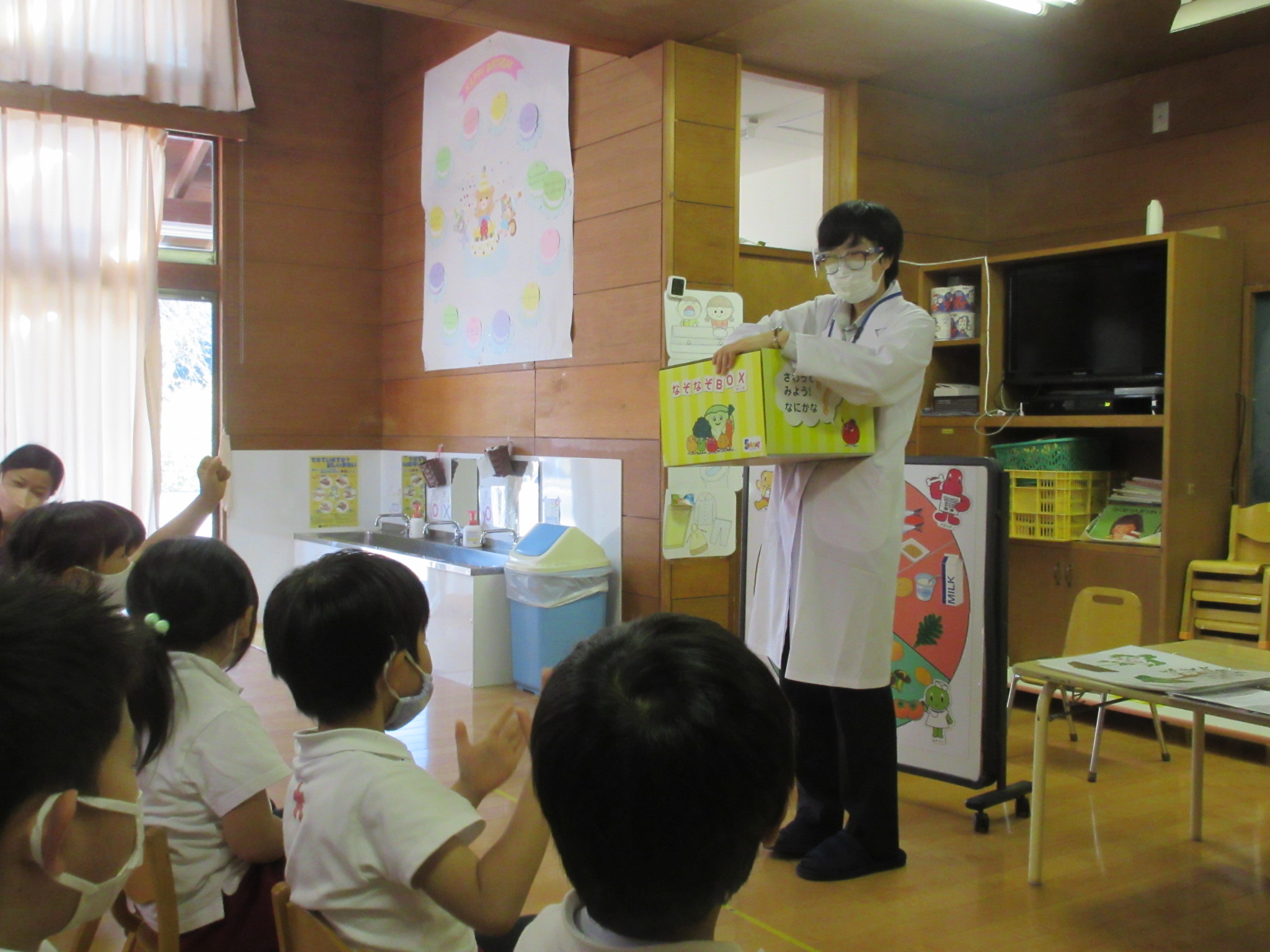 カスミ5DAY食育学習(5歳児) 2021 11/10 ニュース カスミの栄養士さんが園にきて、食育の話をしてくれました。まずは、食べ物には3つの働き(あか・き・みどり)があり、バランス良く食べると健康的になる話や、5ADAY(ファイブ・ア・デイ)を心がけると毎日元気に過ごせる話など、たくさん教えて頂きました。また、時折なぞなぞをを出してくれ、楽しみながら食育について学ぶことができました。 ニュース URLをコピーしました! お散歩遠足(3歳児) おにぎりをもって出発!!(5歳児) コメント コメントする コメントをキャンセルコメント ※ 名前 ※ メール ※ サイト 次回のコメントで使用するためブラウザーに自分の名前、メールアドレス、サイトを保存する。 上に表示された文字を入力してください。 Δ