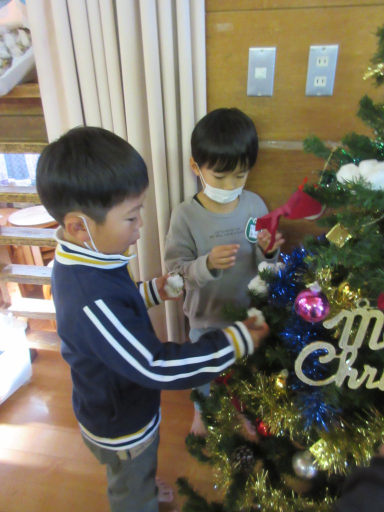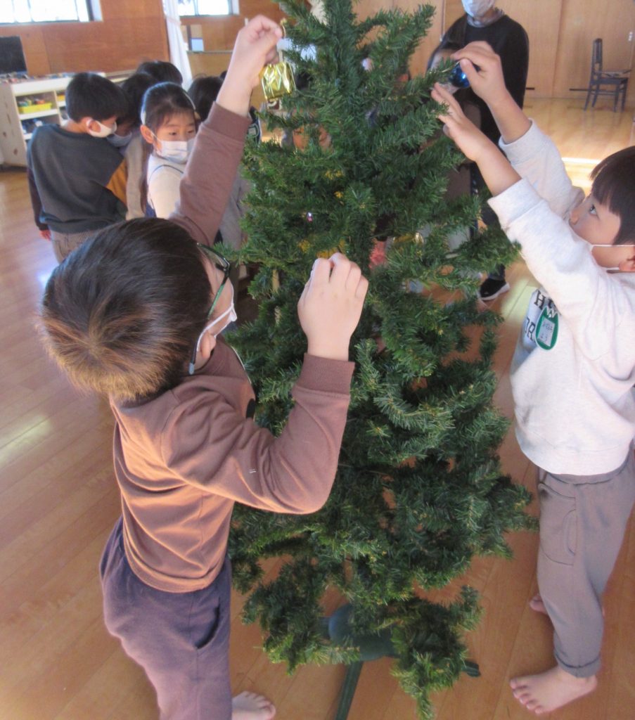 クリスマスツリーを飾ろう!(5歳児) 2021 12/13 ニュース 毎年、保育園にあるクリスマスツリーを飾るのは年長さん!「よしっ!みんなでかわいいツリーにするぞっ!」と張り切って準備をしました。「どこから飾っていく?ここからにしよう!」と、どんどん飾りをつけていく子どもたち!「あっそうだ!この前もらった綿を飾ったら雪みたいでいいかも!」と試行錯誤し、素敵なクリスマスツリーが完成しました。その後、点灯式を行い…「うわ〜キレイ!」とツリーをじっと見つめ、「サンタさん喜んでくれるかな?」と胸を踊らせるにじ組(5歳児)でした。 ニュース URLをコピーしました! 生活発表会のくじ引きをしました! 綿の木?(5歳児) コメント コメントする コメントをキャンセルコメント ※ 名前 ※ メール ※ サイト 次回のコメントで使用するためブラウザーに自分の名前、メールアドレス、サイトを保存する。 上に表示された文字を入力してください。 Δ