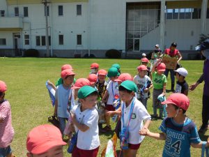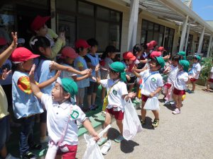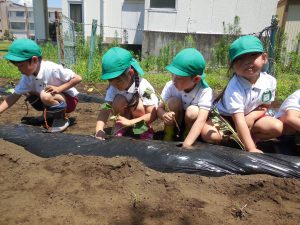 きょうは茨城女子短期大学の畑へ行ってサツマイモの苗植えをしてきました。種類は、「べにあずま」「べにまさり」「べにはるか」の三種類です。「サツマイモ大きくなるといいな。」と早くも収穫を楽しみにしている子供達です。その後は大成学園幼稚園の子供達と一緒に幼稚園の園庭で遊びました。「私は〇〇。お名前は?」と積極的に話しかけ、「保育園はどんなところ?」と聞かれ、「木登りできるんだよ。」と話し、子供達同士コミュニケーションをとり楽しむ姿が見られました。帰りは「また来てね。」「また遊ぼうね。」とハイタッチ。帰りのバスの中でも「楽しかった。」「お友達できた。」と嬉しそうにしていた子供達です。