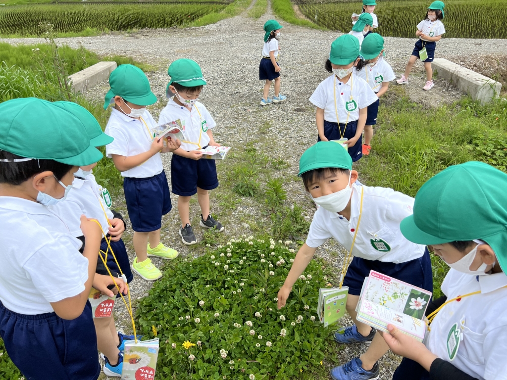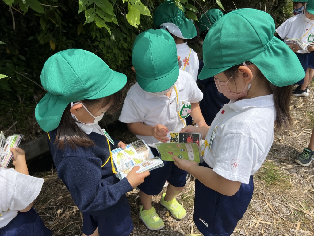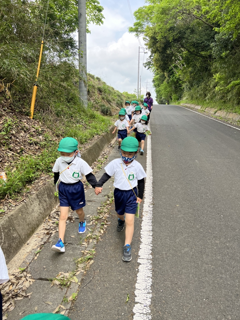 図鑑を持ってお散歩に出かけました。通り沿いに用水路があり、そこをのぞくと大きいカエルが!発見と同時にすぐさまページをめくり「あのカエルの名前は??」「これかな?いや、こっちかも!!」と友だちと相談しながら観察していました。その後も、春の生き物や草花に出会うたびに調べることに夢中の子どもたちでした。