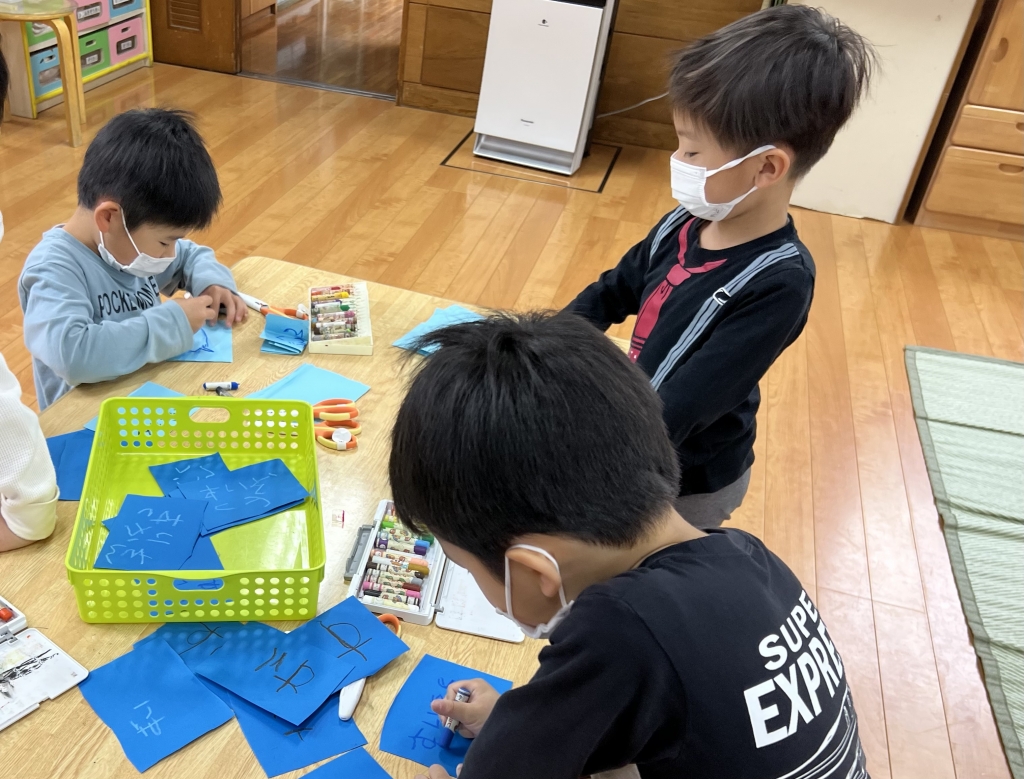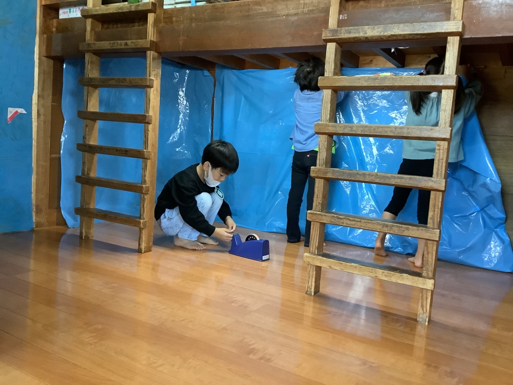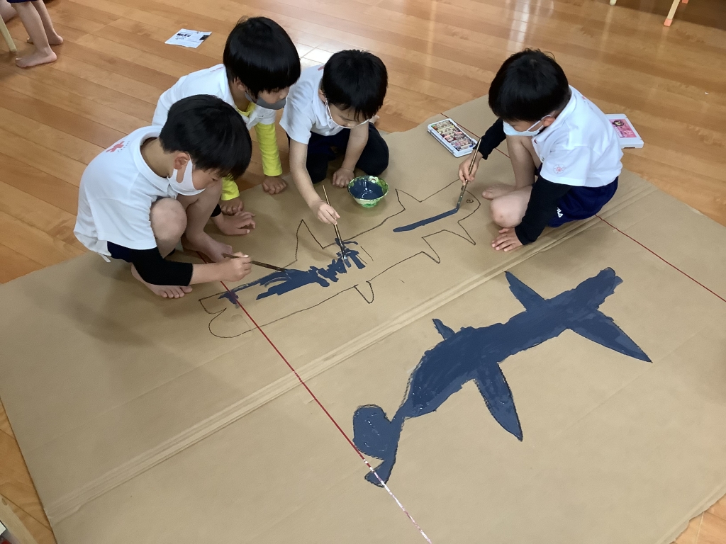 折り紙やクレヨンでいろいろな海の生き物を作っていたにじ組さん。「そうだ、水族館を作ろう」と活動が始まりました。ホールの空いているスペースを利用して海作りから始まり、どんどんそこに魚たちが集まってきています。「水族館にはサメもいるんだよ!」という声から「サメってどのくらいの大きさかな?どんな色をしているのかな??」と疑問に思い、調べて本物そっくりに作ろうとする姿も。また、「水族館には入るのに券も必要だ」とチケット作りも始まっています。どんなにじ組水族館ができるのかお楽しみに…!!