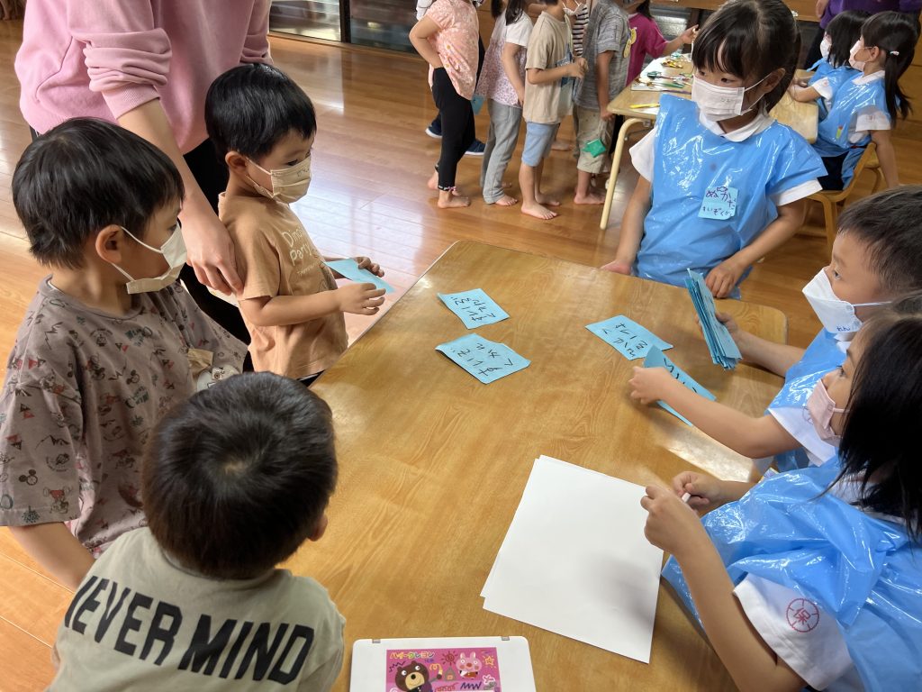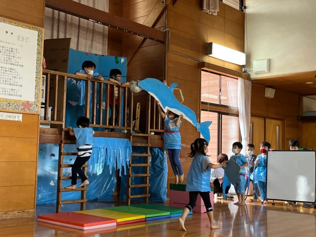 イルカショーの練習、チケット売り場・お土産売り場など準備をすすめ、いよいよにじ組水族館がオープンしました。そら組やつき組を呼び、スタッフさんは大忙し!!イルカショーもジャンプするごとに大きな拍手をもらい満面の笑みの子どもたちでした。