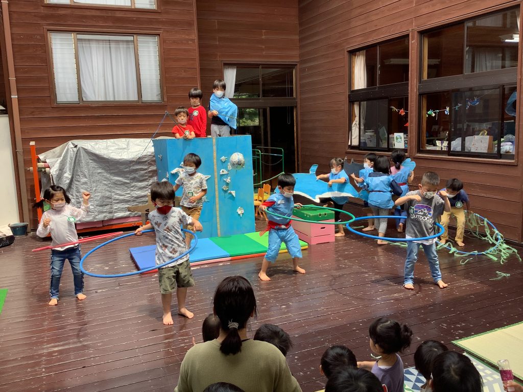「オレンジ(2歳児)さんやあか(1歳児)さんにも見せたい」とテラスで “ワカメダンスショー” も行いました!!