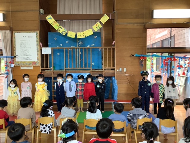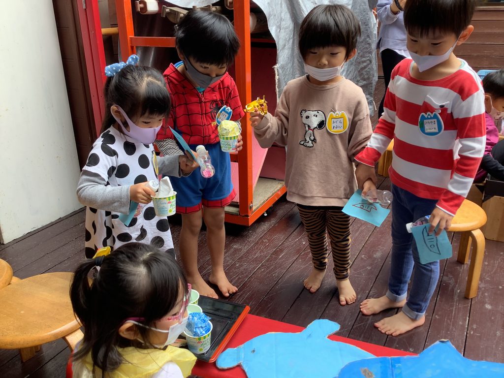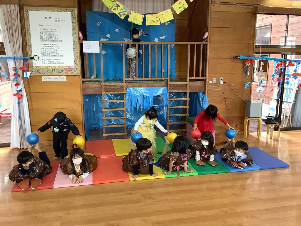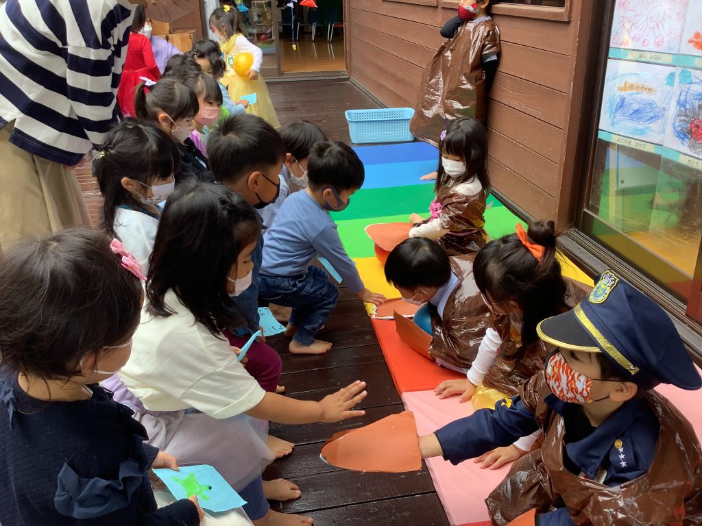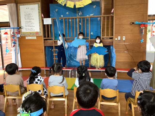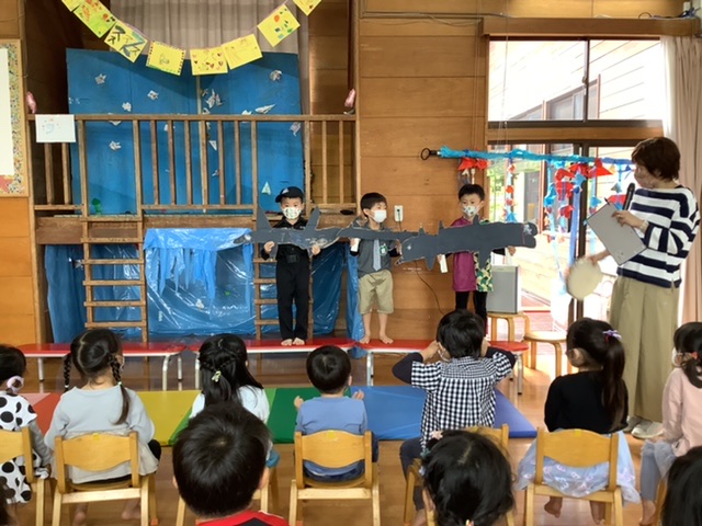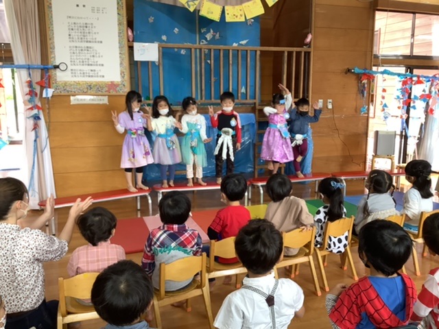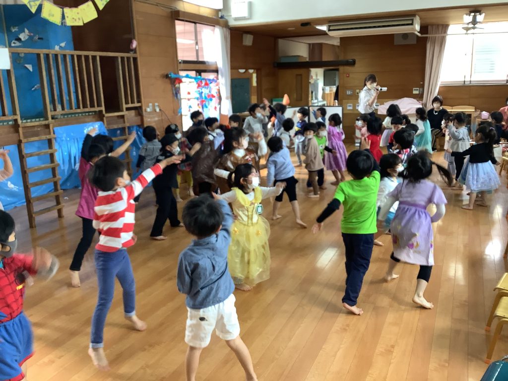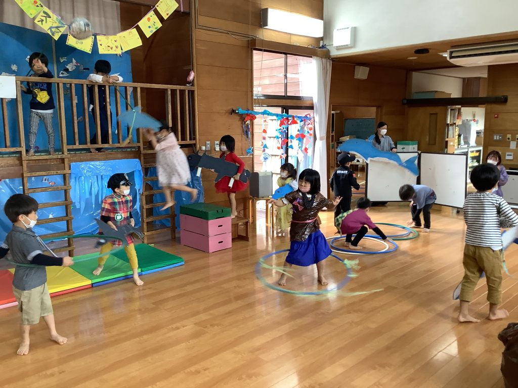今日はずっと楽しみにしていたファーストパーティーの日でした。みんな朝から「かわいいでしょ!」「カッコいい服着てきたよ!」と素敵な服を見せ合いっこしながらウキウキモード!!遠足に行ってからも盛り上がっていた水族館ごっこを[ショー]にしたパーティーがスタート!海の生き物ファッションショーを見たり、生き物触れ合いコーナーでエサをあげたり、にじ組さんの盛大なショーで盛り上がりもマックスに!!!最後はみんなでエビ・カニダンスを踊って大盛り上がりの楽しいパーティーとなりました。