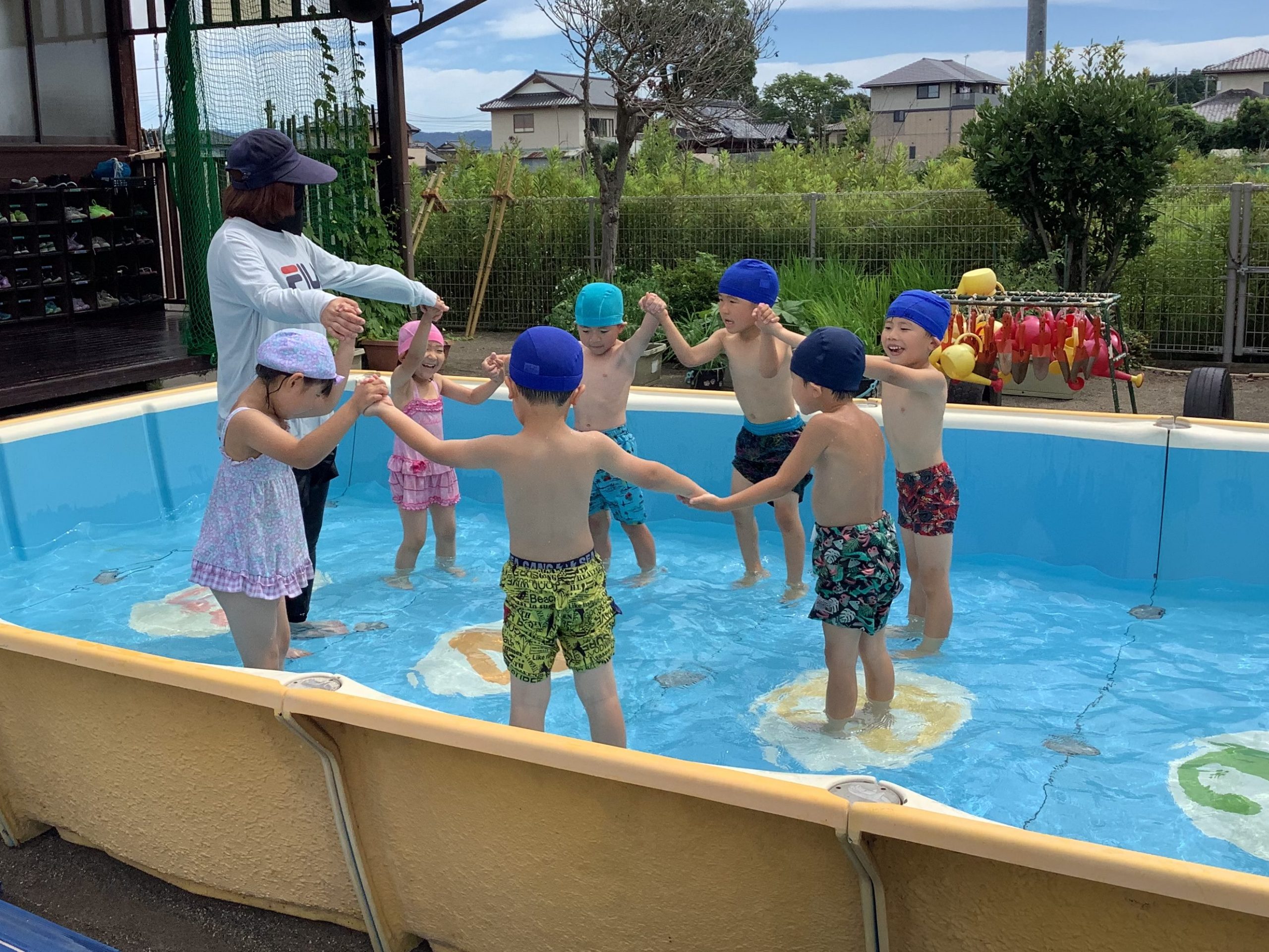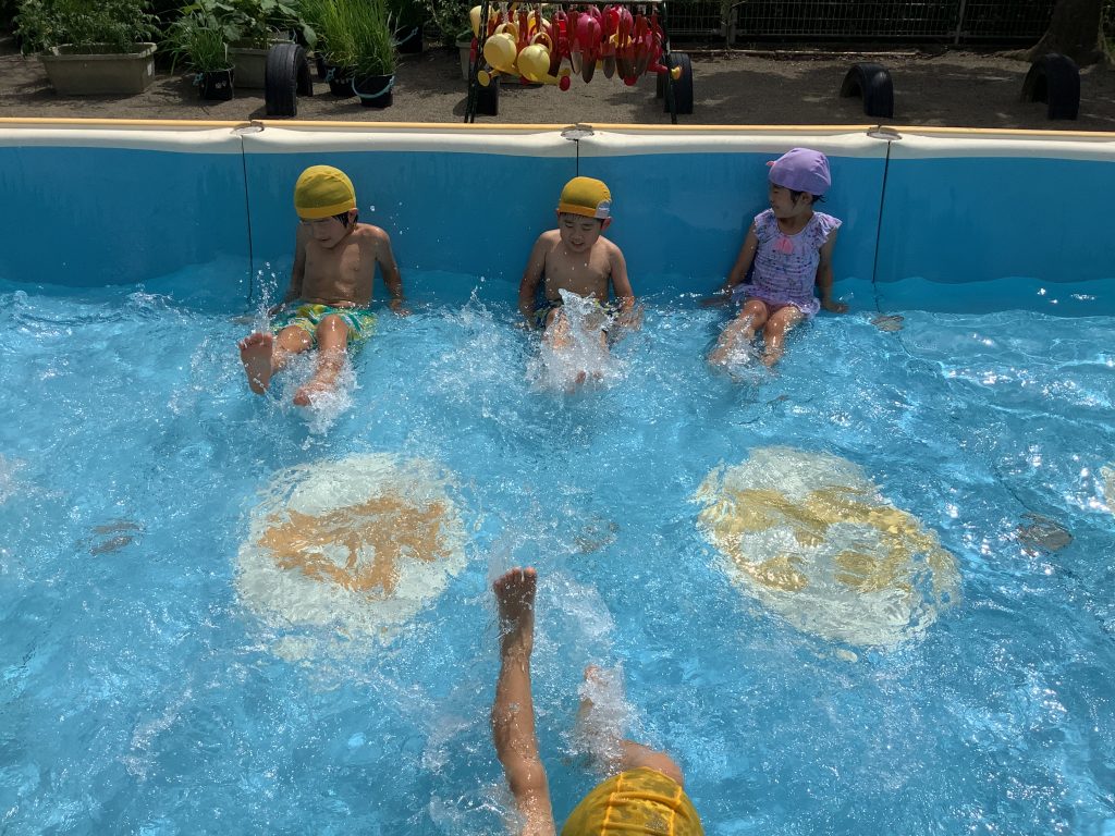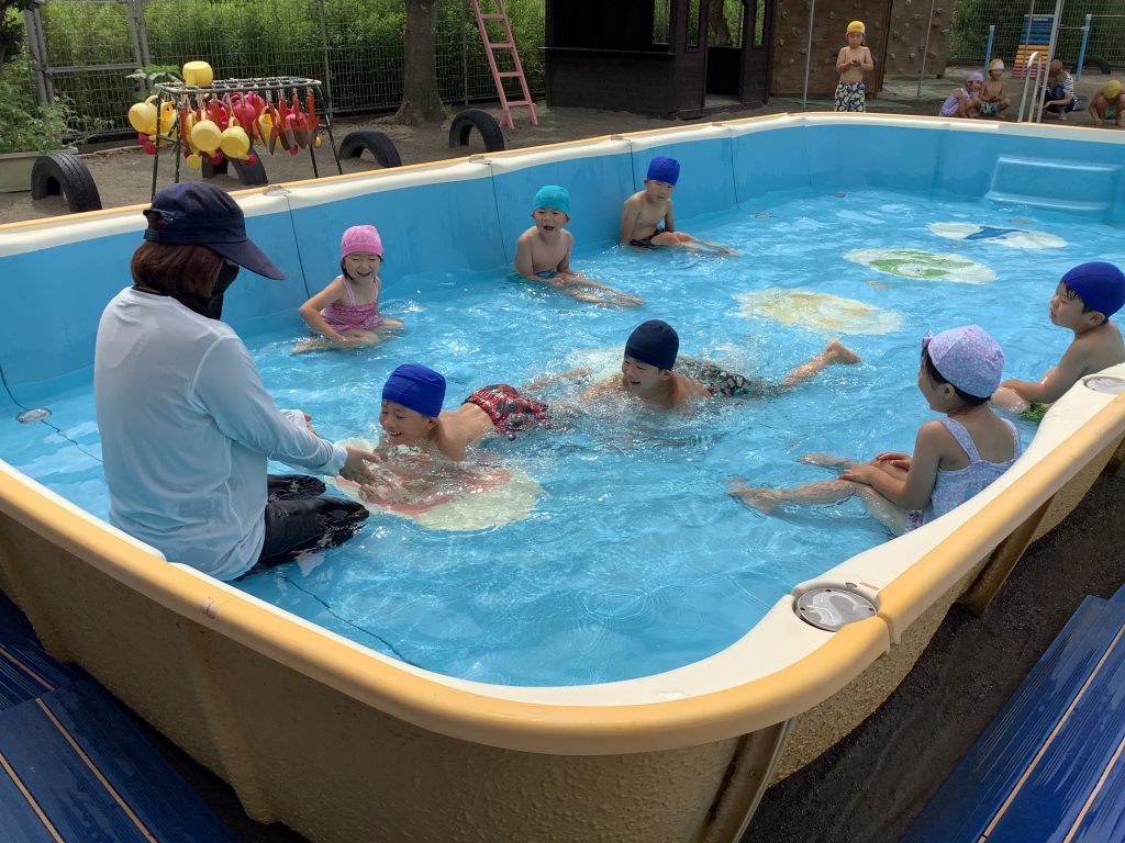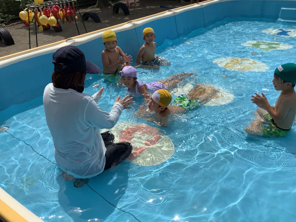 楽しみにしていたプール ! 危険がないよう約束事をみんなんで確認した後、プールの中を歩いたり、水しぶきをあげてバタ足をし、ワニ泳ぎに挑戦したり…久しぶりのプール遊びに大喜びのにじ組さんでした。