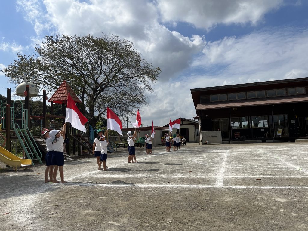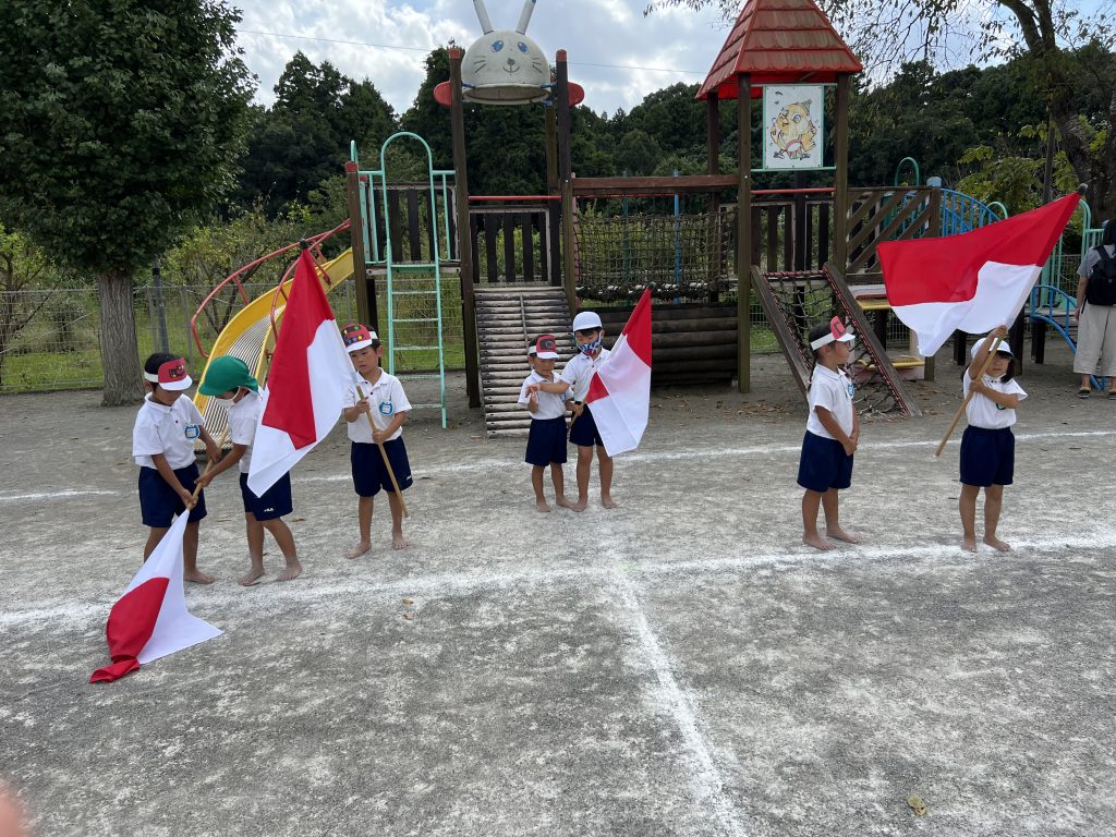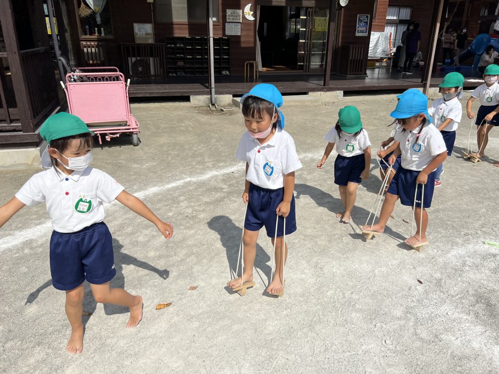 運動会後、そら組さんににじ組さんが行っていた竹馬、カラーガードなどを教えたいと張り切る子どもたち。「そら組の時、ポックリをやっておくとにじ組で竹馬にのれるようになるよ!」「カラーガードには持ち方があるよ!お約束もあるからね!」と優しく丁寧に教えていました。そら組さんができるようになると「やった〜!」自分のことのように喜ぶにじ組さんです。