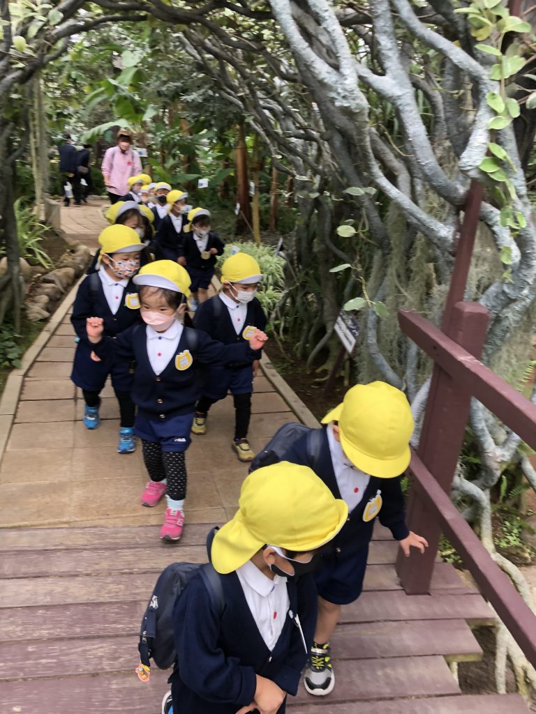 今日は待ちに待ったお楽しみの遠足の日!朝からルンルンのつきさんは、大きなバスを見て大興奮!!初めてのバスに乗って、ドキドキした気持ちで植物園に出発しました。到着すると入口の噴水を見て「うわぁ〜!!」と子どもたちの第一声が聞かれました。周りの植物を散策しながら植物館へ進み、中をじっくりと見たり、おいしいおにぎり弁当を食べて、笑顔あふれる遠足となりました。