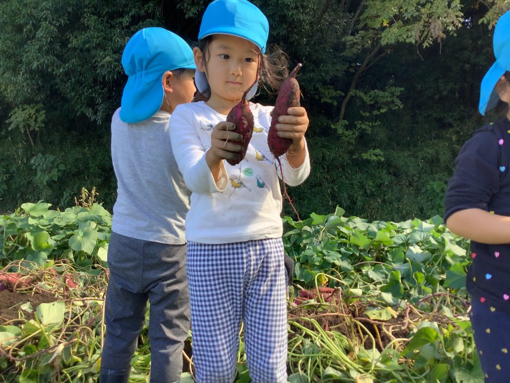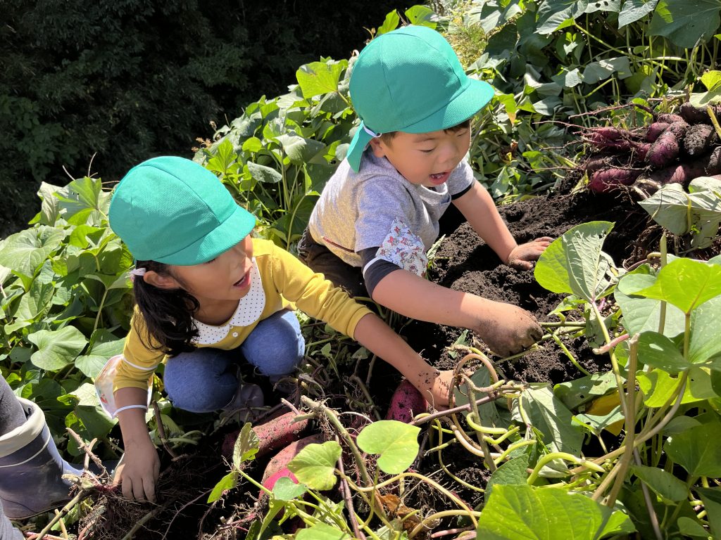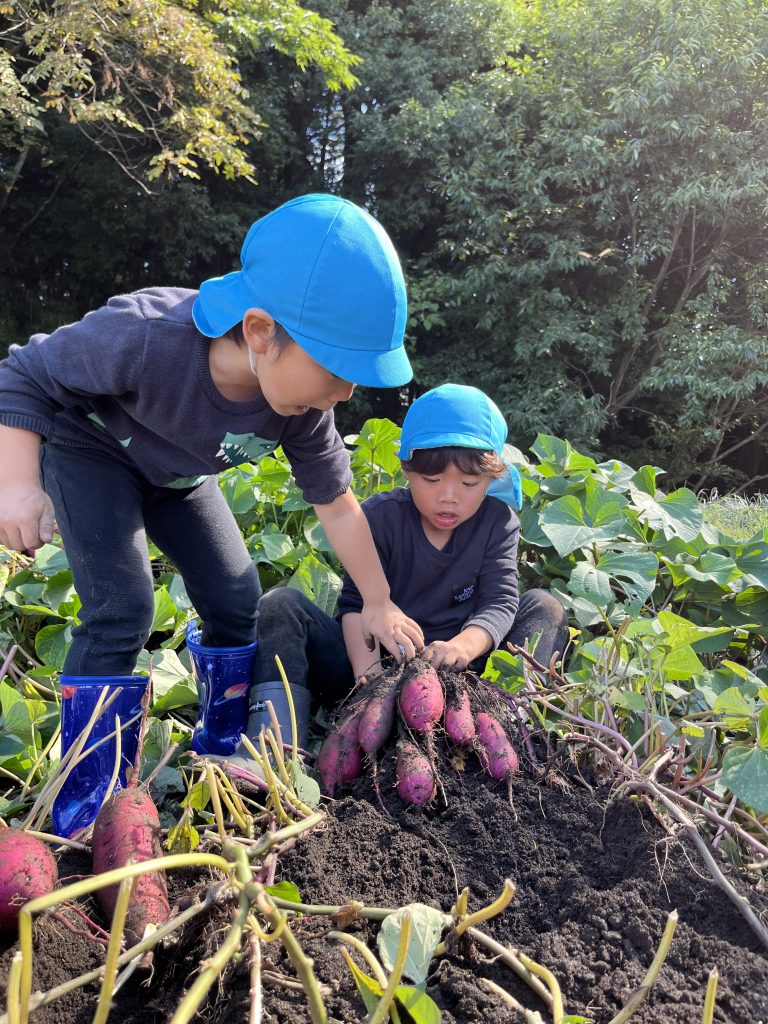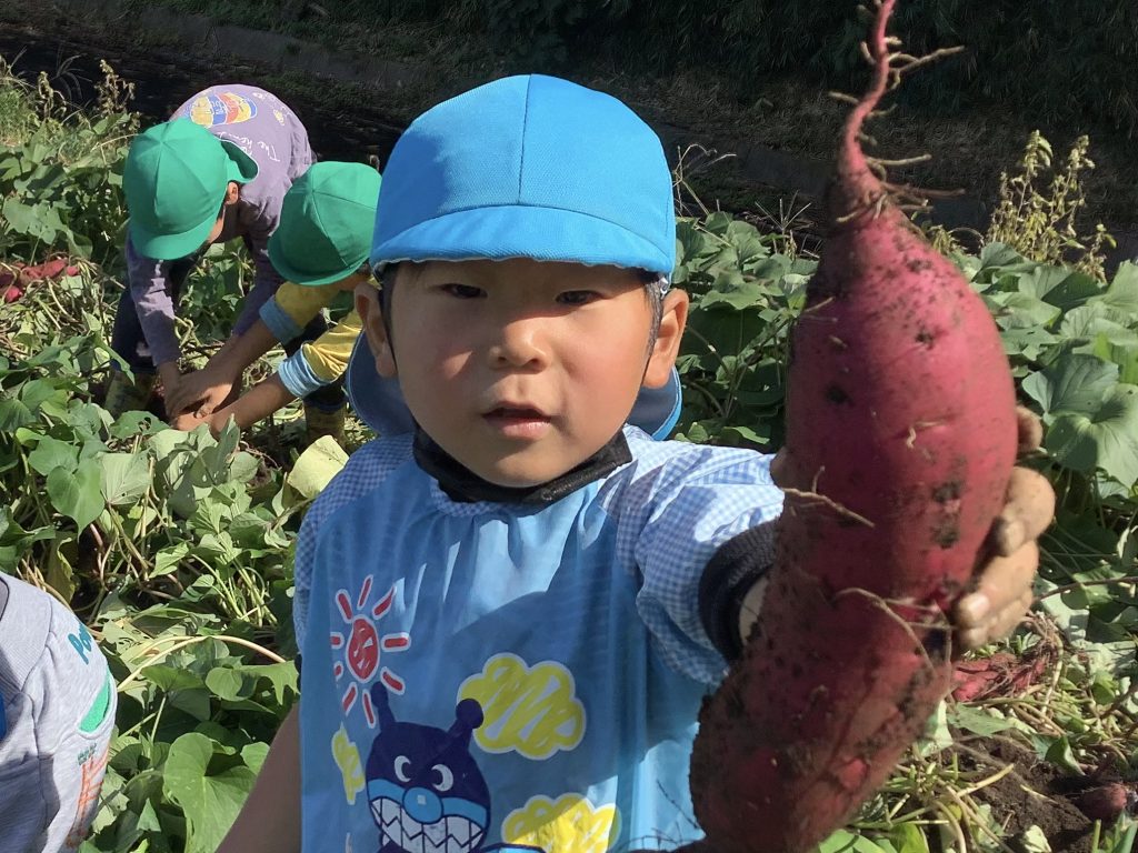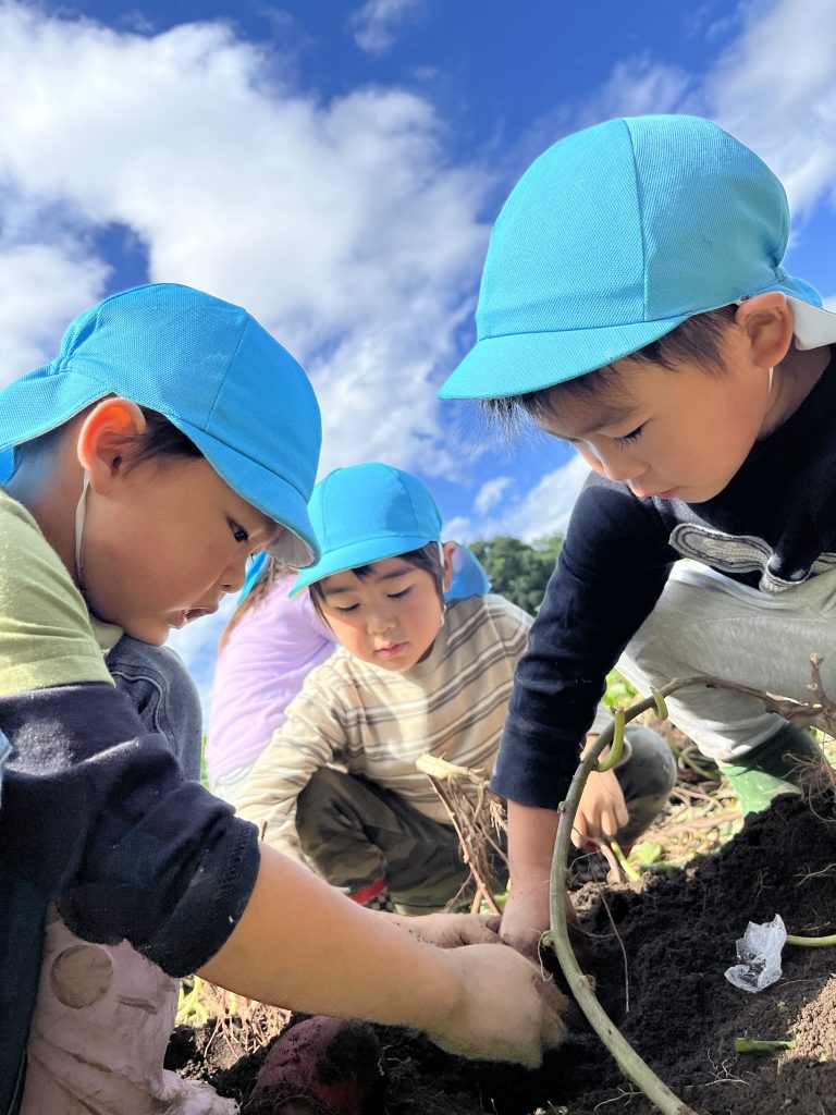 6月に苗植えをしたさつまいもが大きくなり、そら組とにじ組で収穫に行きました。「ここ掘ったらお芋出てくるかな?」「こんなにたくさん取れたよ!」と手を真っ黒にさせながら夢中で掘りすすめる子どもたち。「おいもパーティーできるね!」「おうち帰ったら何作ろうかな〜」と友だちと話しながら楽しい芋掘り体験が出来ました。