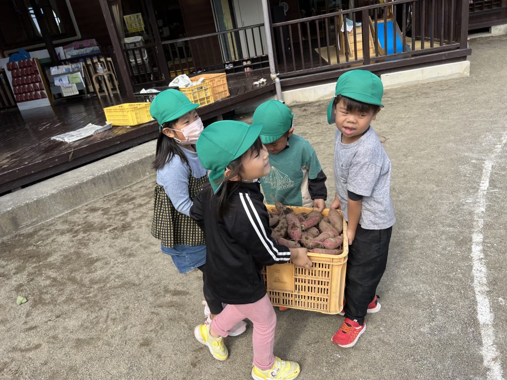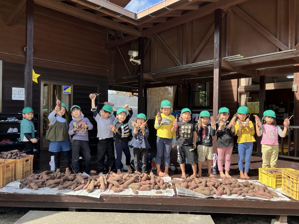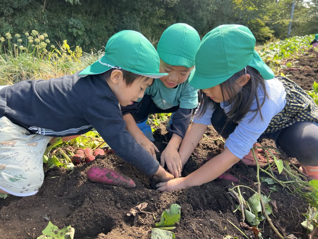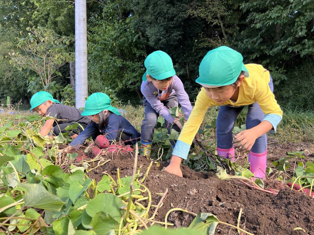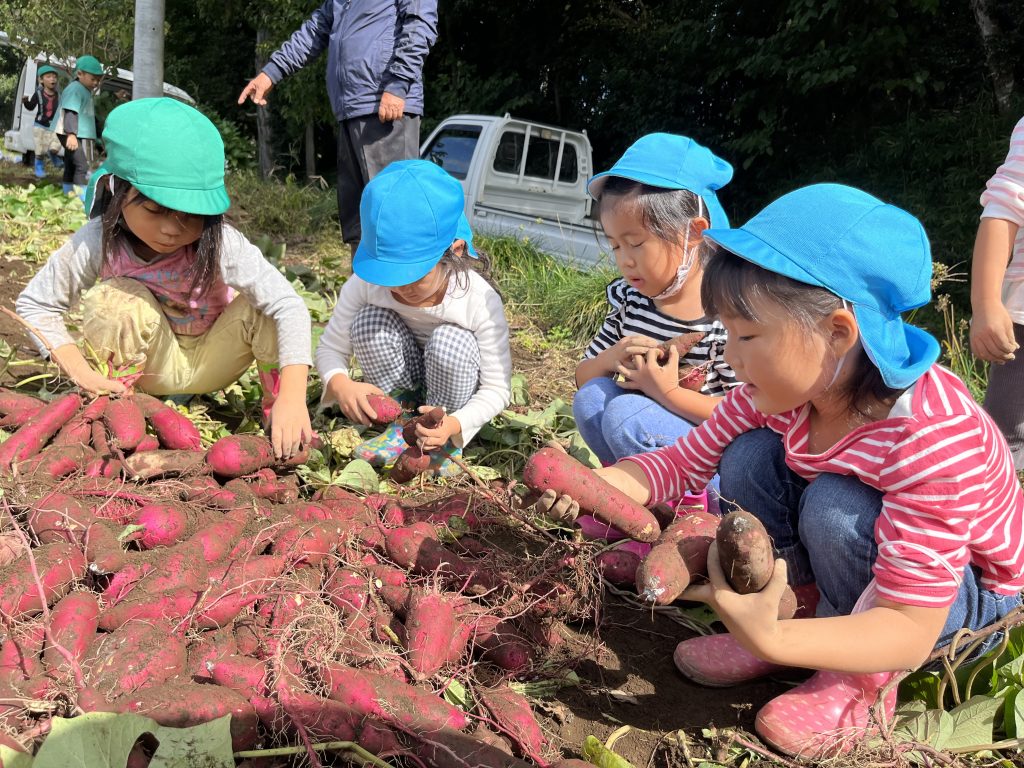 6月に苗植えをしたさつまいもが大きくなり、そら組とにじ組で収穫に行きました。「ここ掘ったらお芋出てくるかな?」「こんなにたくさん取れたよ!」と手を真っ黒にさせながら夢中で掘りすすめる子どもたち。「おいもパーティーできるね!」「おうち帰ったら何作ろうかな〜」と友だちと話しながら楽しい芋掘り体験が出来ました。