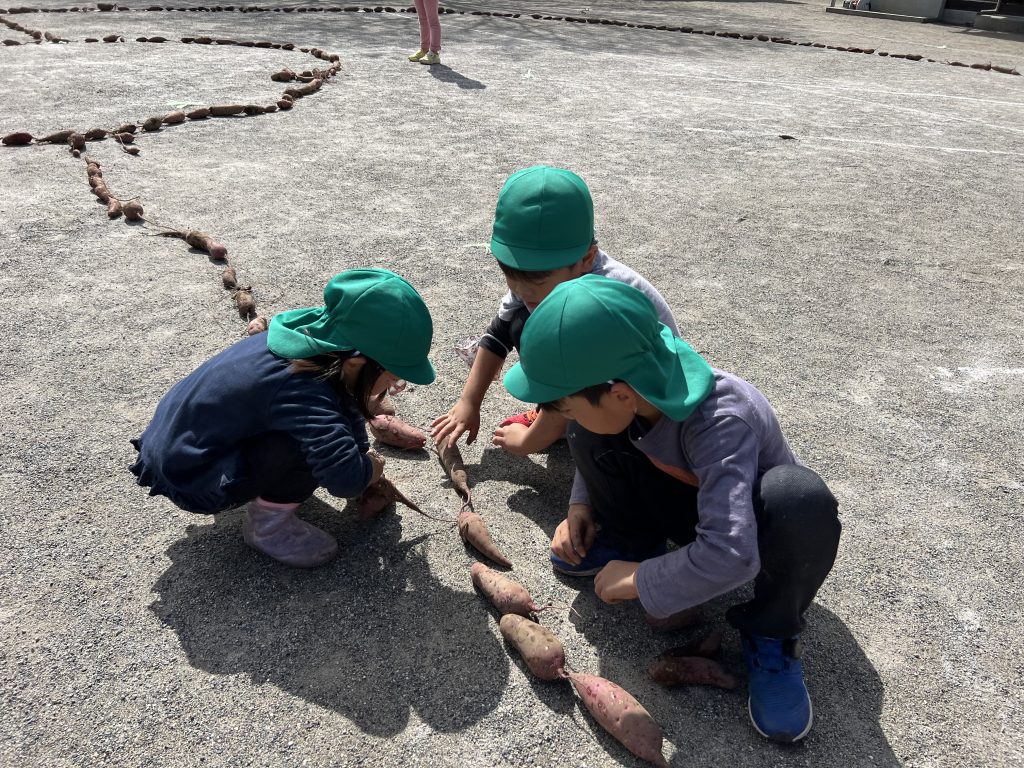 保育園に戻ってくると「何個あるか数えてみよう!」と園庭に並べていくにじ組さん。並べていく中で「こんな形はどうかな?」と友だち同士で話し合い、お芋モンスターボールを作り始めました。