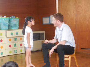 今日は英会話は、「May I have your name?」「My name is 〇〇」と答えられるようになったにじ組さん。イラストを見て「TOP」=こま「Ball」=ボールと答えられるようになったそら組さん。ブレンドン先生と一緒に英会話をするのを、とても楽しんでいる子供たちでした。