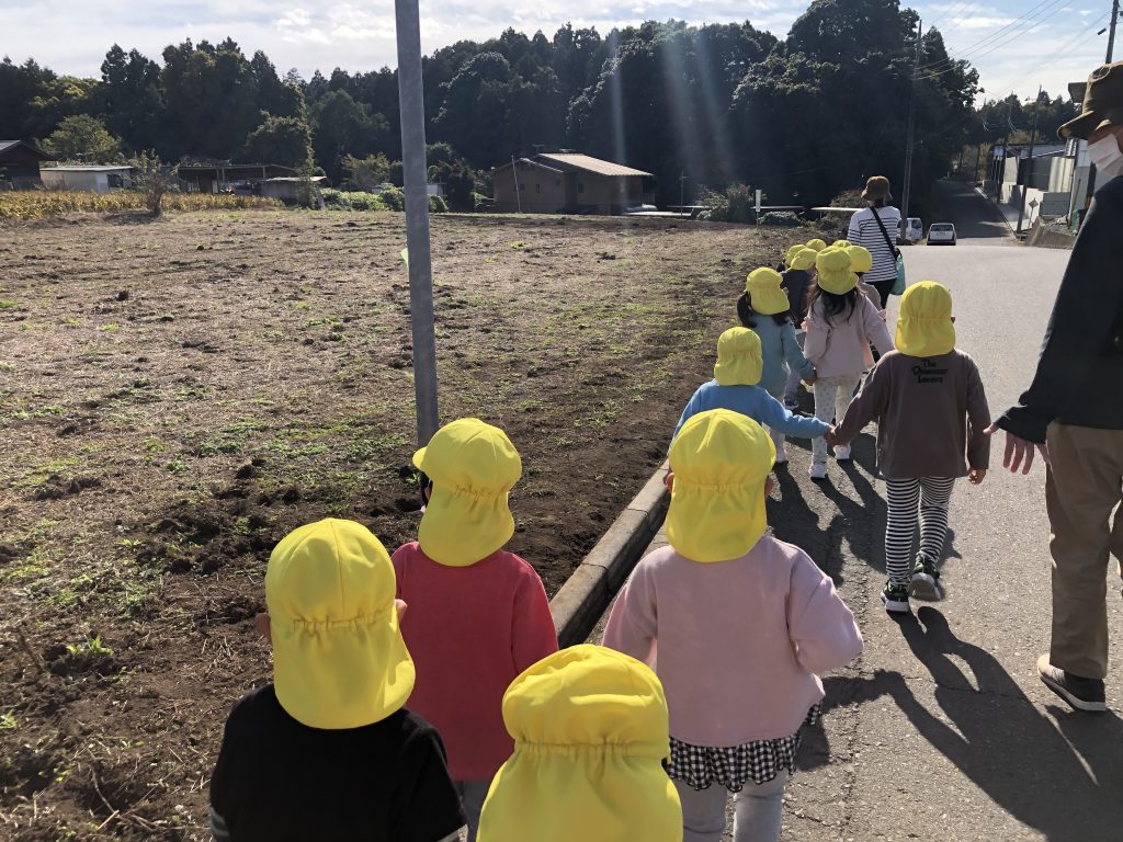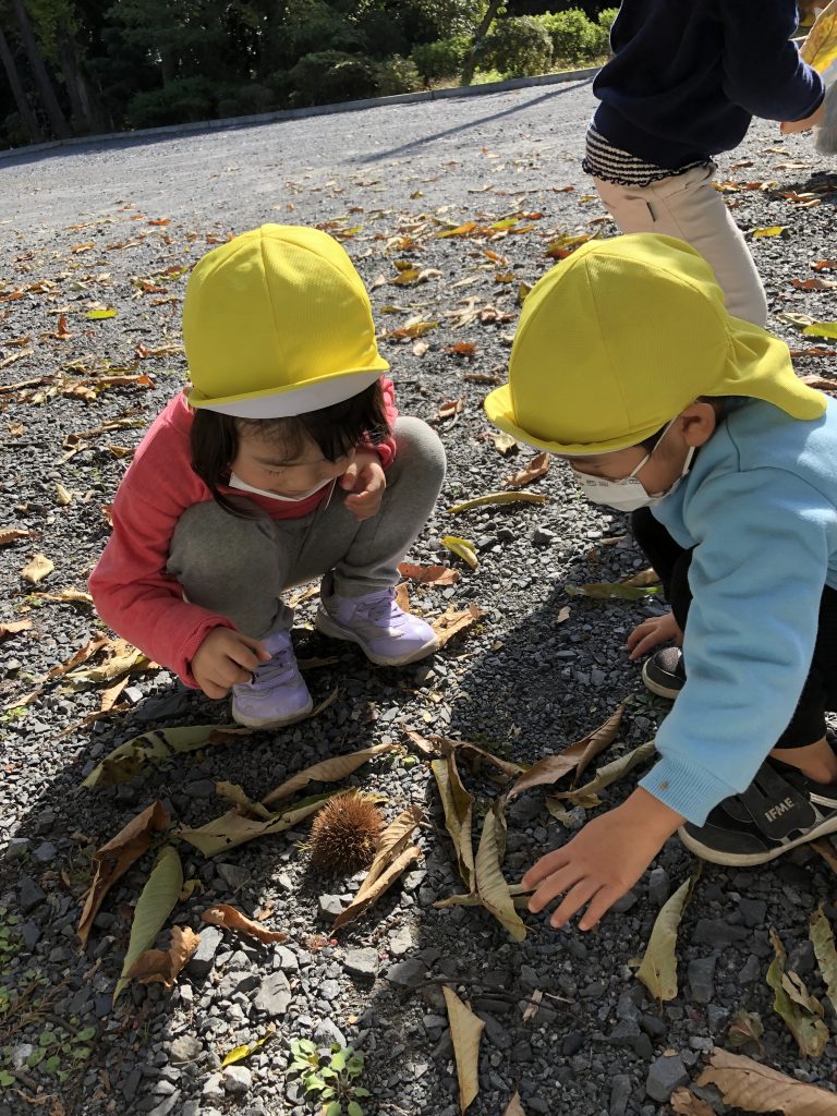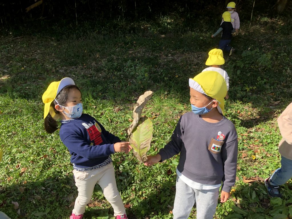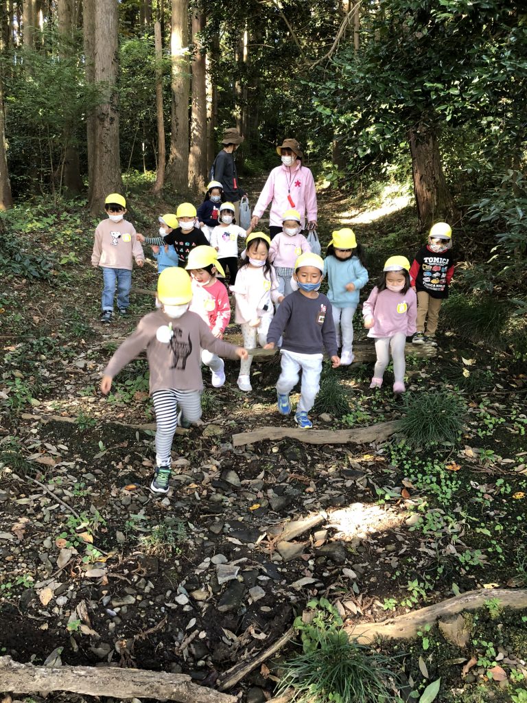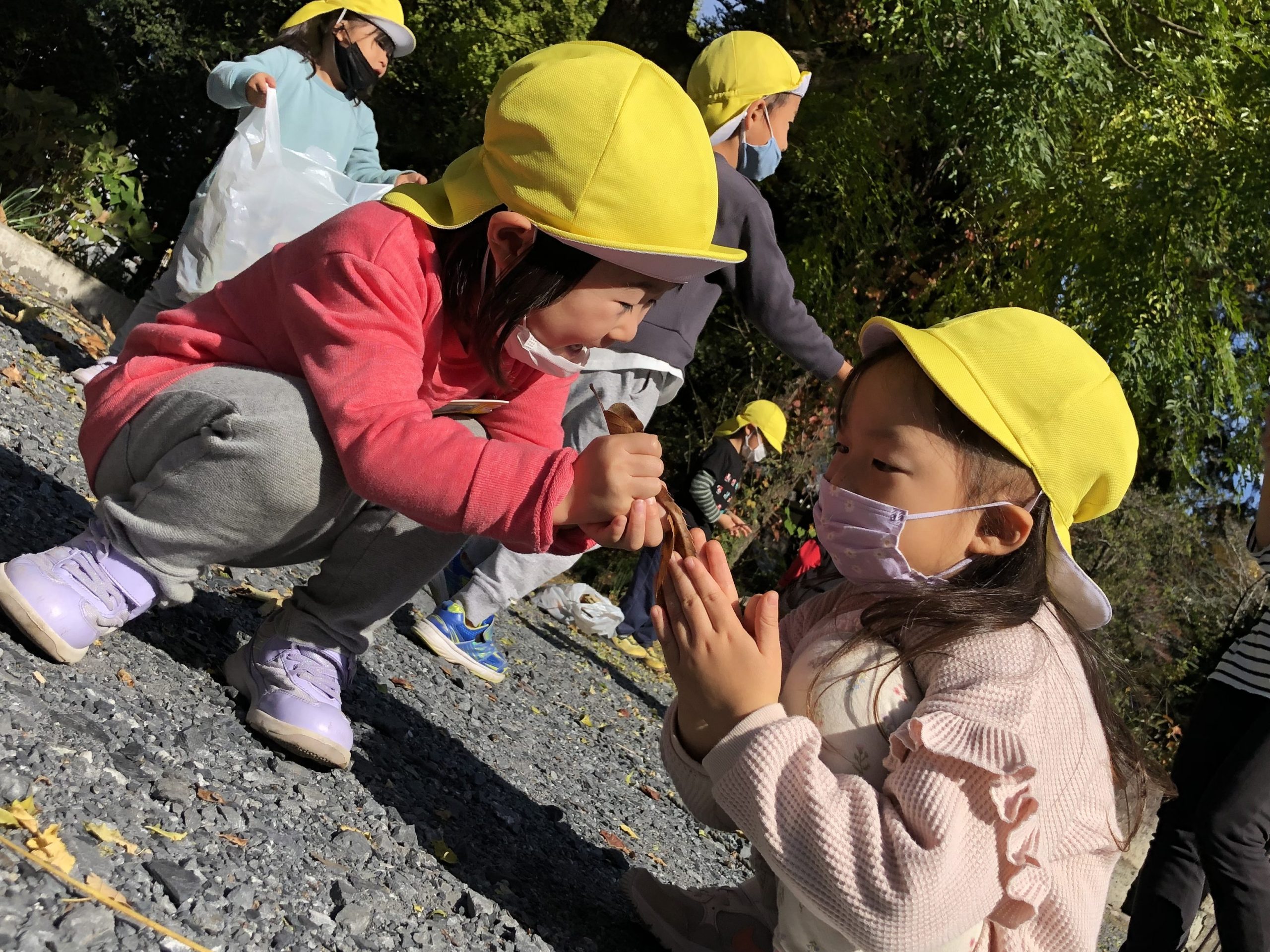 つきぐみ(3歳児)さんが毎日見ている絵本があり、その中で出てくる登場人物が作っている家があります。その家の「材料が必要だね!」と子どもたちが気づいてくれて、材料を探すため森まで散歩に行ってきました! 森に着くと、「オオカミいないかな?」「きっと優しいから大丈夫だよ!」と会話する姿を見せながらもドキドキしながら材料探しが始まりました! 必要な材料が見つかると、「あっ!これもいいね」と次々に夢中になって集めるつき組さんでした!何が完成するかはお楽しみに……。