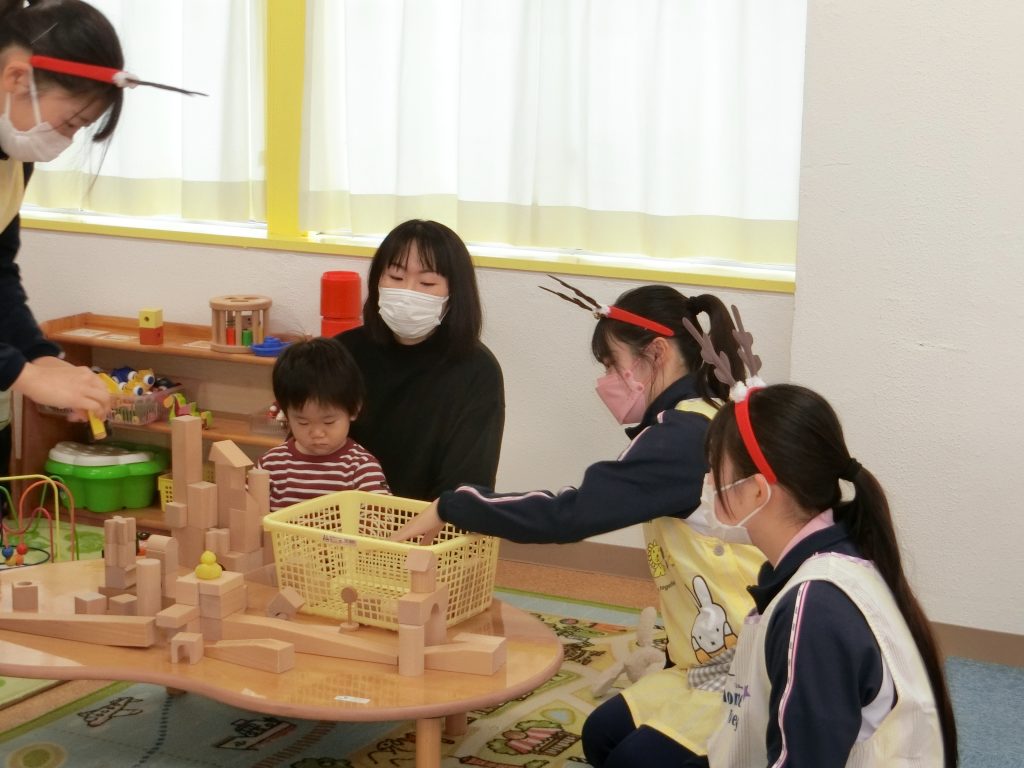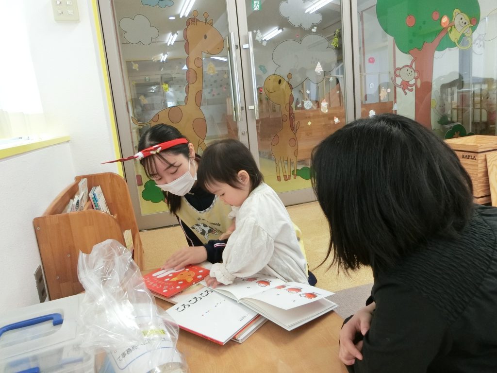 自由遊びではたくさんの玩具、絵本に興味津々!!学生さんが優しく関わってくれてとても楽しそうでした。