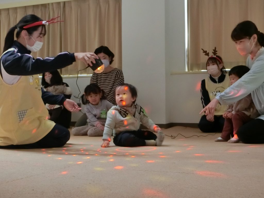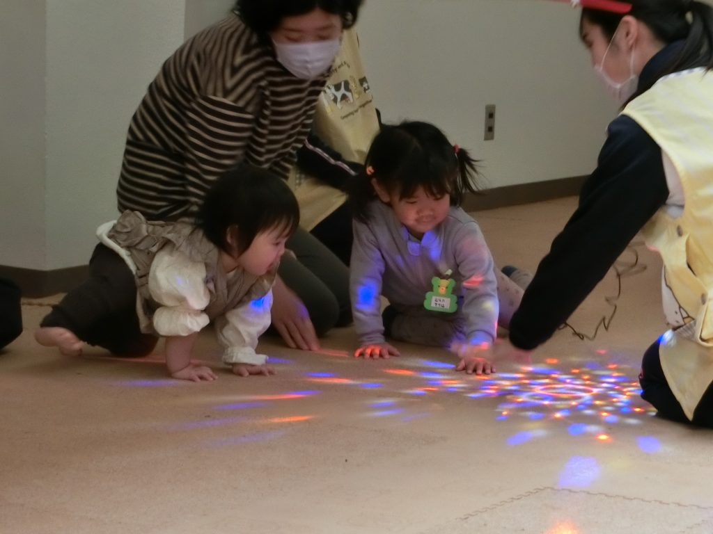 ミラーボール遊びをしてくれました。光が付くとキラキラ見える光と色彩に「わ〜!」と目を丸くして、光を追いかけたり、触れたり楽しむことができました。。