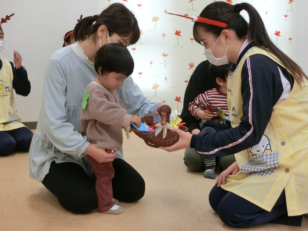 どれにしようかな・・・最後に、学生さんが折り紙で作ったサンタクロース、リースなどのプレゼントをもらいました。