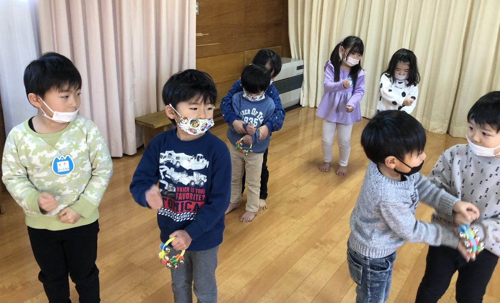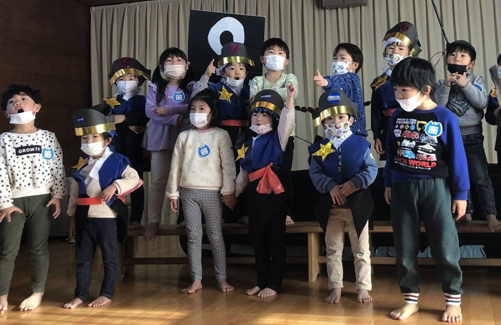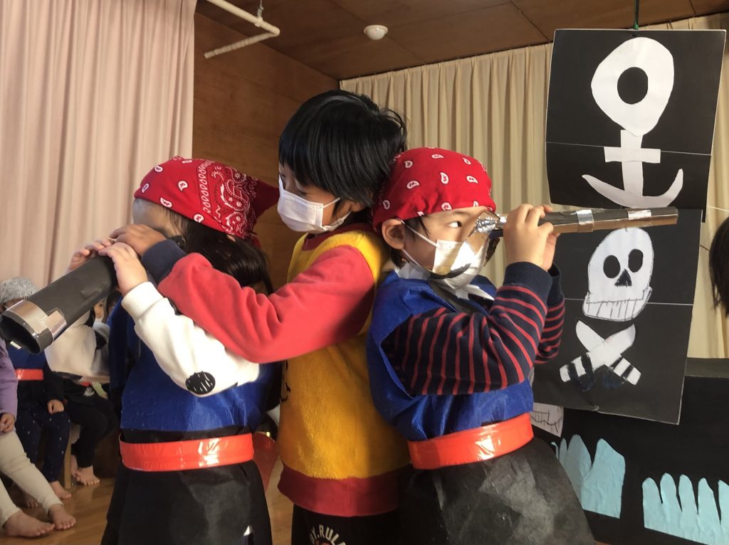 生活発表会が終わり、再現遊びをしました。そら組さんが、つき組さんに「海賊」の劇や鈴の演奏を「こうやるんだよ!」と見本を見せてくれたり、一緒に劇中の台詞を言いながら優しく教えてくれました。練習の時から見ていたそら組さんの劇を一緒に楽しむことが出来てうれしそうな姿が見られました。