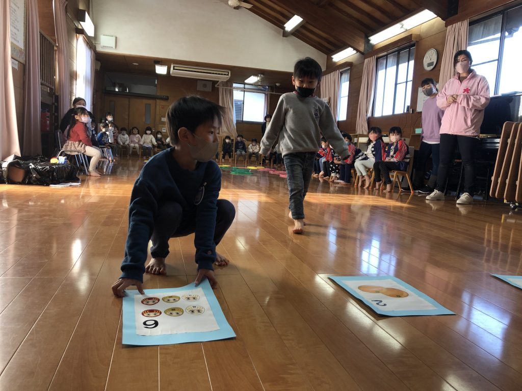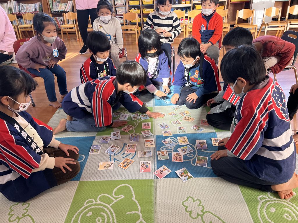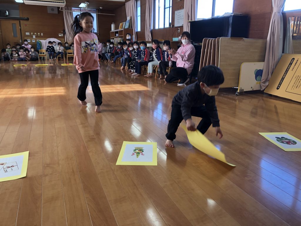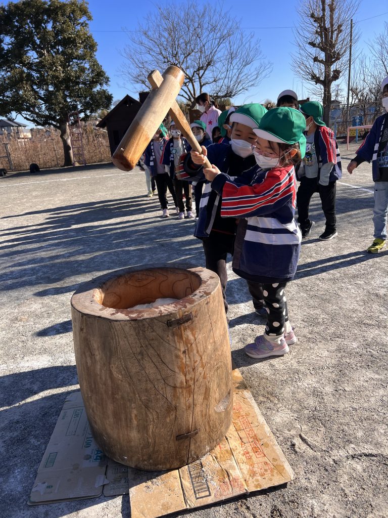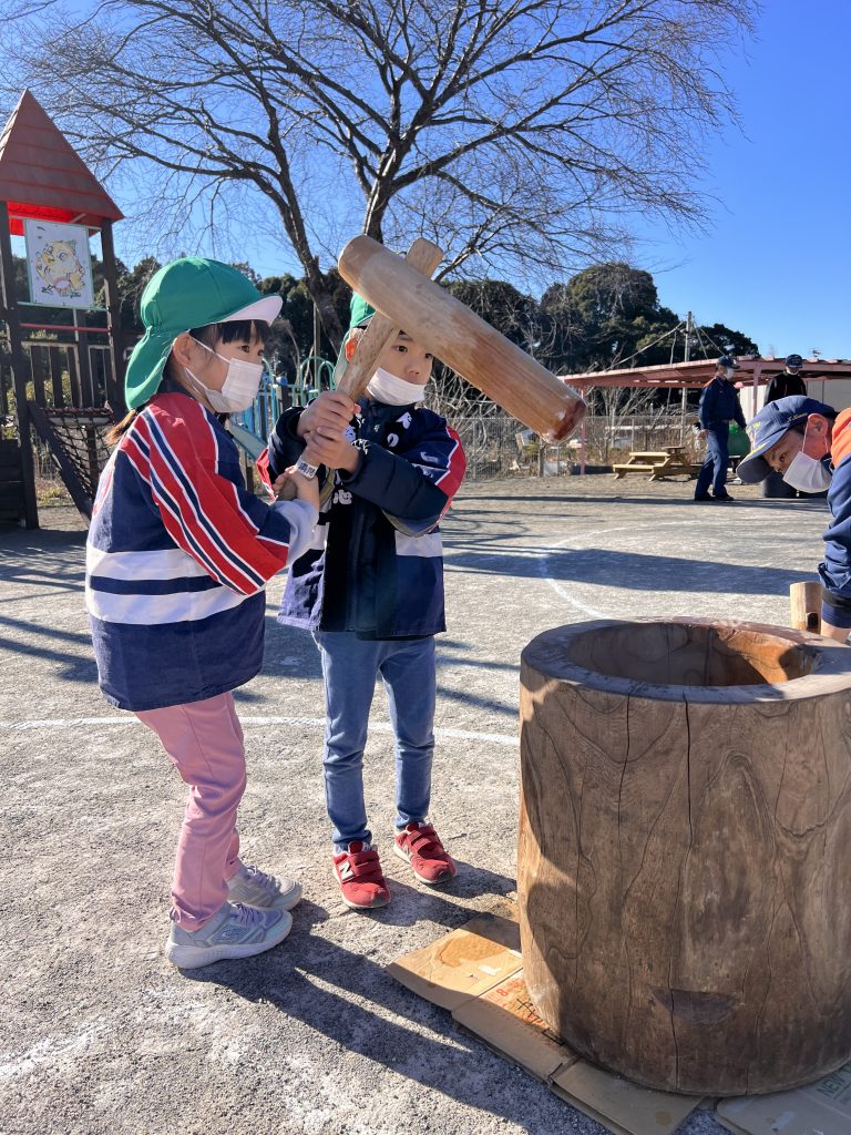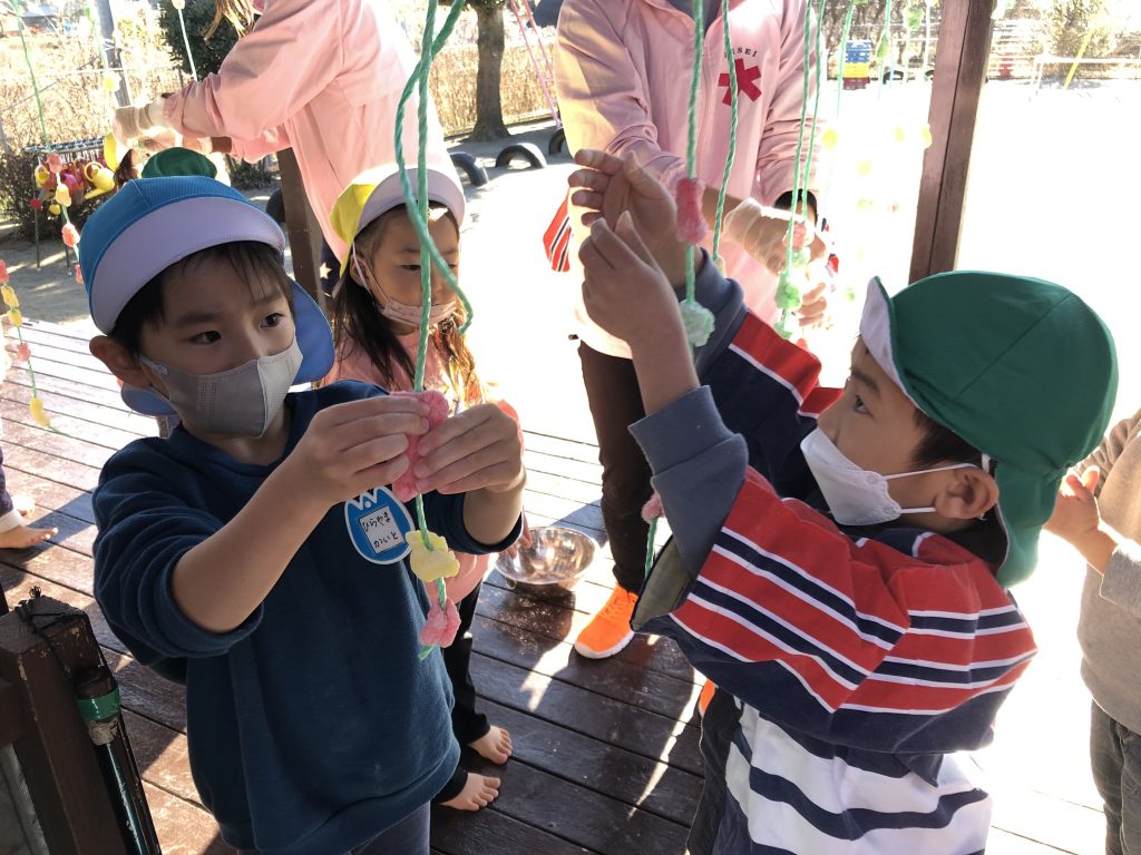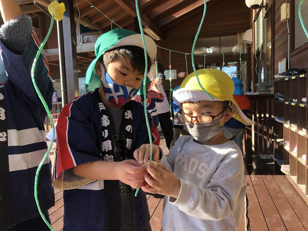 今日は防火餅つき会!消防の方のお話を聞き、「火事だ!」と言う子どもたちの掛け声に合わせて初期消化訓練を行いました。その後、消防の方とにじ組さんで力を合わせて餅つきをしました。テラスでは保育園のお友だちが「よいしょ!よいしょ!」と応援してくれてまゆ玉作りに使う餅が出来上がりました。つきさん・そらさん・にじさんみんなで協力して赤、黄色、緑の色鮮やかなまゆ玉を作ることができました!最後にお正月にちなんだカード取りゲームやカルタ大会をして、楽しいひと時を過ごしました。