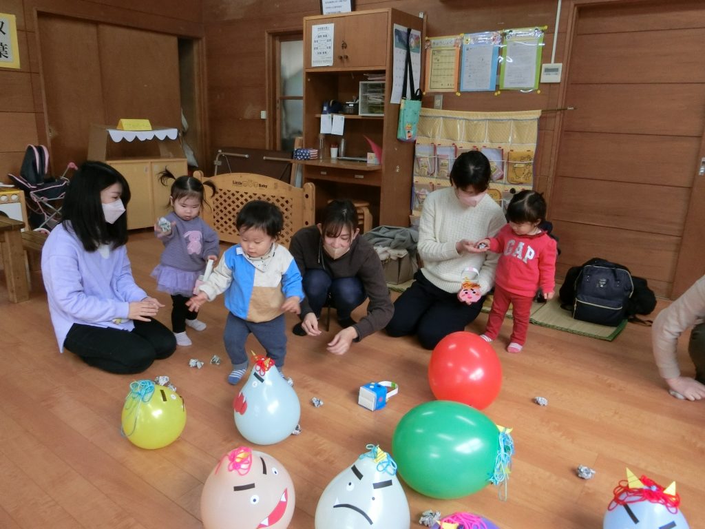 風船の鬼で豆まきごっこ!!新聞紙を丸め「豆」の出来上がり〜「鬼は〜外!」たくさんの風船鬼を追いはらいました。