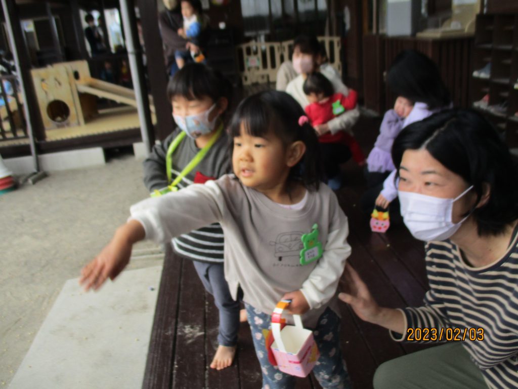 3年ぶりに、園行事の豆まきパーティーに参加することが出来ました。前回の活動で作った升に豆を入れて、園児と一緒に鬼退治をしました。迫力ある鬼に驚いてしまいましたが、豆をまいて鬼を追いはらいました。