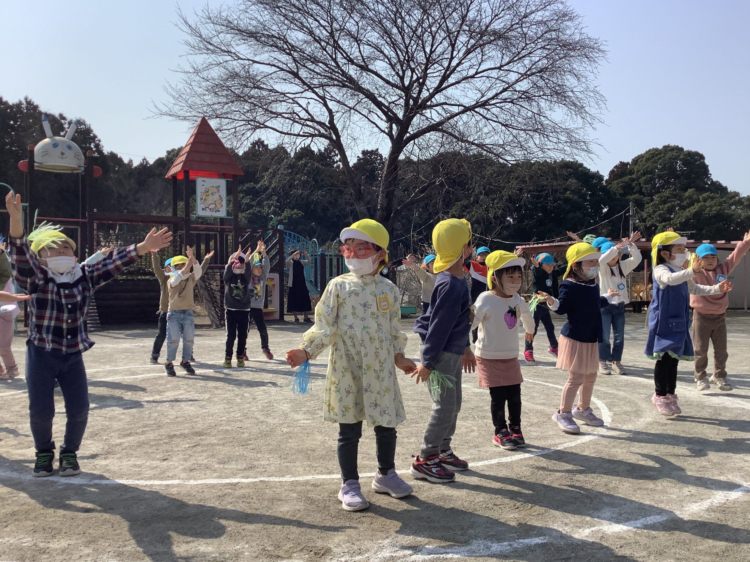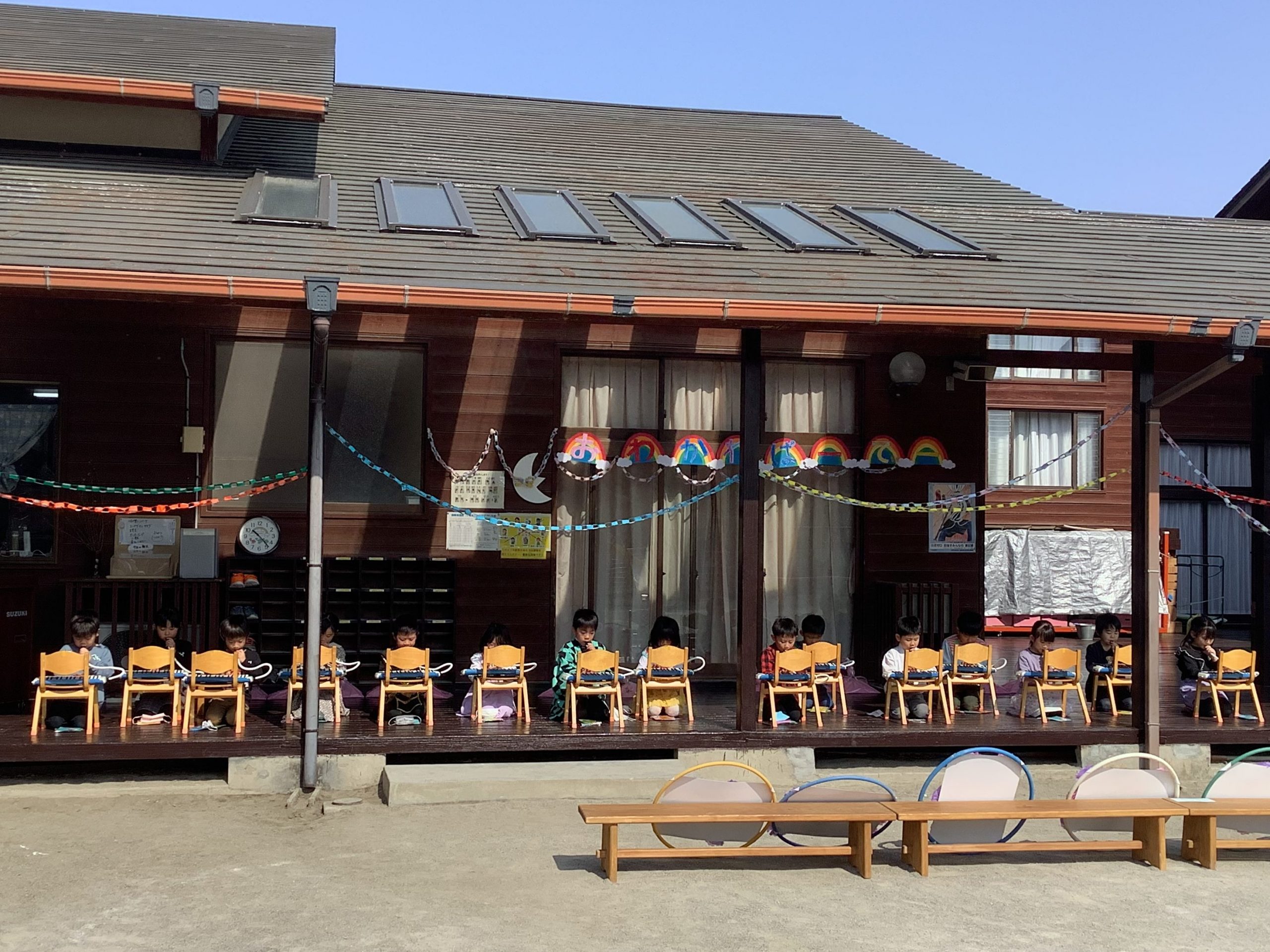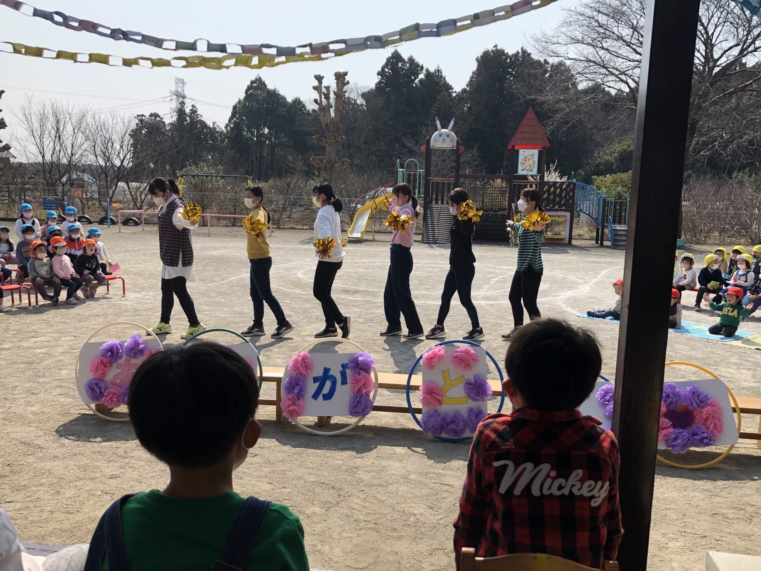 今日は年長さんとのお別れパーティーがありました。つきさん、そらさんで気持ちを込めて作った輪飾りで飾り付けをしてパーティーがスタート!まずはじめは、つきさん、そらさんからダンスのプレゼント。それから年長さん一人一人にそらさんから素敵なプレゼントを渡しました。年長さんからも、歌・メロディオンとみんなに手作りのプレゼントがあり、最後は先生たちからのダンスのプレゼントで盛りあがりました!それぞれが感謝の気持ちを伝え合う温かいお別れパーティーとなりました。