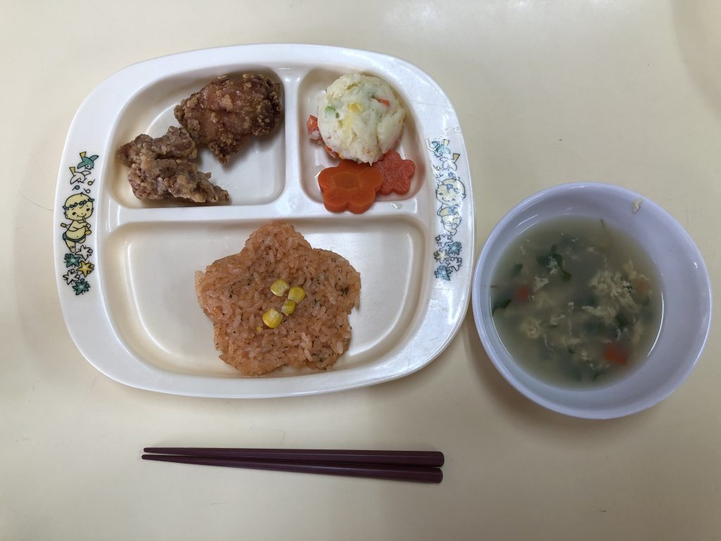 3月は5歳児の希望メニューが入りました。今日のパーティーの唐揚げはその一つ、それぞれの味を笑顔で味わっていました
