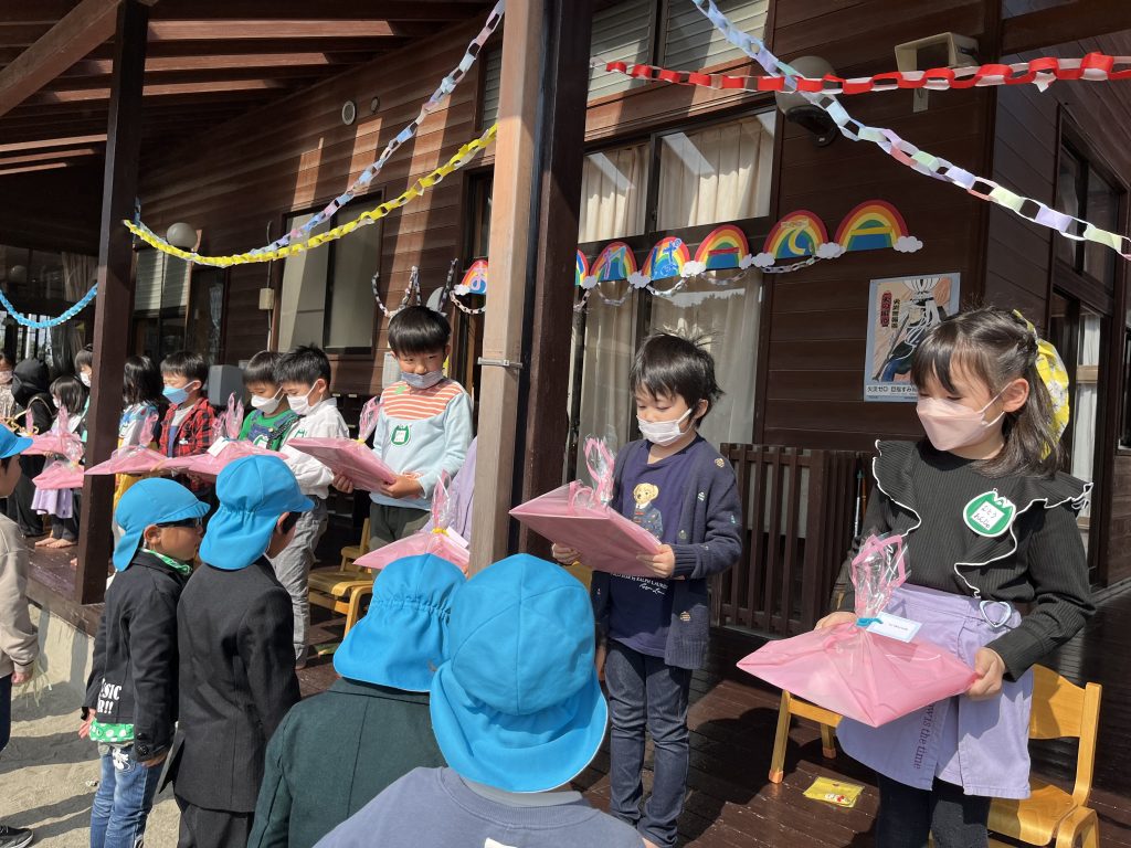 「かっこいい小学生にになってね」とそら(4歳児)さんからにじ(5歳児)さんへ、素敵な手作りのプレゼントを渡しました!