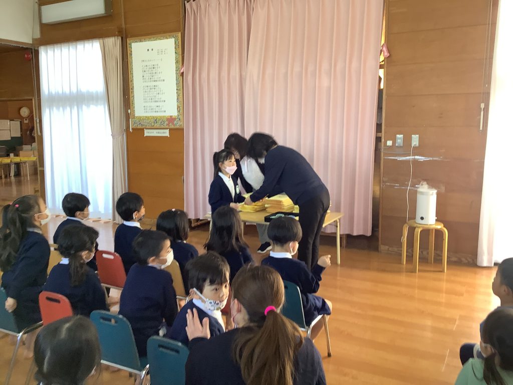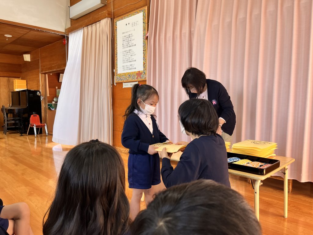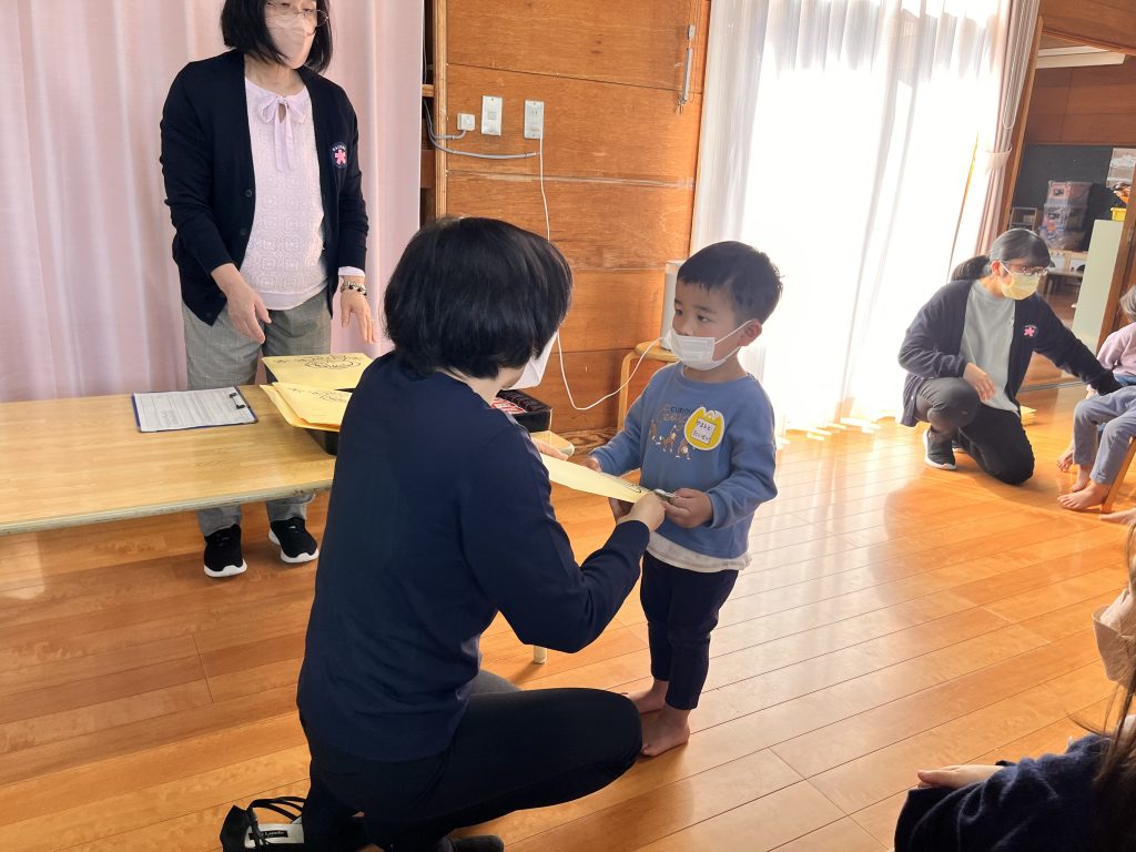今日は心待ちにしていたジャンプの日。園長先生に新年度に使う名札をつけてもらうと、とてもうれしそうにしていました。一つ大きくなる喜びと誇らしげな姿が見られました。進級に向けて準備をしながら、無理のないスタートがきれるようにしていきます。