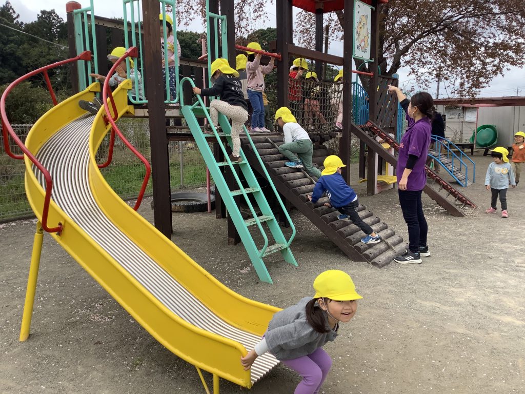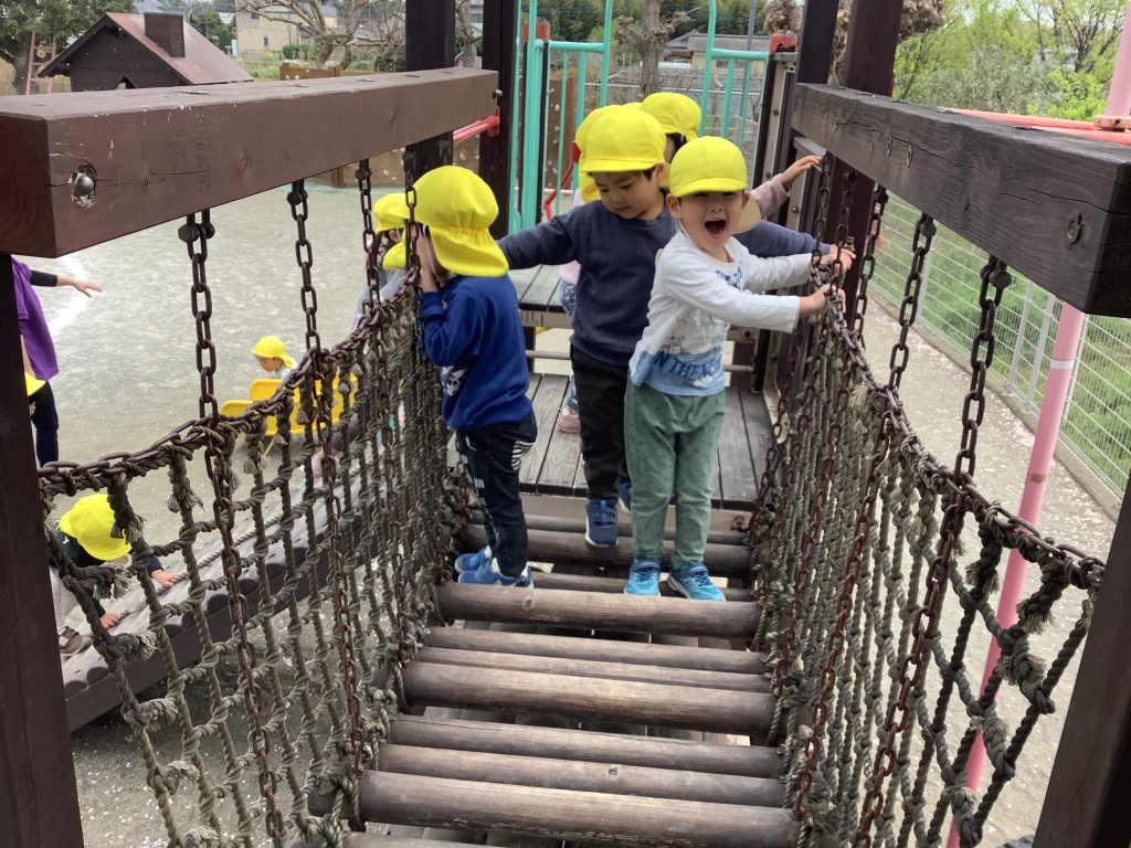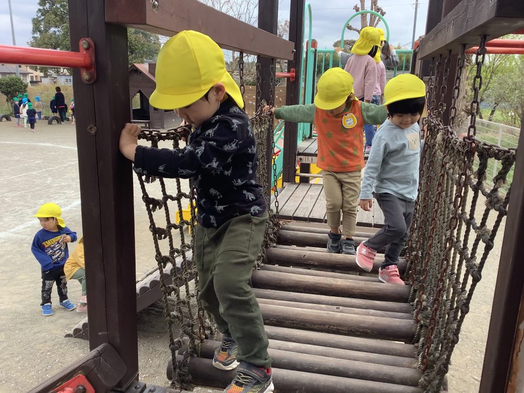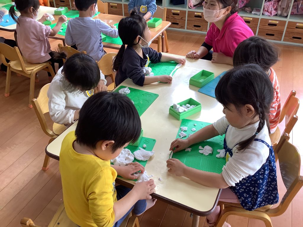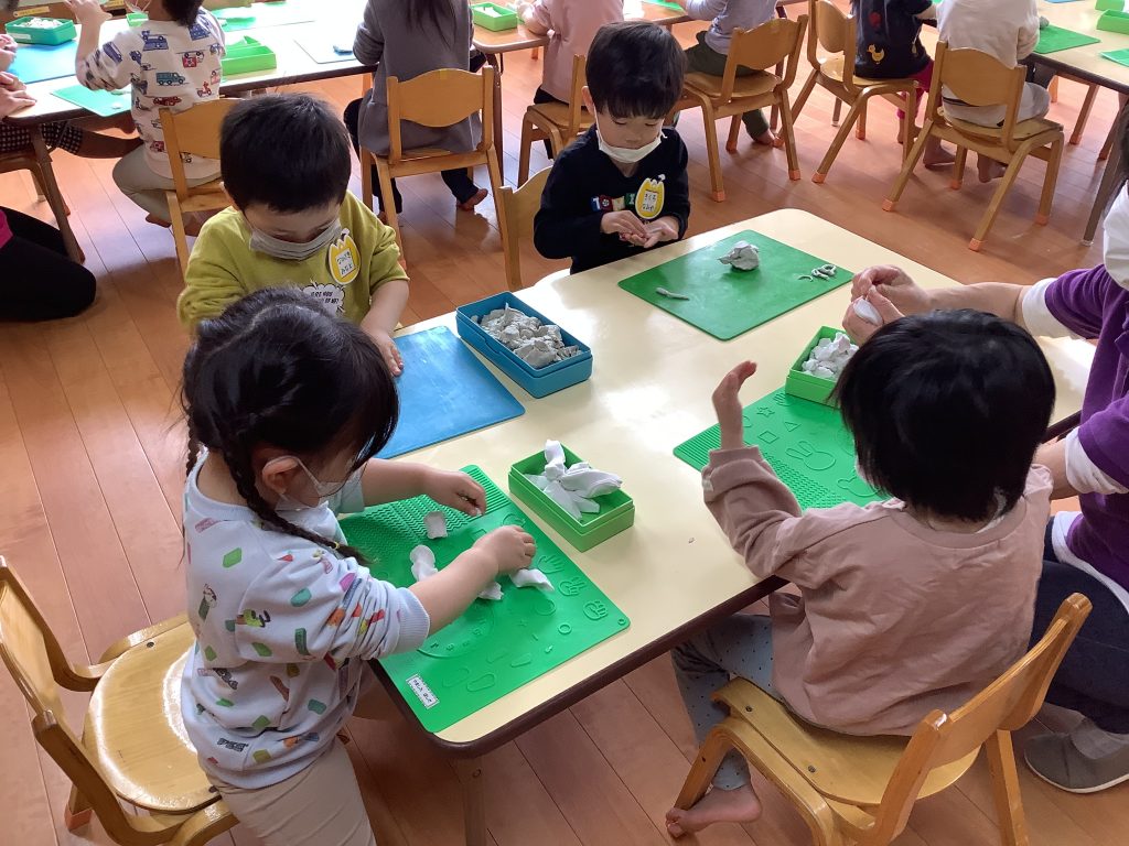 つきさんになってできる総合遊具に夢中の子どもたち。園庭にでると、「すべり台やる」「橋わたりたい」と真っ先に向かっていきます。また、ロッカーの引き出しからうれしそうに取り出したのは粘土!「へびにしようかな?」「おだんごつくろうかな?」と自分の粘土をこねながら色々な形を作っています。