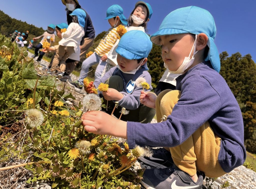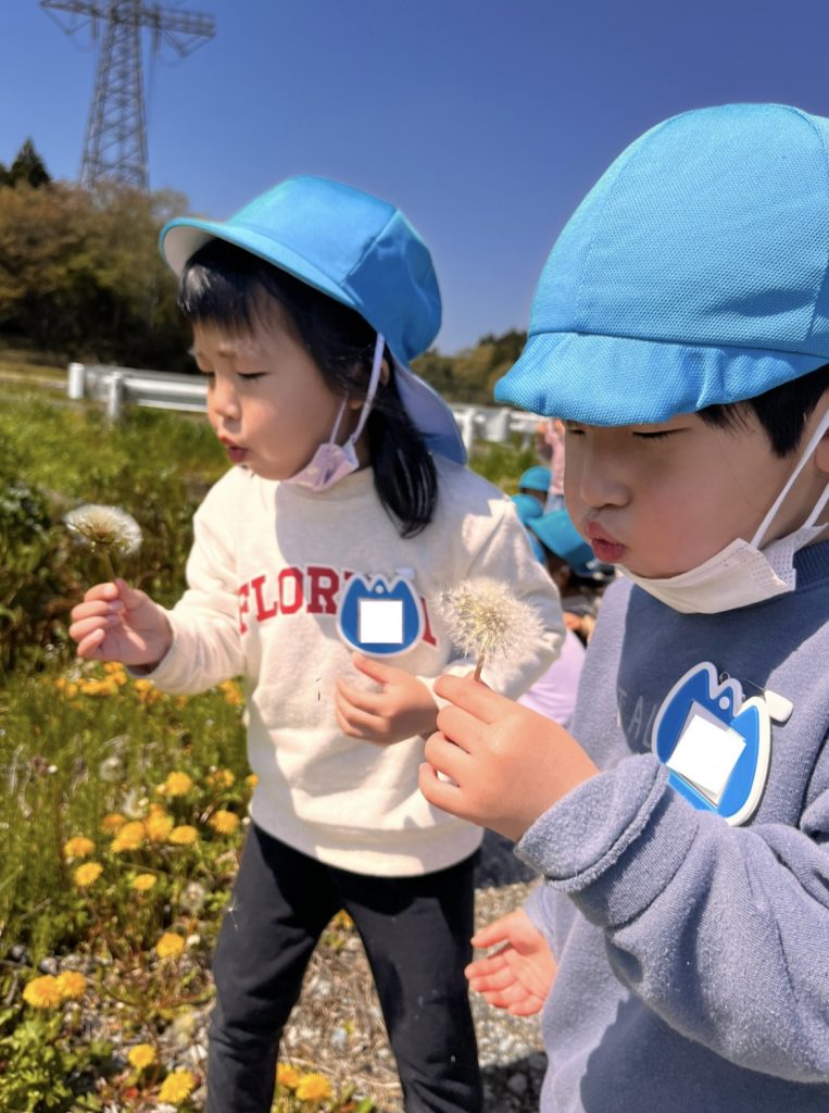 絵本“14ひきのぴくにっく”を見て「私たちも春を探しに行こう!」と、そら組になって初めてのお散歩に行きました。あぜ道一面に咲くたんぽぽを見て、息を吹きかけて綿毛を飛ばしたりたんぽぽの花束を作ったりと大興奮の子どもたち。「カエルの卵あるかな〜」と田んぼや水路を探したり、つくしや菜の花も見つけてたくさんの春を発見することができました。保育園に帰ってくると、とってきた草花でケーキ作りやアイスを作って遊ぶ姿が見られました。