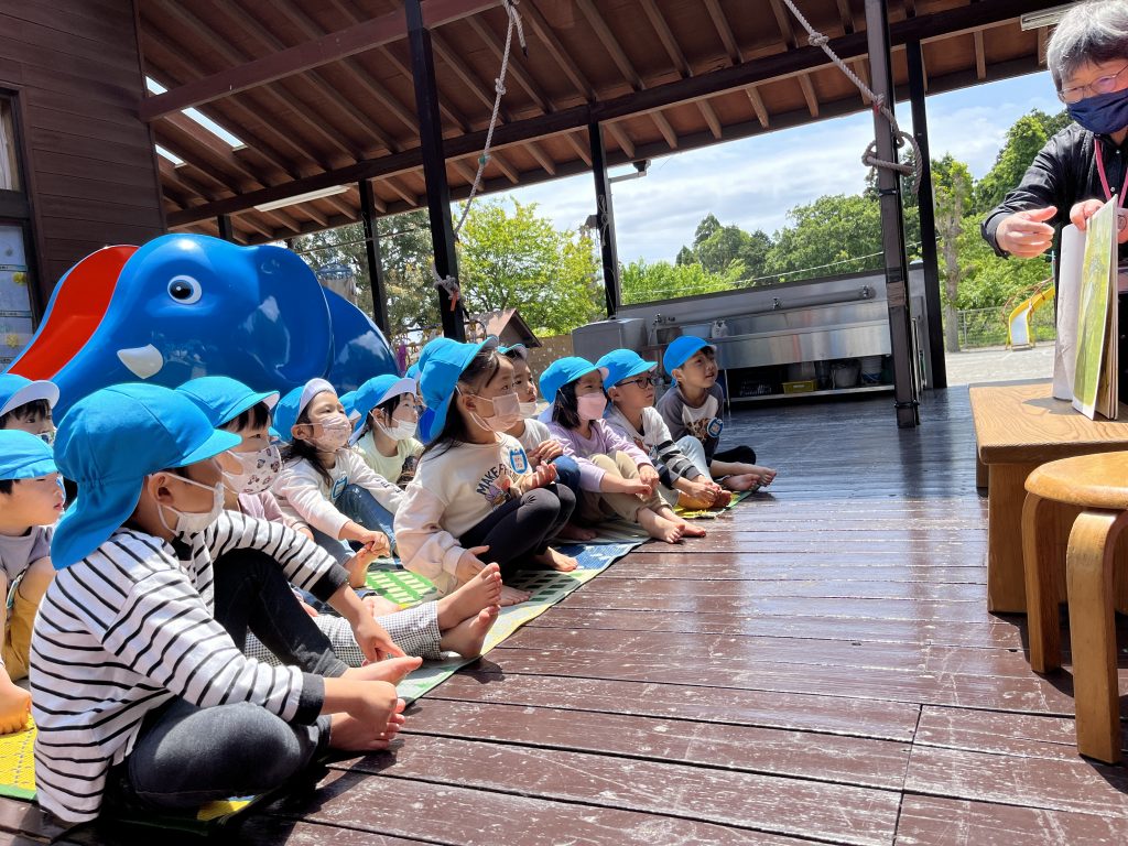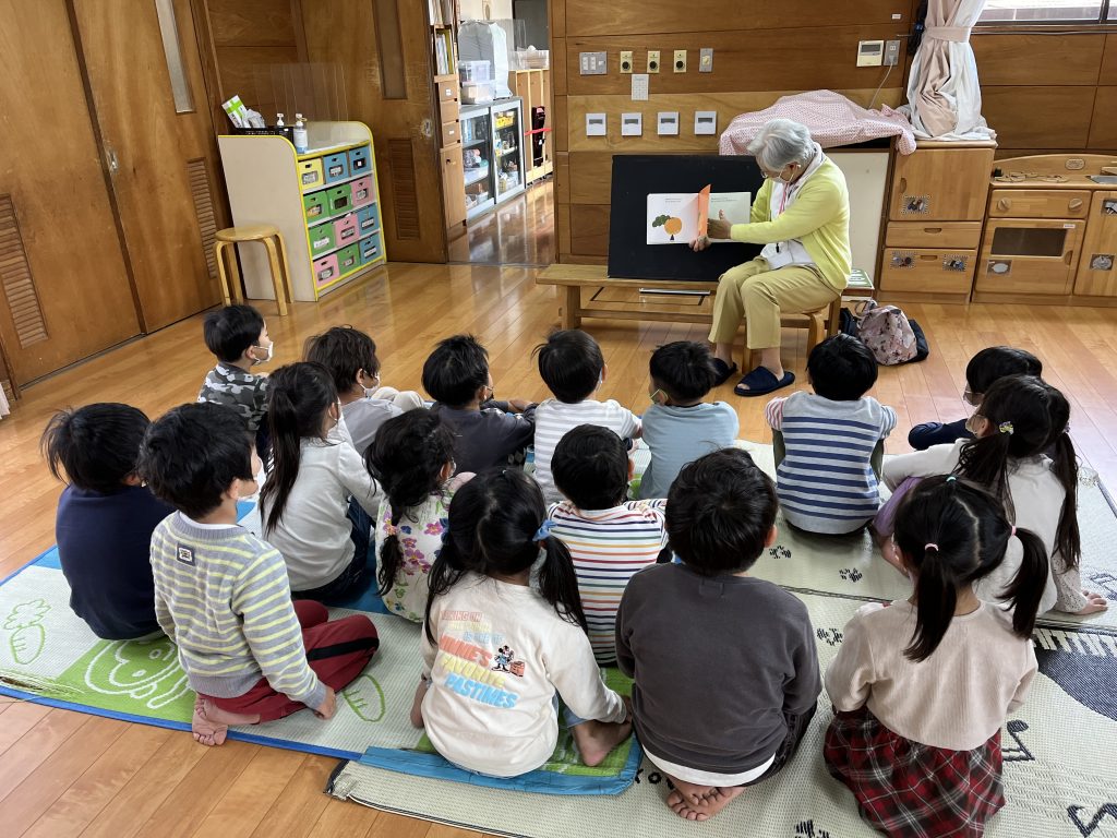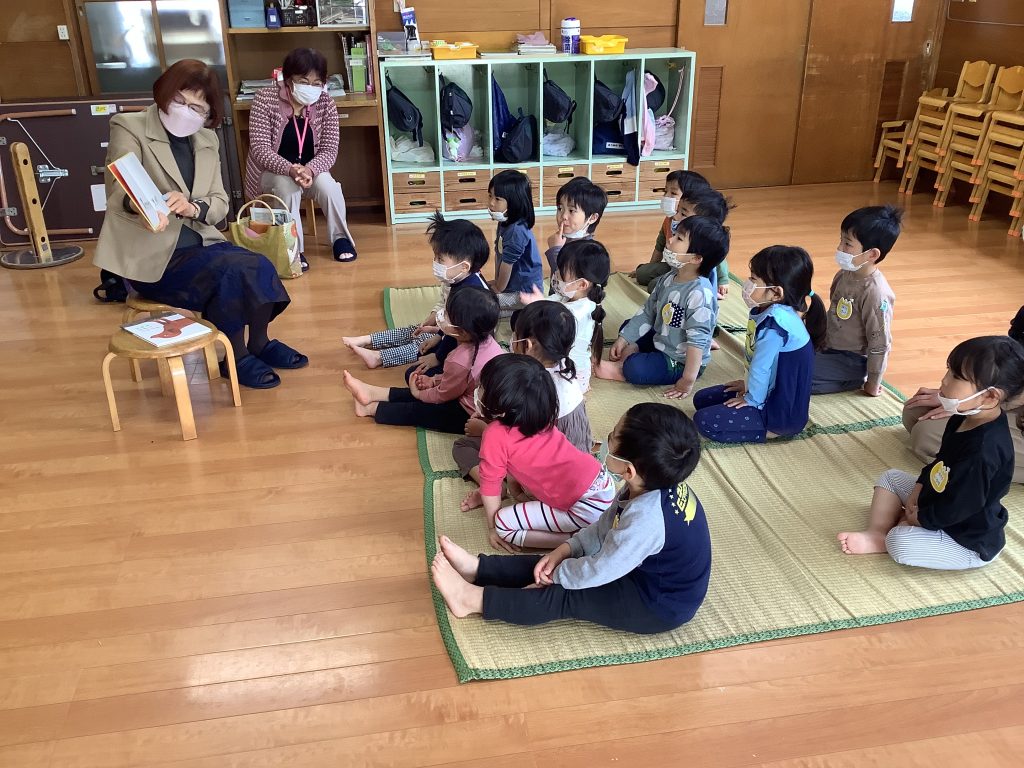 ルピナスの方が保育園にきて絵本や紙芝居をよんでくれました。素敵で優しい読み聞かせの声に心をつかまれ、その物語の世界観に引き込まれる子どもたちの姿がありました。