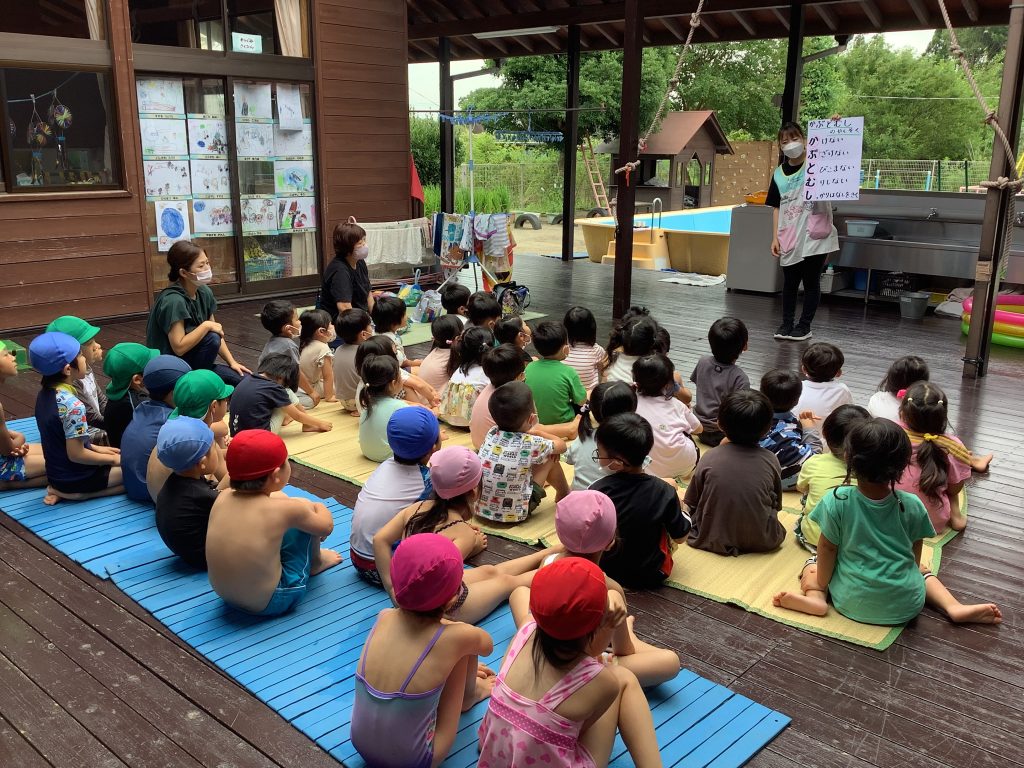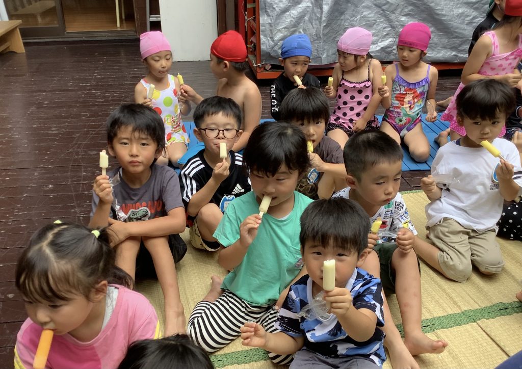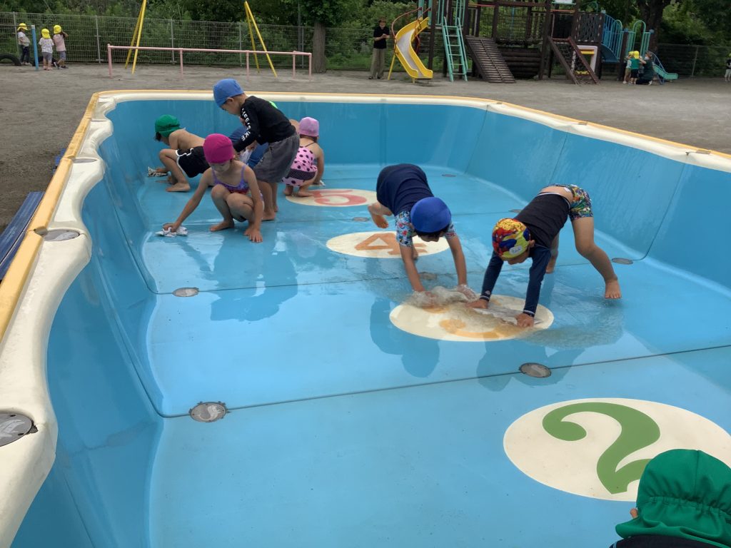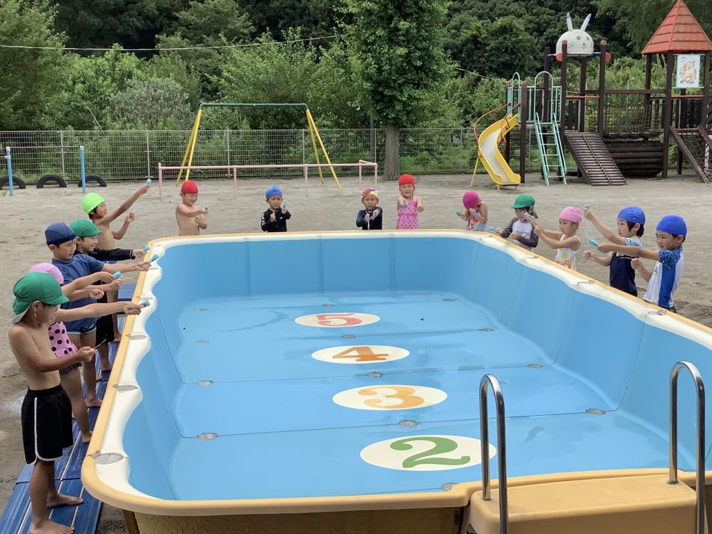 7月13日はプール開き! プール開きの前に年長さんがプールをお掃除してくれました。プールに入る前のお約束や、“かぶとむしのやくそく”をみんなで確認した後、奇麗になったプールで、水の神様に「けがなく安全に水遊びができますように」とお祈りをしました。そしてにじ組さん(年長児)もクラッカーで安全祈願!最後にお楽しみのアイスを食べて笑顔あふれるプール開きになりました。