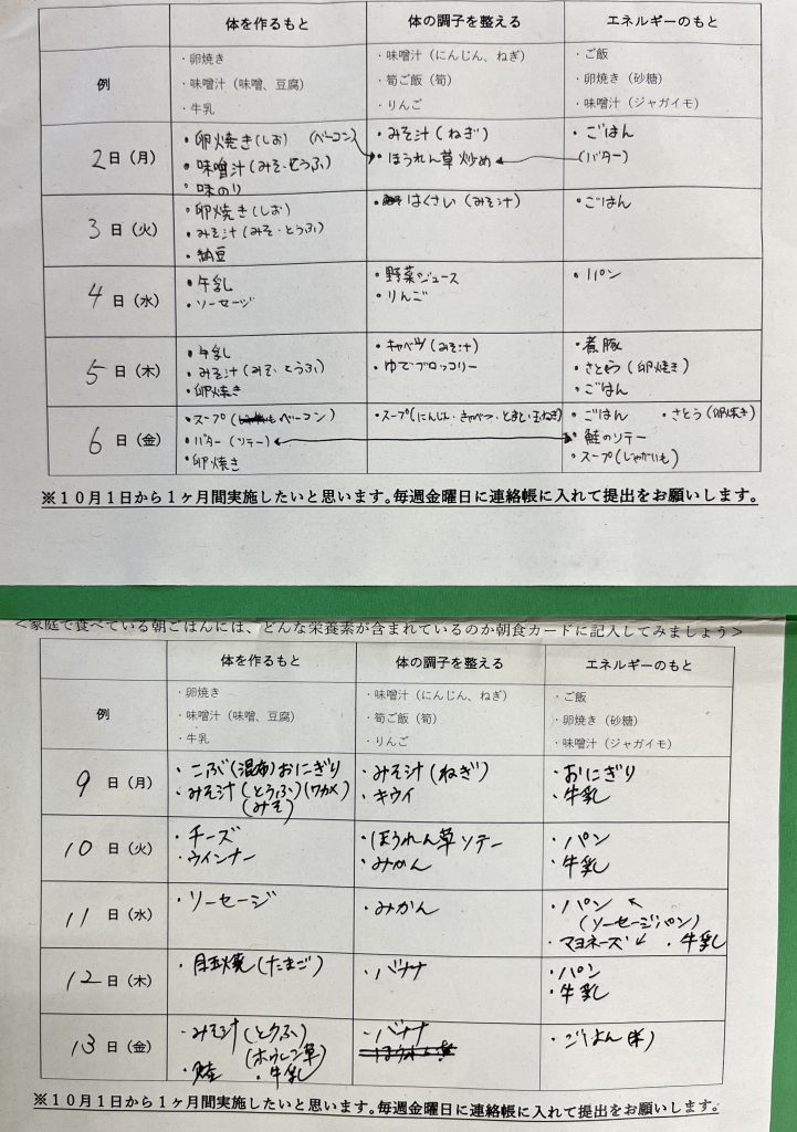 10月の給食目標は「朝ごはんをしっかり食べよう」です。目標に伴い10月2日から朝食カードを実践して一週間が経ちました。お忙しい中ご協力くださりありがとうございます。一週間実施してみて三大栄養素をもとにバランス良く食べているご家庭が多くありましたので朝食の内容を一部紹介したいと思います。