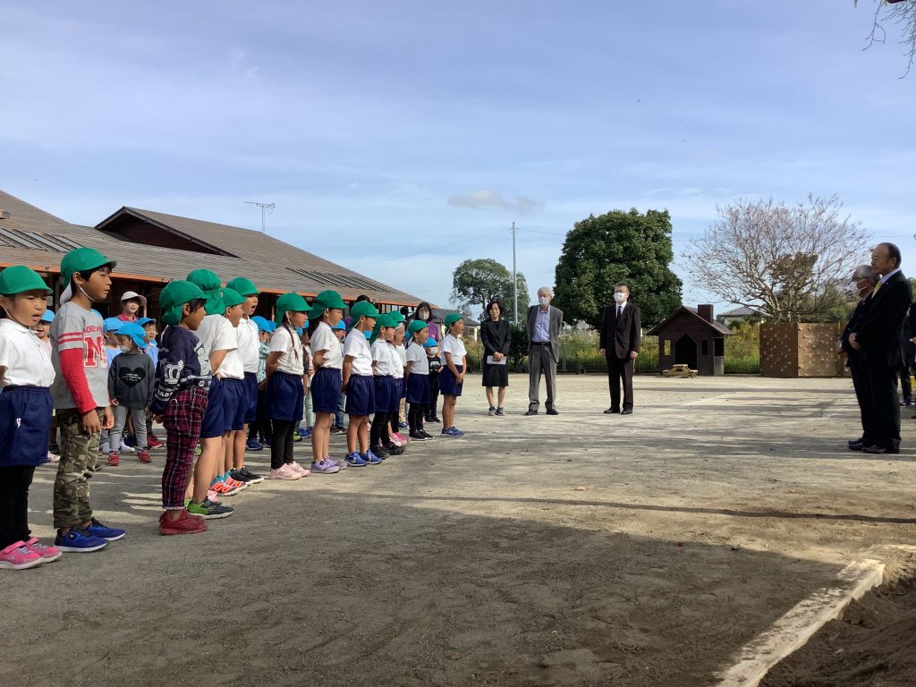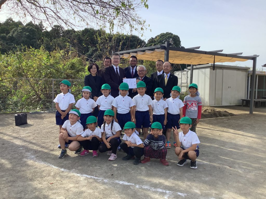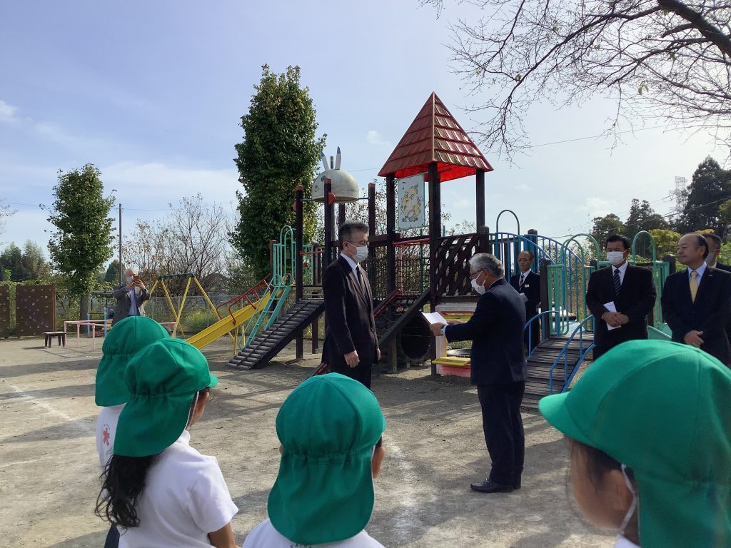 先日、浅川建設様から新しい砂場の屋根「パーゴラ」を寄贈していただき、今日はその贈呈式が行われました。