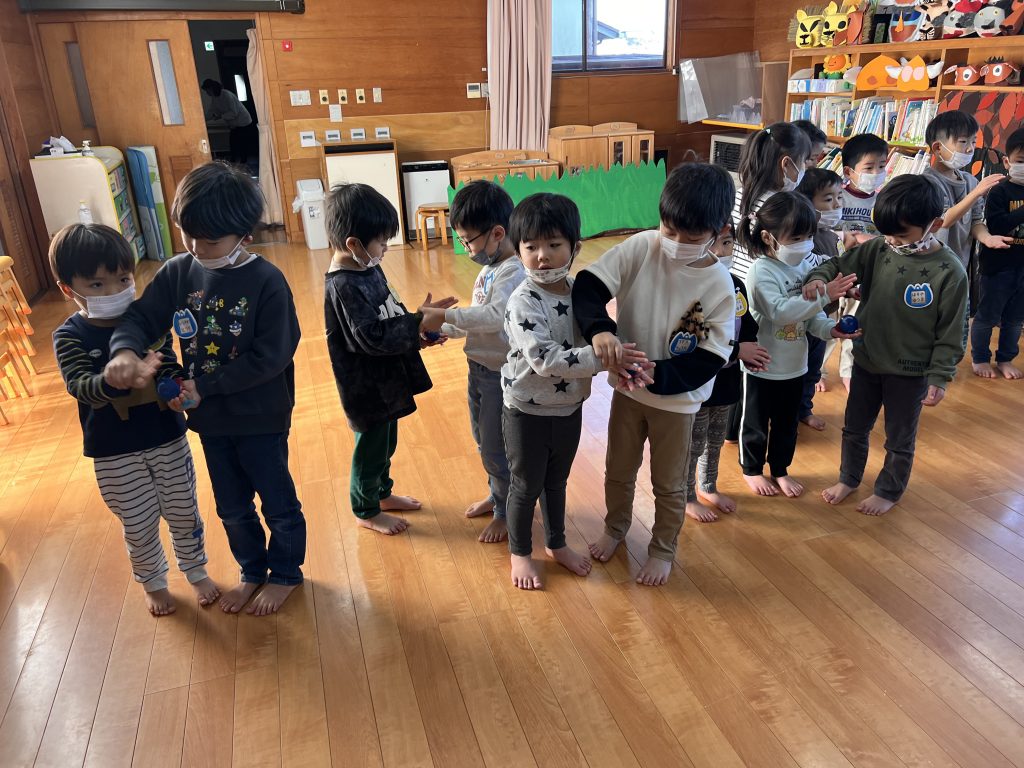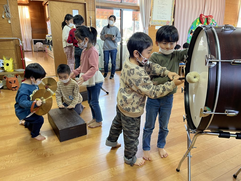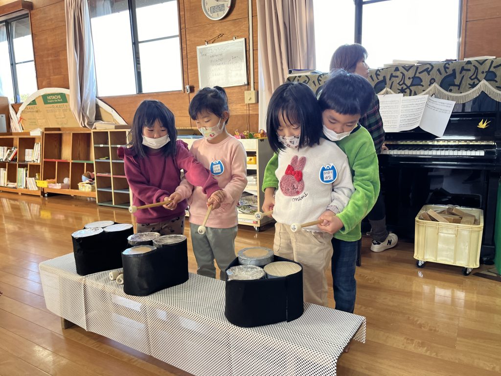 にじ組さんがそら組さんに合奏,メロディオン,「ライオンキング」の劇を、教えてくれました。「こうやるんだよ」「一緒にやってみよう!」と優しく丁寧に教えてくれました。年長さんに教えてもらったことをきっかけにそら組さんもつき組さんに、合奏と「むしたちのおんがくかい」の劇を教えていました。