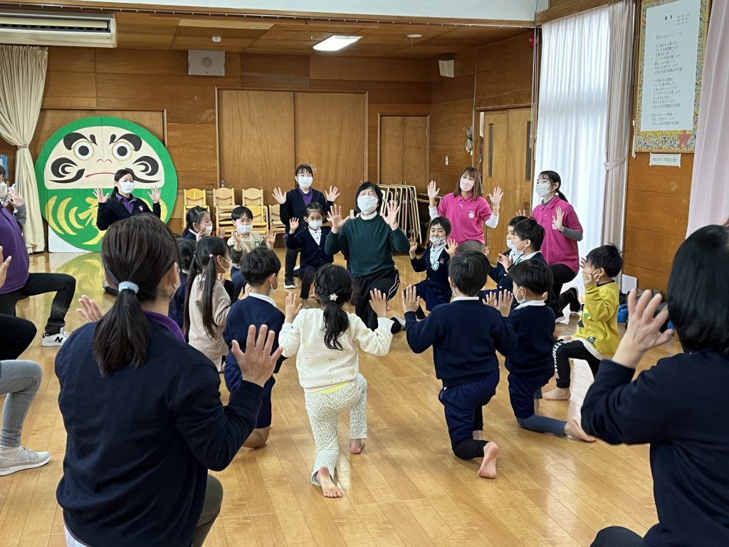 5歳児年長児と職員一緒の研修が行われました。ピアノと声かけを全身で受ける子どもたちと、頭で理解して動きにつなげる職員のあいだの反応の違いを指導者(生井沢先生)は見抜いていました。一人ひとりをしっかり見てもらい、たくさんの褒めことばと緊張の良い時間となりました。