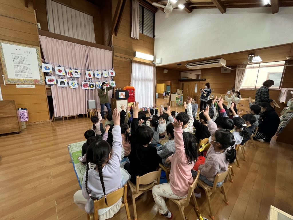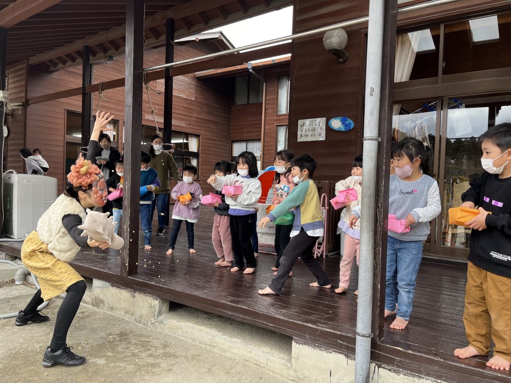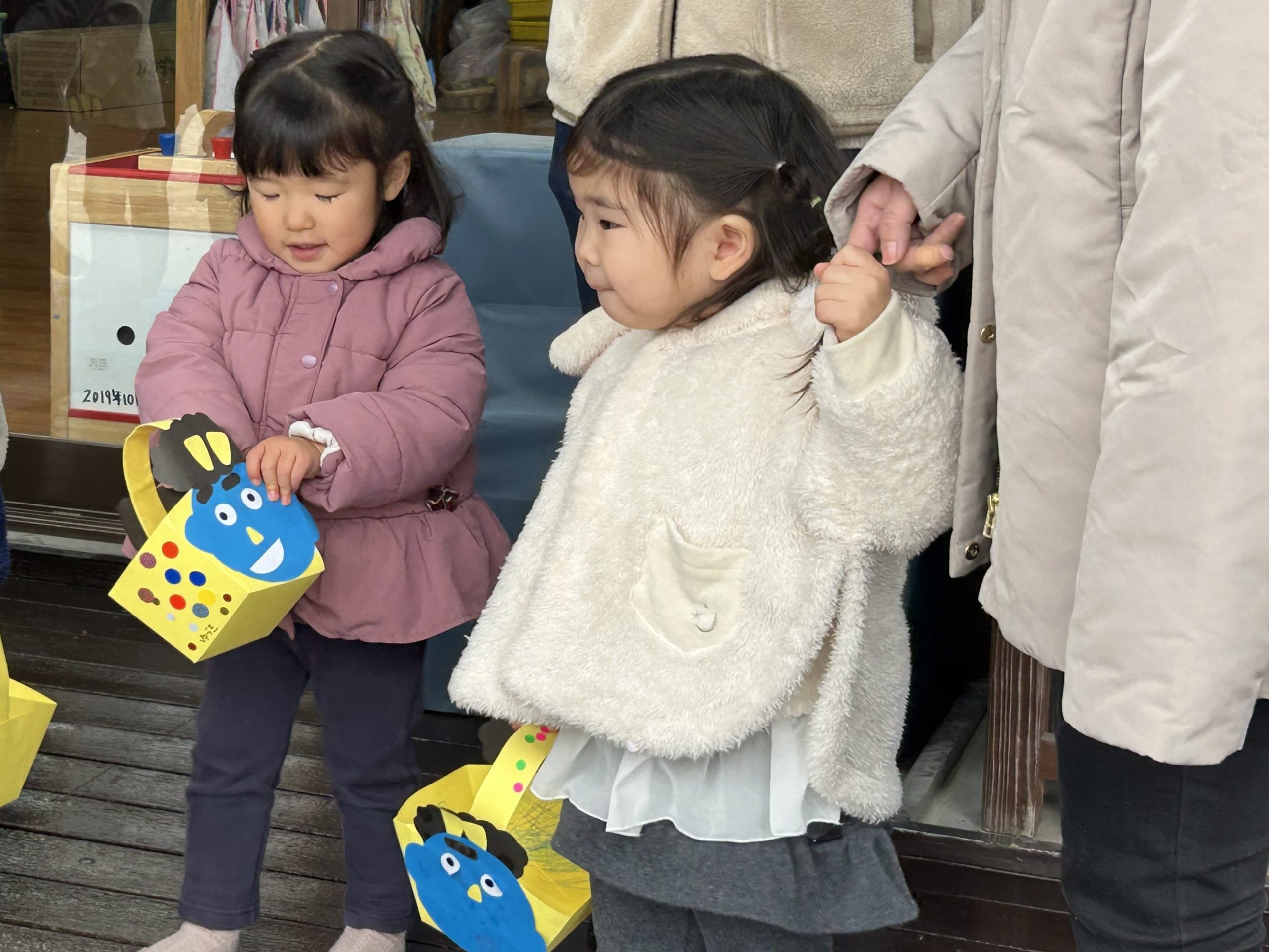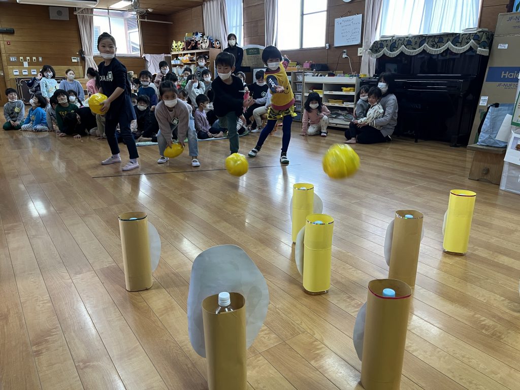 2日の豆まき会では、節分の由来の紙芝居を見た後にクイズをしたり、ボーリングゲームを行いました。