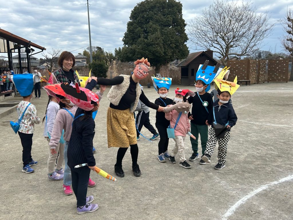 その後保育園に鬼が登場!年長さんを筆頭にみんなで力を合わせて「鬼は〜外!福は〜内!」と、元気な掛け声で豆をまき、無事に鬼を退治することができました。