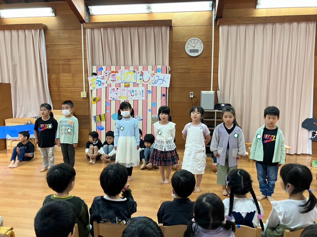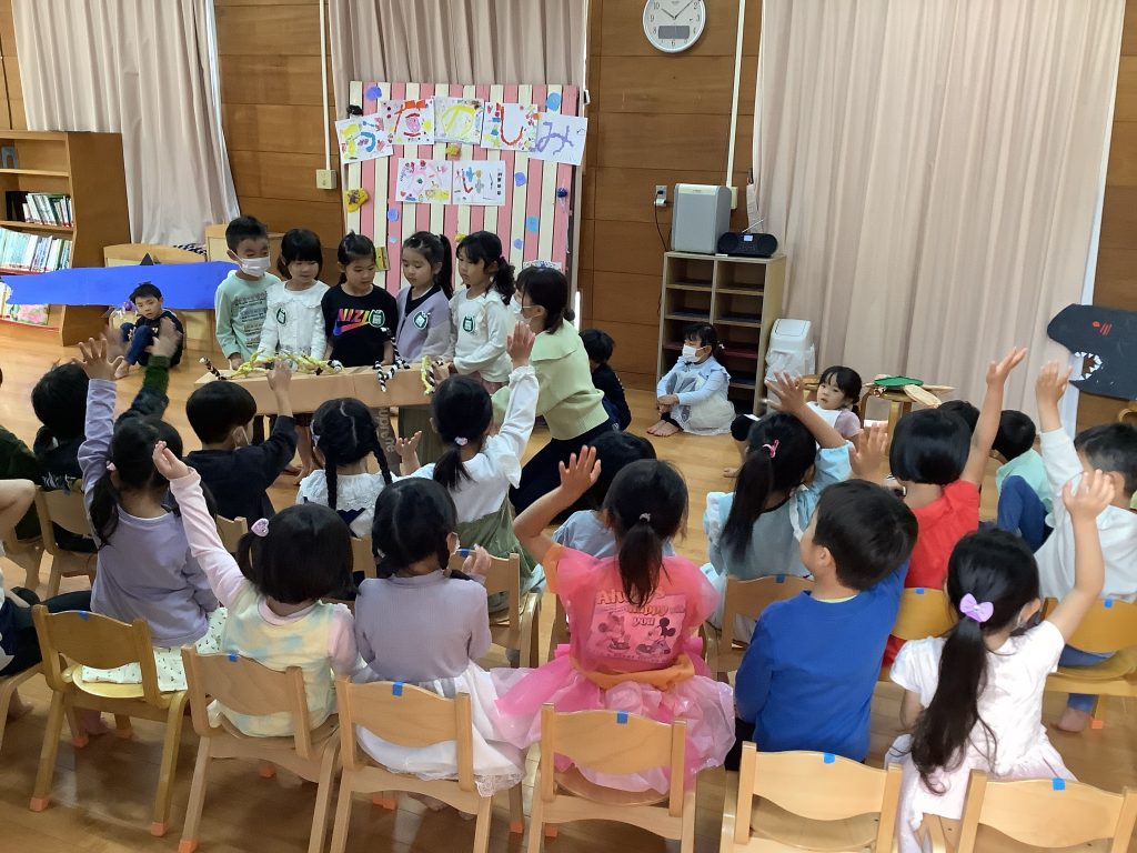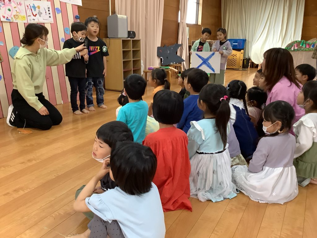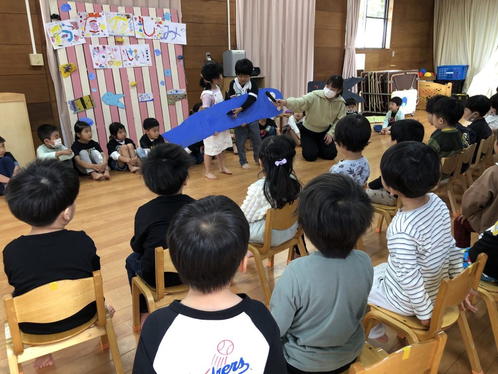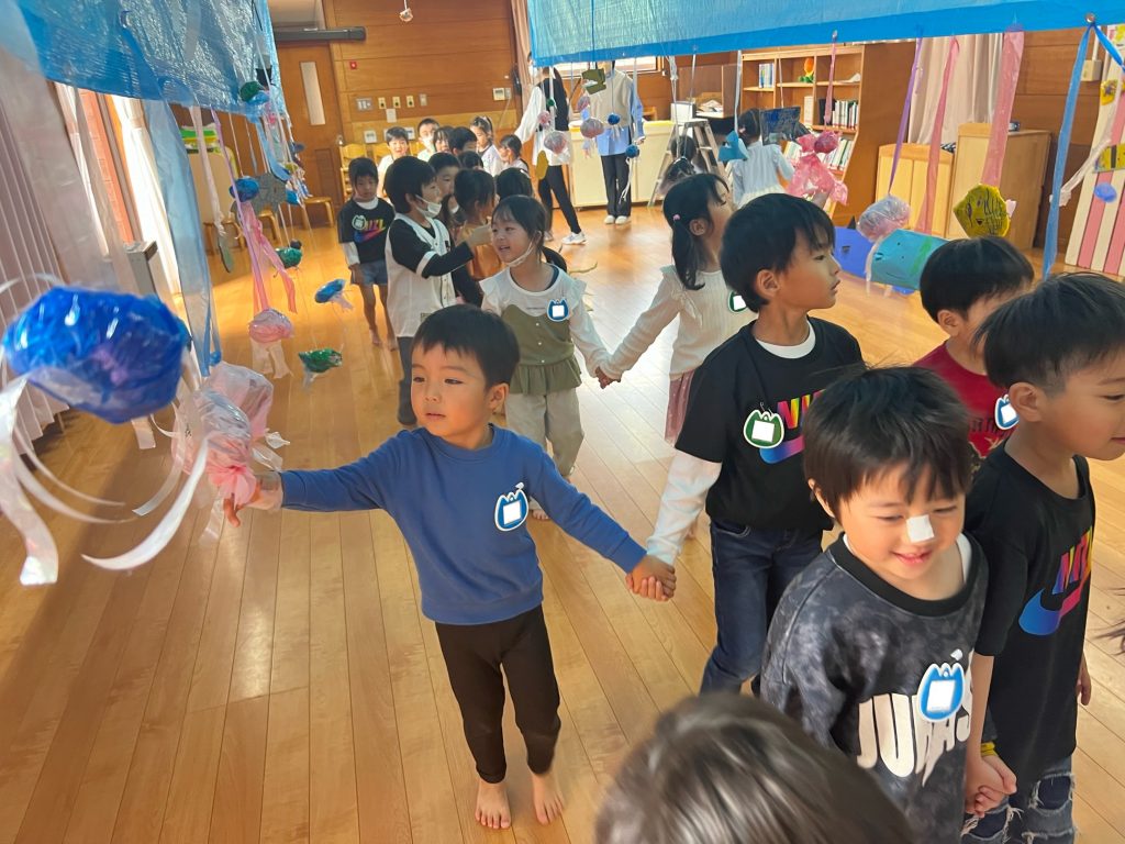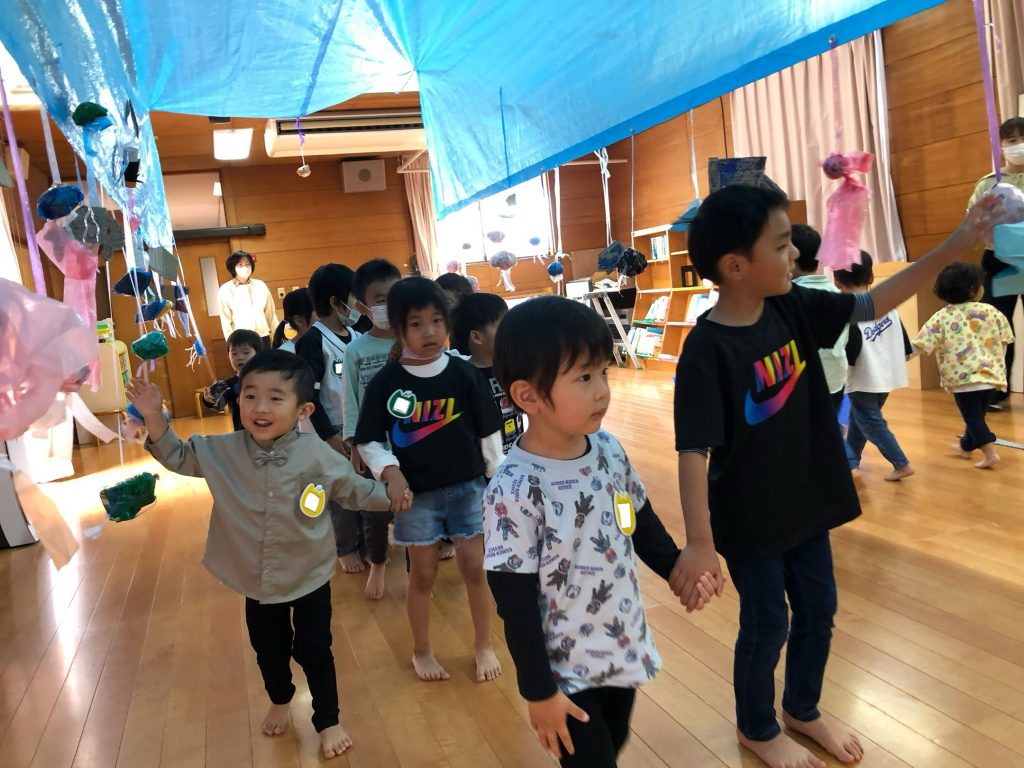 心待ちにしていたお楽しみ会!年長さんが水族館に招待してくれました。初めに、年長さんが作った様々な海の生き物を紹介してくれました。それぞれ工夫して作った魚たちをたくさん紹介してくれました!その後はにじ組さんが考えたクイズゲーム!つき組さん、そら組さんに楽しんでもらえるような問題を考えて出題してくれました。つき組さんもそら組さんもよ〜く考えながら答えていました。最後に、にじ組さんのお魚トンネルに招待してもらい子どもたちも目をキラキラさせながら年長さんの作ったトンネル探検を楽しみました。