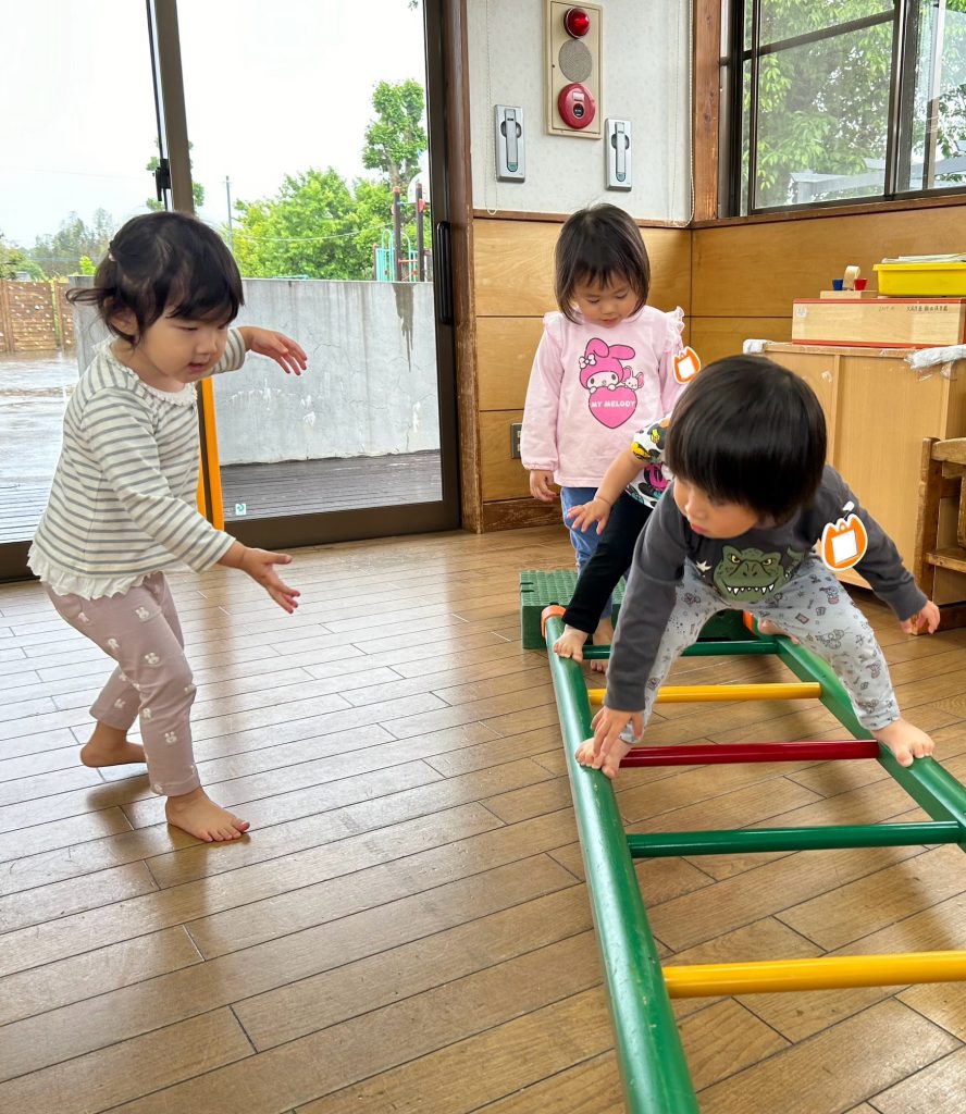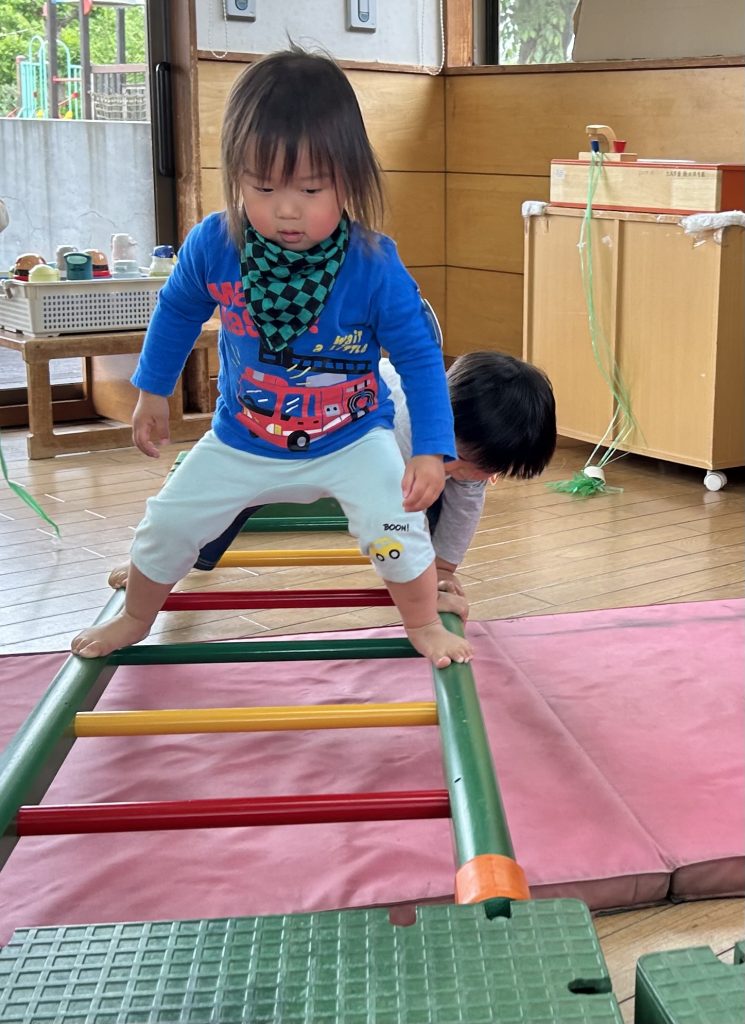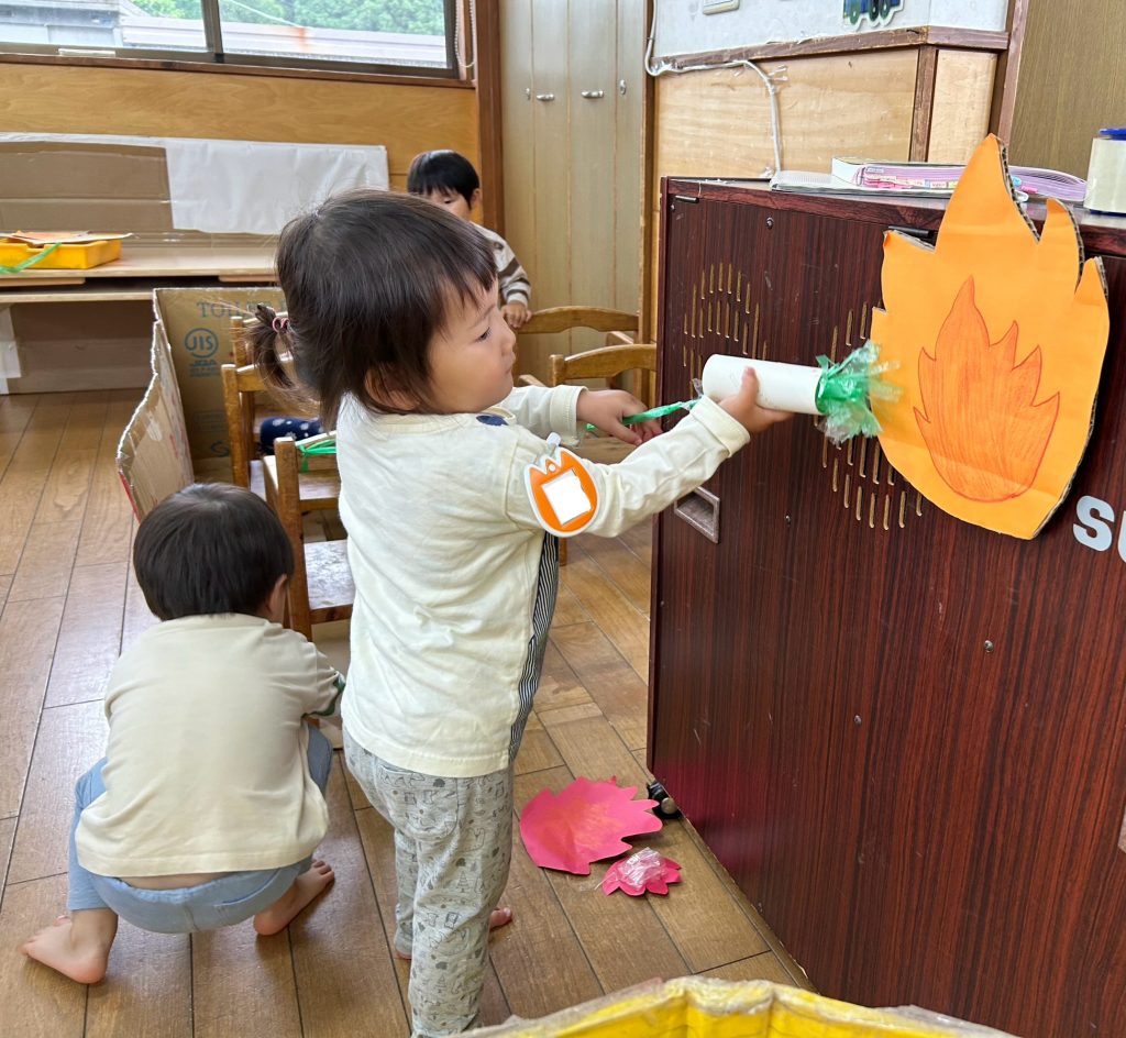 消防車が大好きな2歳児のお友だち!!「火事だ〜」と言って火を消すまね事からごっこ遊びへとつながっています。火を怖がらず、たくましい消防士さんが出動中!!子どもたちの思いを受け止め、遊びこめる環境を整え、更に発展させていきたいと思います!!