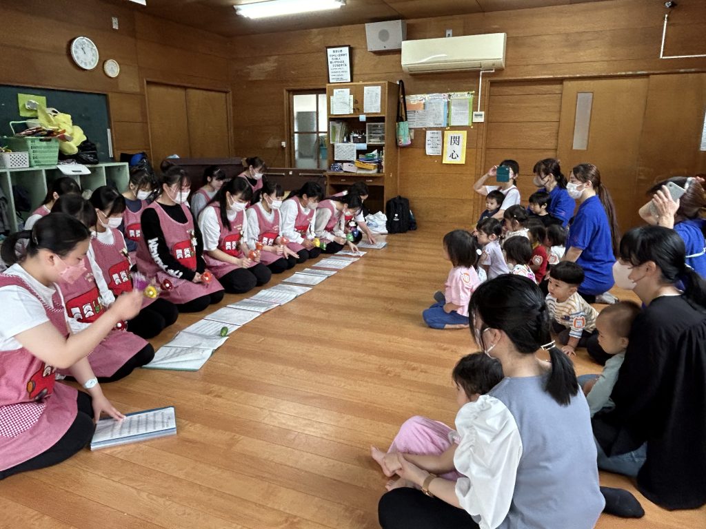 茨城女子短期大学の馬立ゼミの学生さんが遊びに来てくれました。今回は、保育園の2歳児さんもぬかっぽさんと一緒に参加し、手遊びや歌、いろいろな楽器に触れ音の音色を感じたり、身体をたくさん動かし盛りだくさんの活動を楽しむことが出来ました。