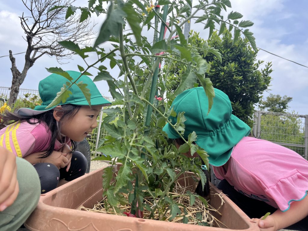 「トマトがこんなにたくさんなってるよ!」、「ピーマンが大きくなってきた〜!!」と成長の喜びを友だちと共有しています。