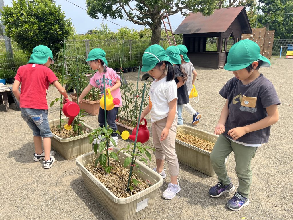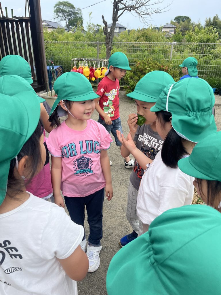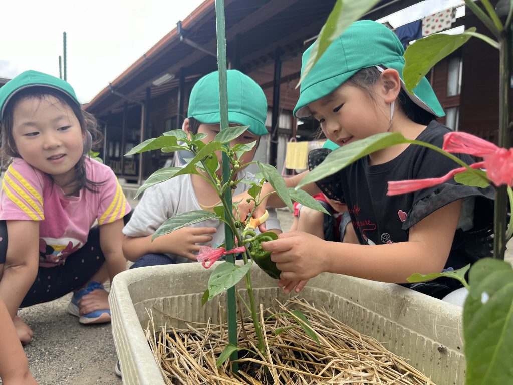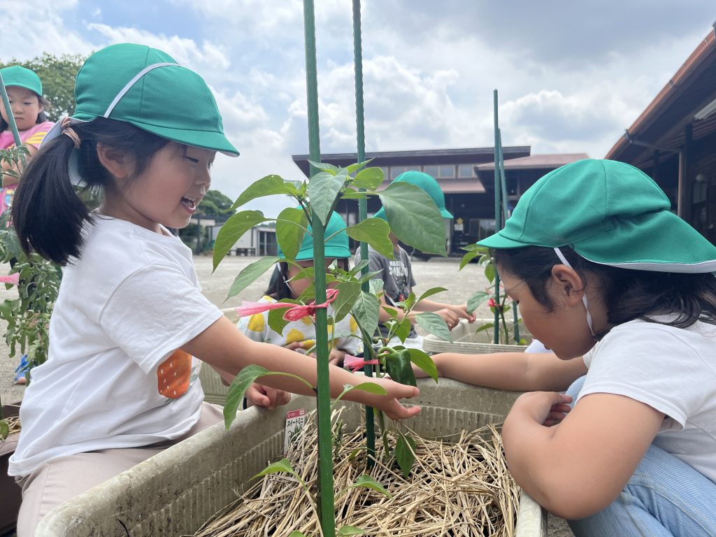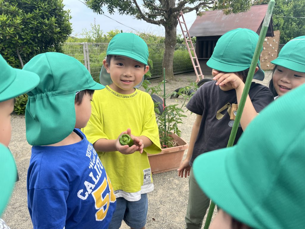 5月の初めに苗植えした野菜たちが大きくなってきました!毎日水やりや草とりをして野菜の成長を見守ってきた子どもたち。そんな中、ピーマンが収穫できる大きさに…!!「そろそろとれるよね」とついに初めての収穫が行われました!