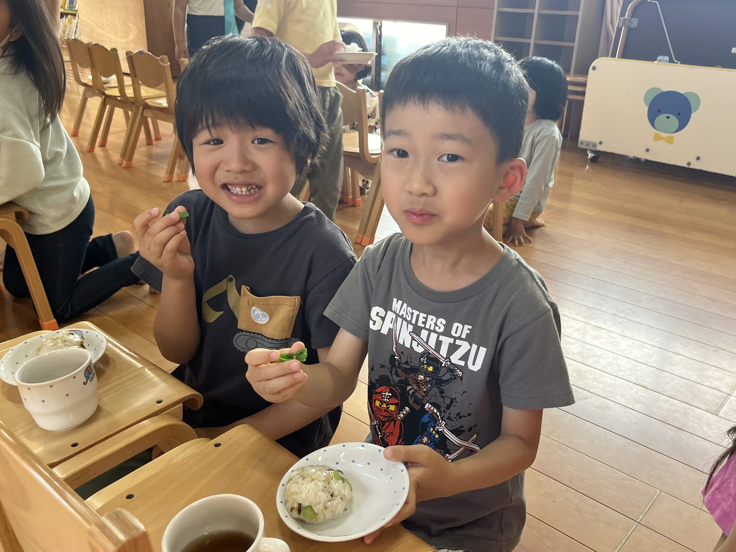 収穫したピーマンはクラス分に切ってもらっておやつに食べました。ピーマンが苦手な子も、お友だちと一緒に採れたてのピーマンを食べてみると「苦いけどおいしい!」と素材そのものの味をよく味わいながら食べる姿が見られました。また、「トマトはどんな味がするかな」と、その他の野菜への関心も一層高まってきました。