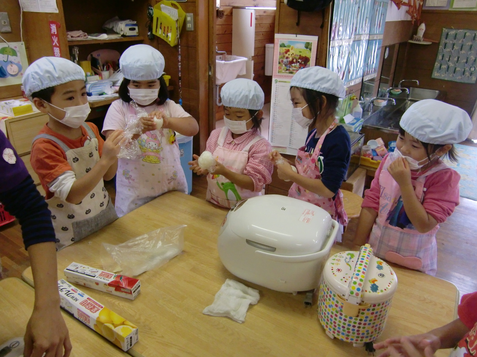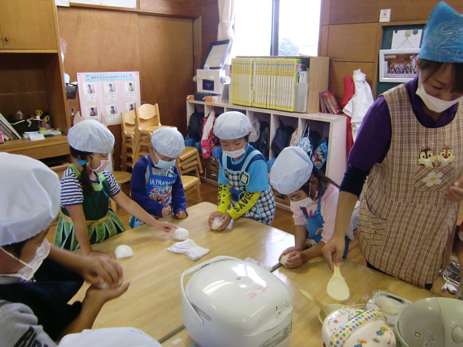 炊きたてのご飯にお塩を入れてラップでぎゅっぎゅっ♬上手に三角ができました。給食でそらぐみさんにごちそうし、大好評。たくさんあったおかわりも、奇麗に食べるほど、自分たちで一から作ったおにぎりの味は格別のようでした。